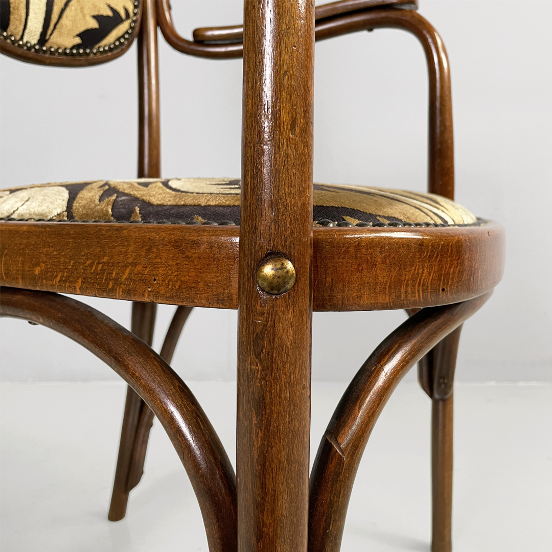 Sedia o poltrona con braccioli in legno. Lo schienale e la seduta sono imbottiti e rivestiti con un tessuto decorativo dai toni marrone e nero, con un motivo fogliato stilizzato. Lo schienale ha una leggera curvatura. Le gambe sono slanciate e leggermente ricurve, in particolare quelle posteriori che si inclinano dolcemente verso l’esterno e sono unite da traverse arcuate.