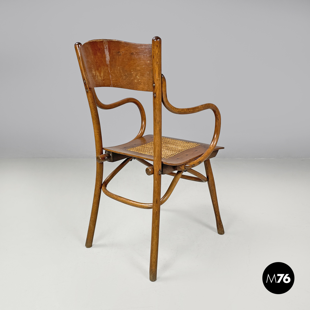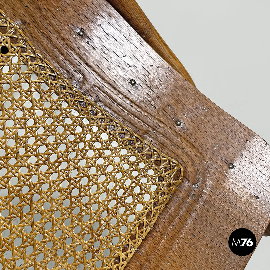 Sedia in legno con seduta in paglia di Vienna. Presenta due braccioli dalle linee curve a sezione tonda, così come le gambe. Sullo schienale sono impresse delle decorazioni che richiamano il mondo naturale, sulla seduta delle linee circondano la paglia.