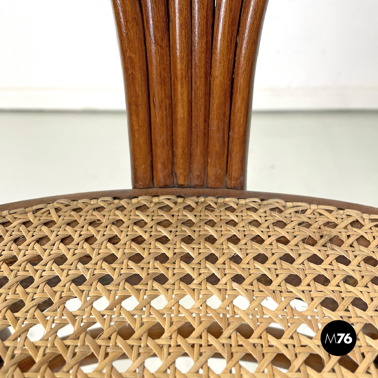 Sedia con seduta tondeggiante in paglia di Vienna. La struttura è interamente in legno a sezione tonda. Lo schienale presenta una decorazione tondeggiante a incastro che arriva fino alla seduta. Le quattro gambe sono unite da un elemento circolare appena sotto la seduta.
