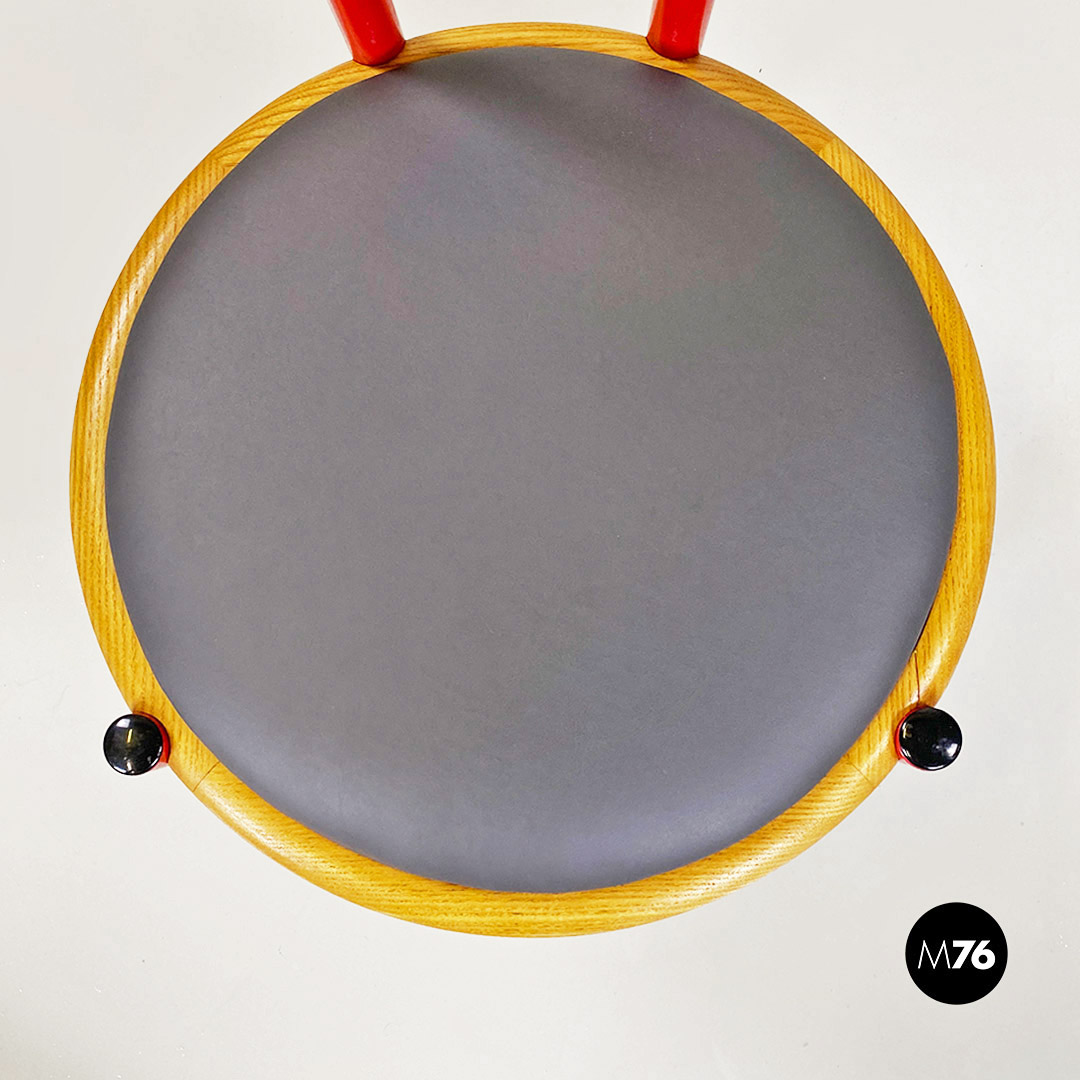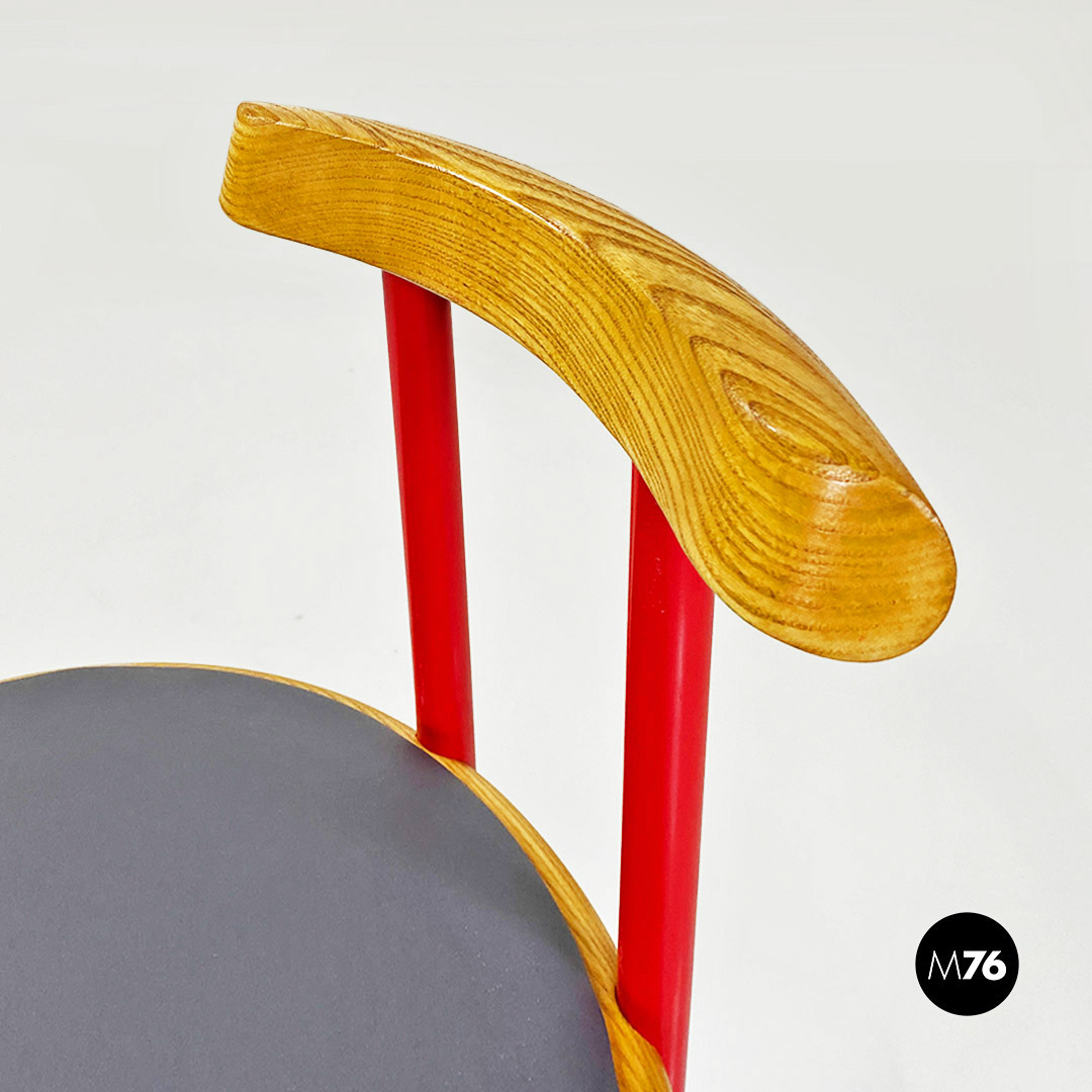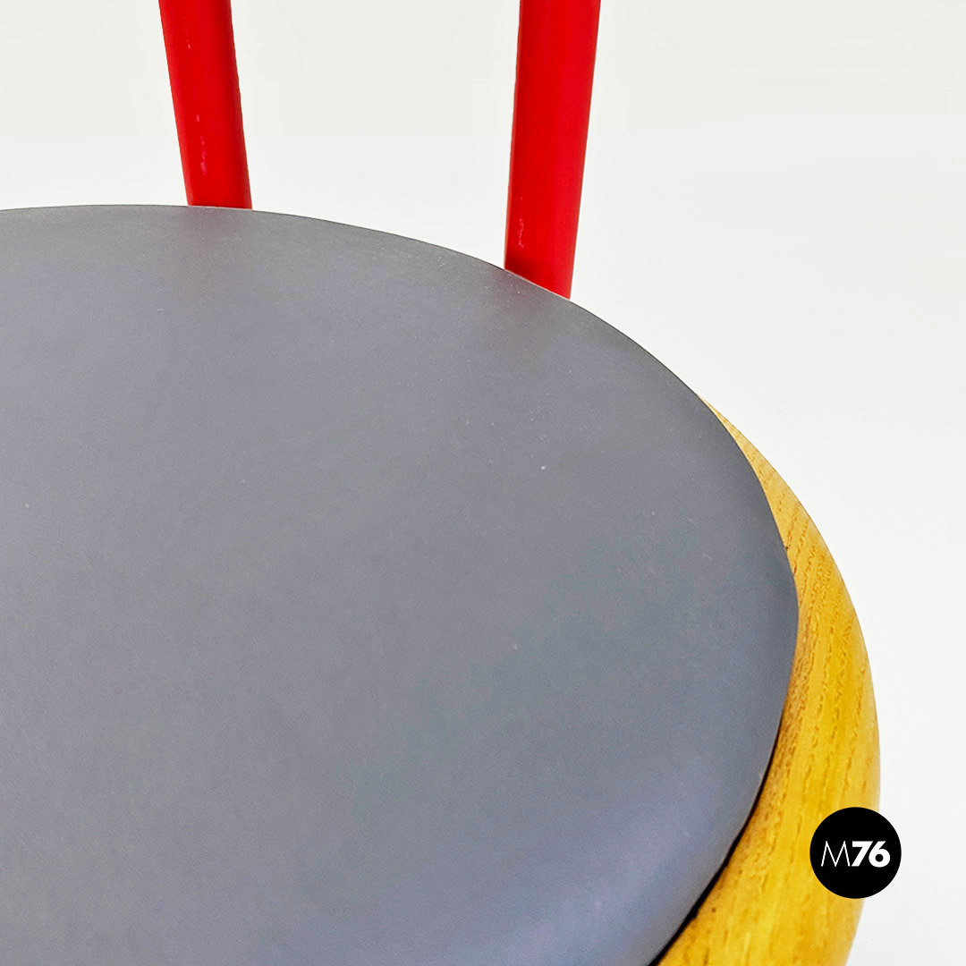 Sedia con struttura in tubolare verniciato rosso, con seduta di forma tonda in legno massello di colore chiaro, con cuscino imbottito e rivestito con nuova similpelle grigia. Schienale sempre in legno sagomato e curvato.