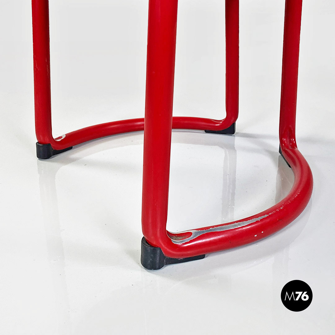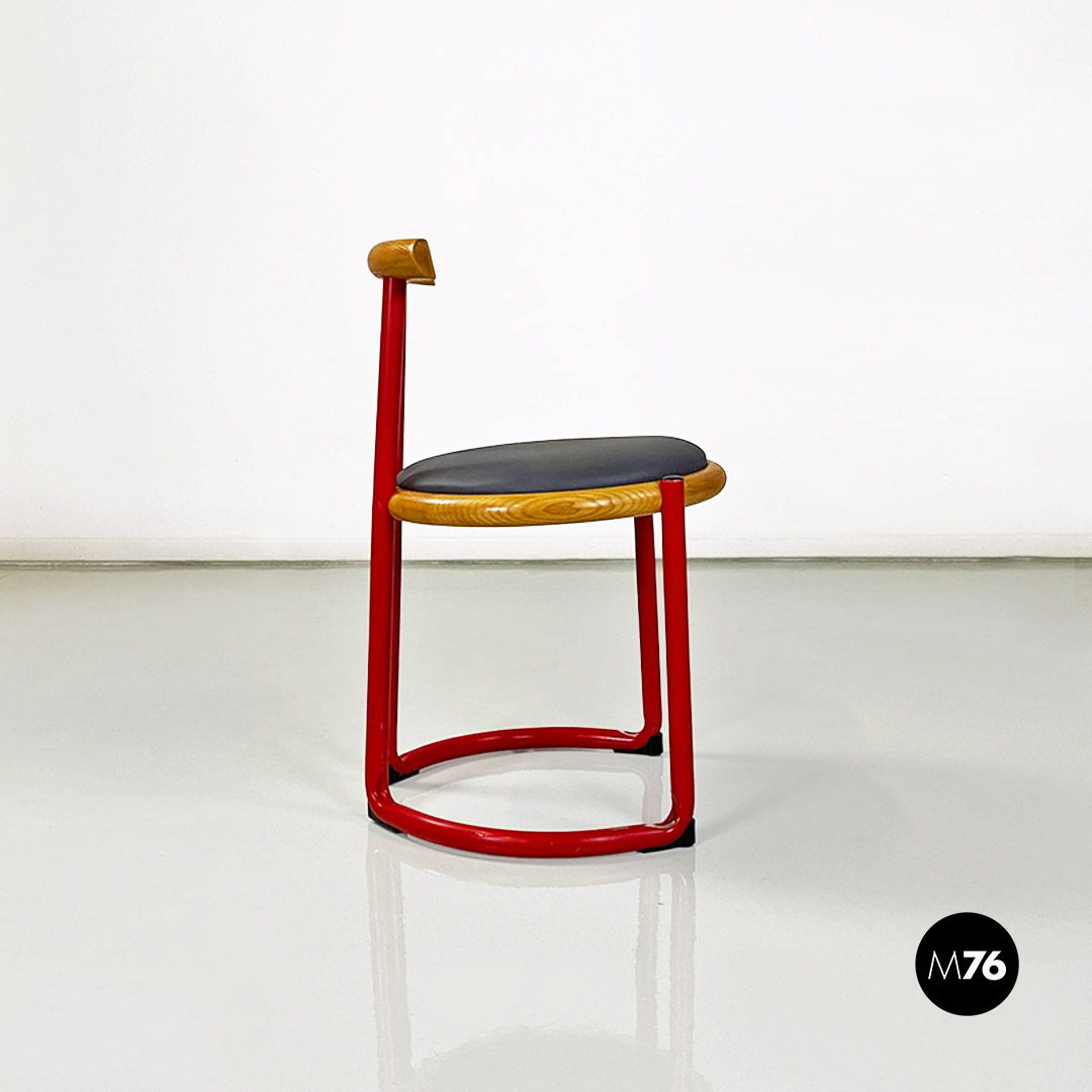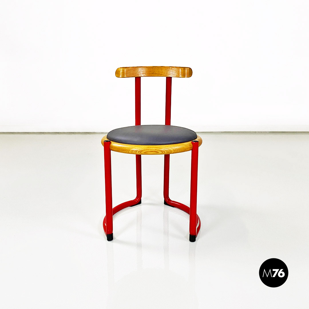 Sedia con struttura in tubolare verniciato rosso, con seduta di forma tonda in legno massello di colore chiaro, con cuscino imbottito e rivestito con nuova similpelle grigia. Schienale sempre in legno sagomato e curvato.