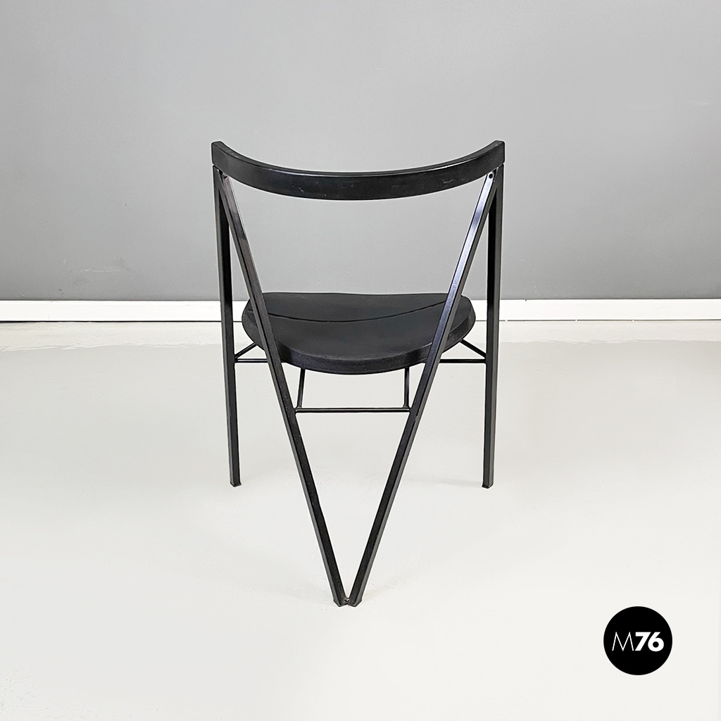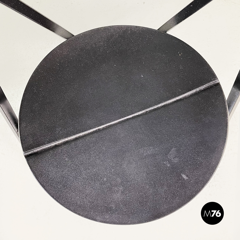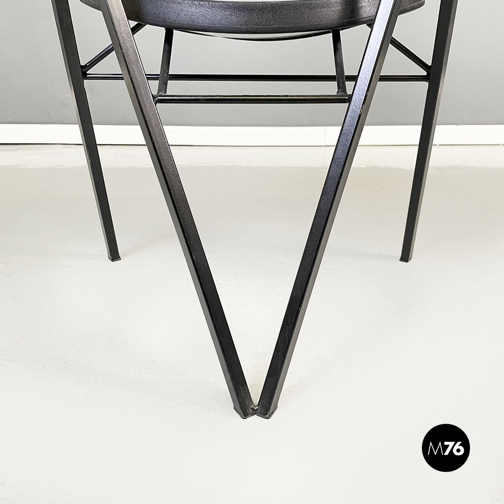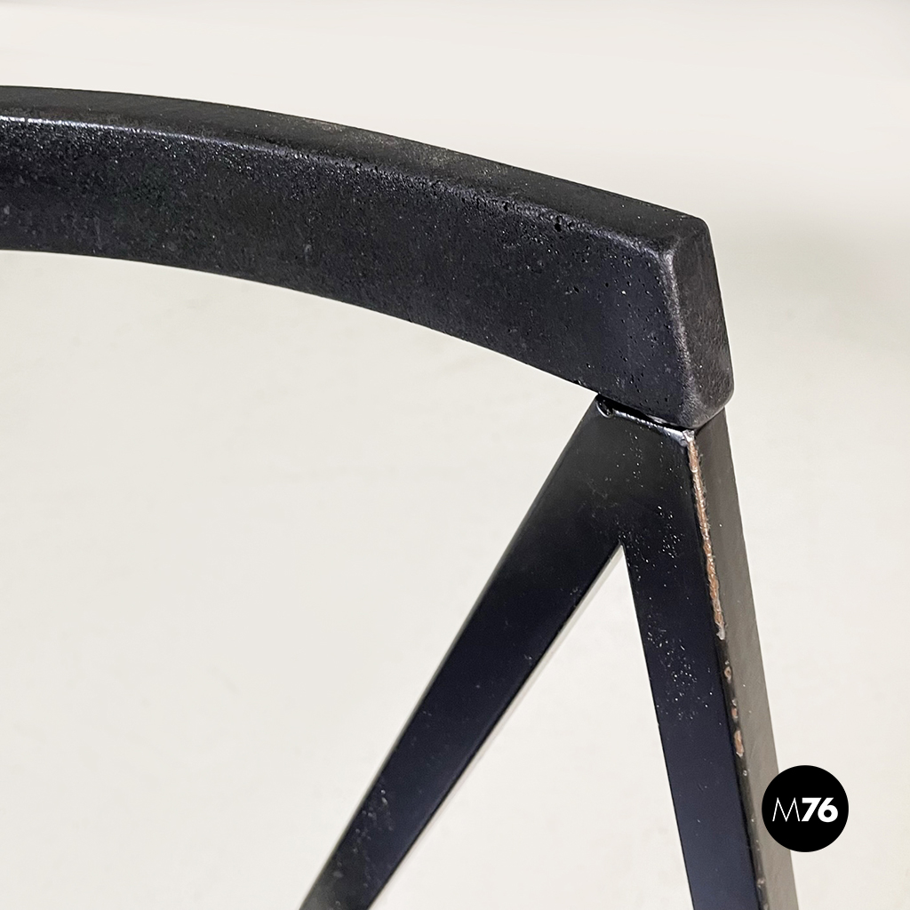 Sedia con seduta tonda in gomma nera. La struttura è a sezione quadrata in metallo verniciato nero opaco. Lo schienale curvato presenta un rivestimento in gomma nera a sezione rettangolare. Le zampe posteriori tendono ad avvicinarsi verso la base, dando allo schienale una forma triangolare.