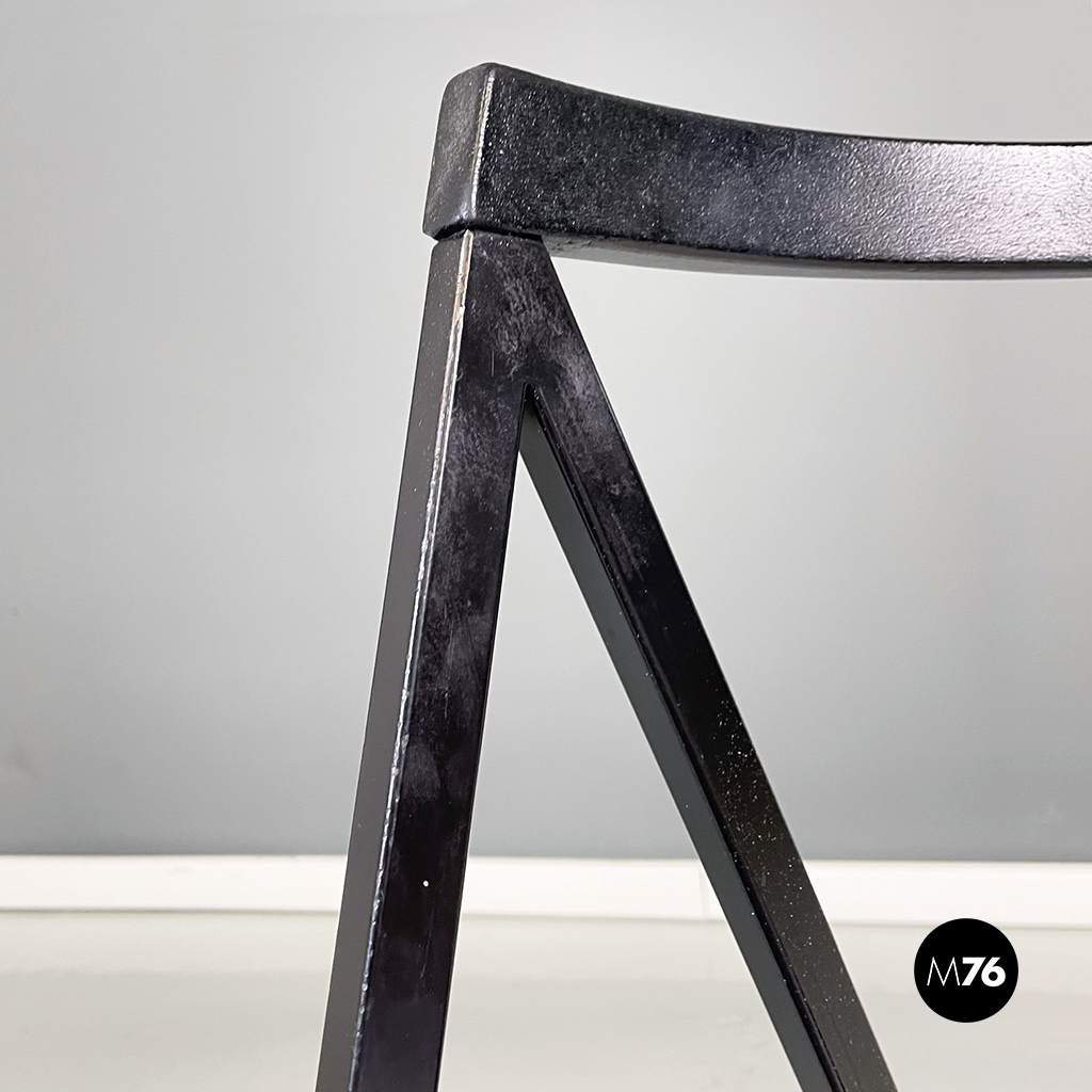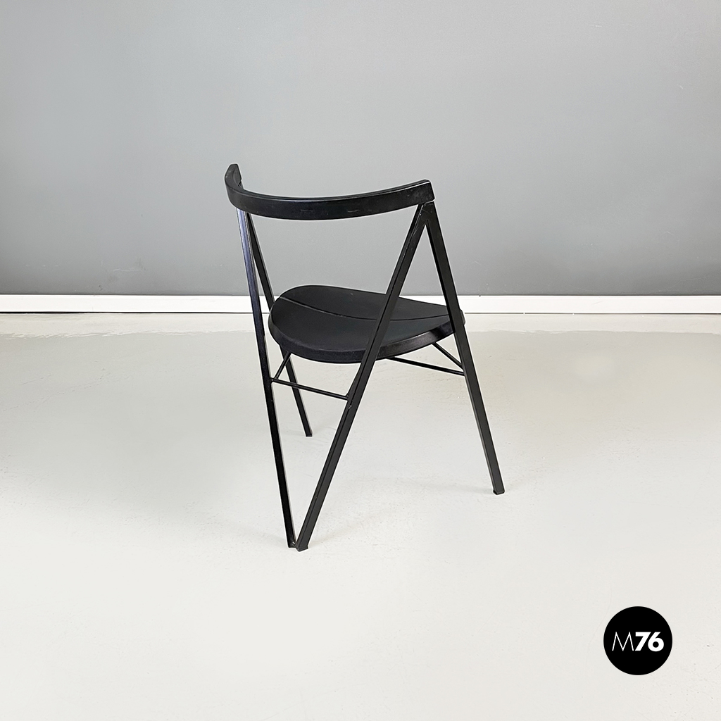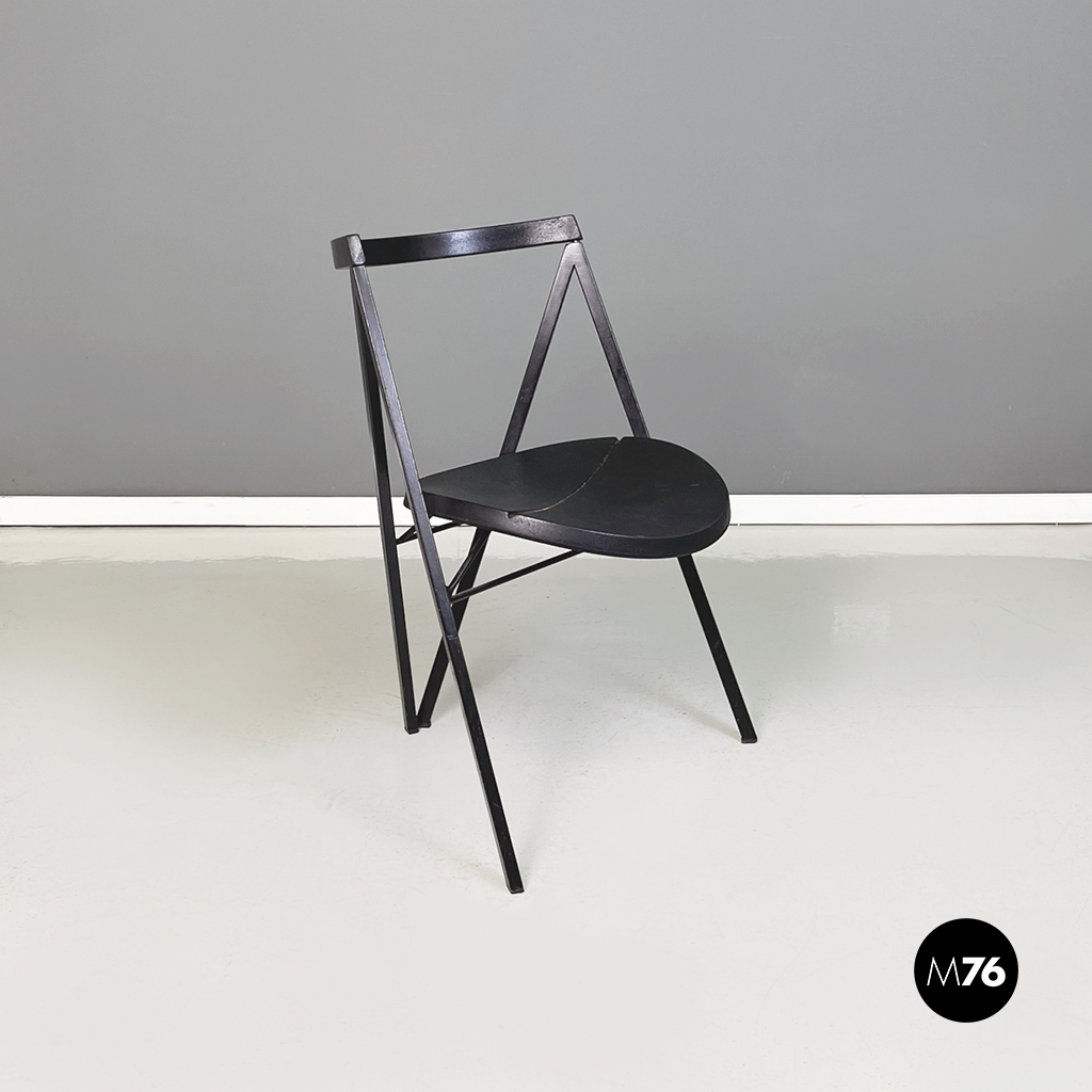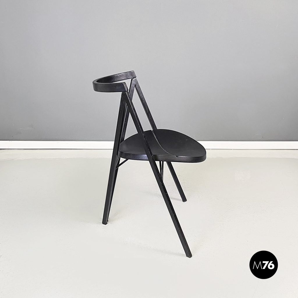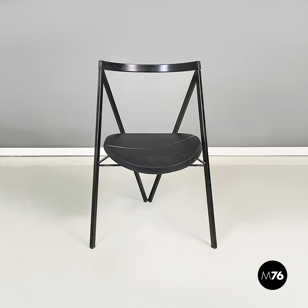 Sedia con seduta tonda in gomma nera. La struttura è a sezione quadrata in metallo verniciato nero opaco. Lo schienale curvato presenta un rivestimento in gomma nera a sezione rettangolare. Le zampe posteriori tendono ad avvicinarsi verso la base, dando allo schienale una forma triangolare.