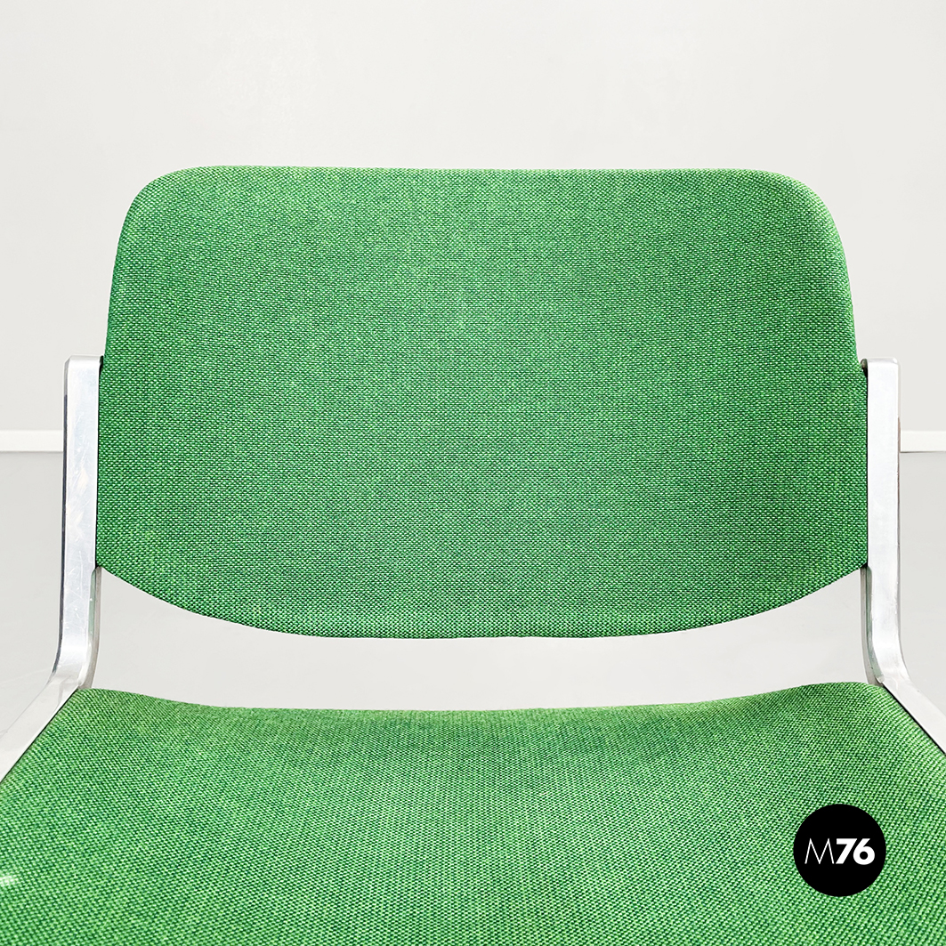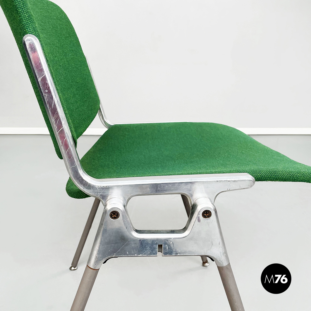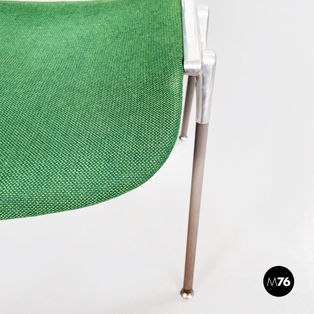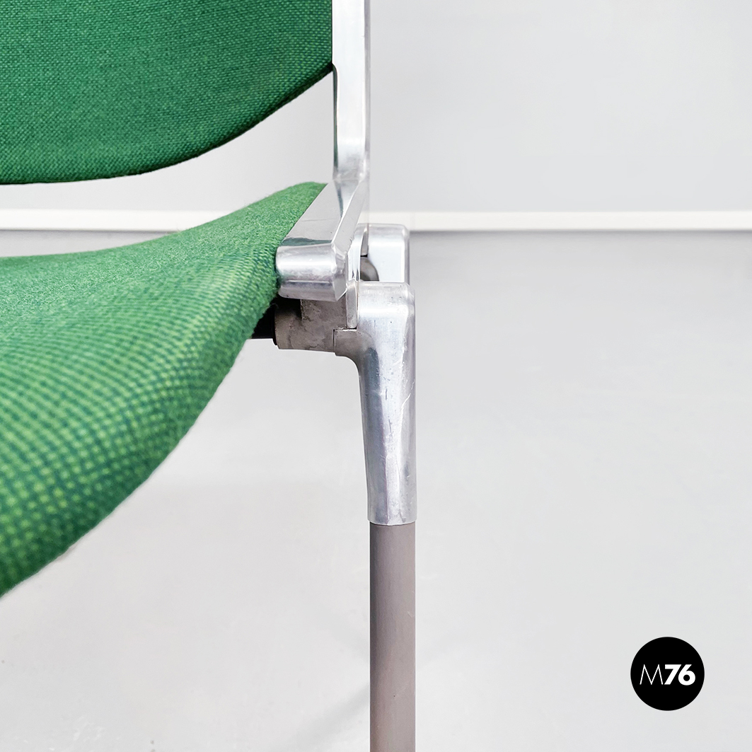 Sedia modello DSC con seduta e schienale di forma stondata e rivestiti in tessuto verde brillante. La struttura robusta è in allumininio con gambe a sezione tonda rivestite in plastica grigia.