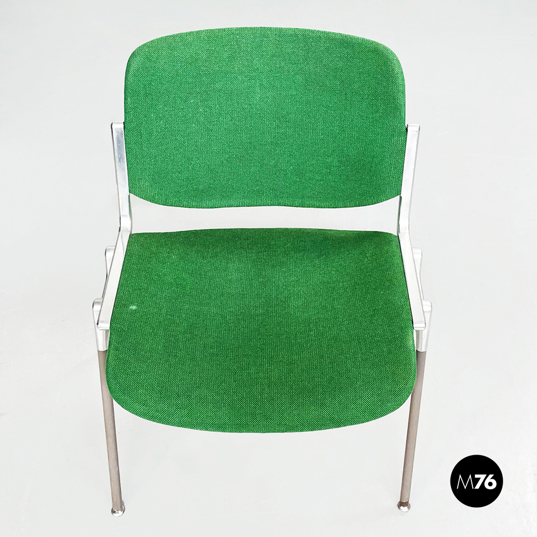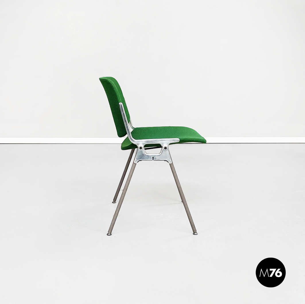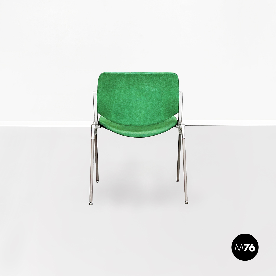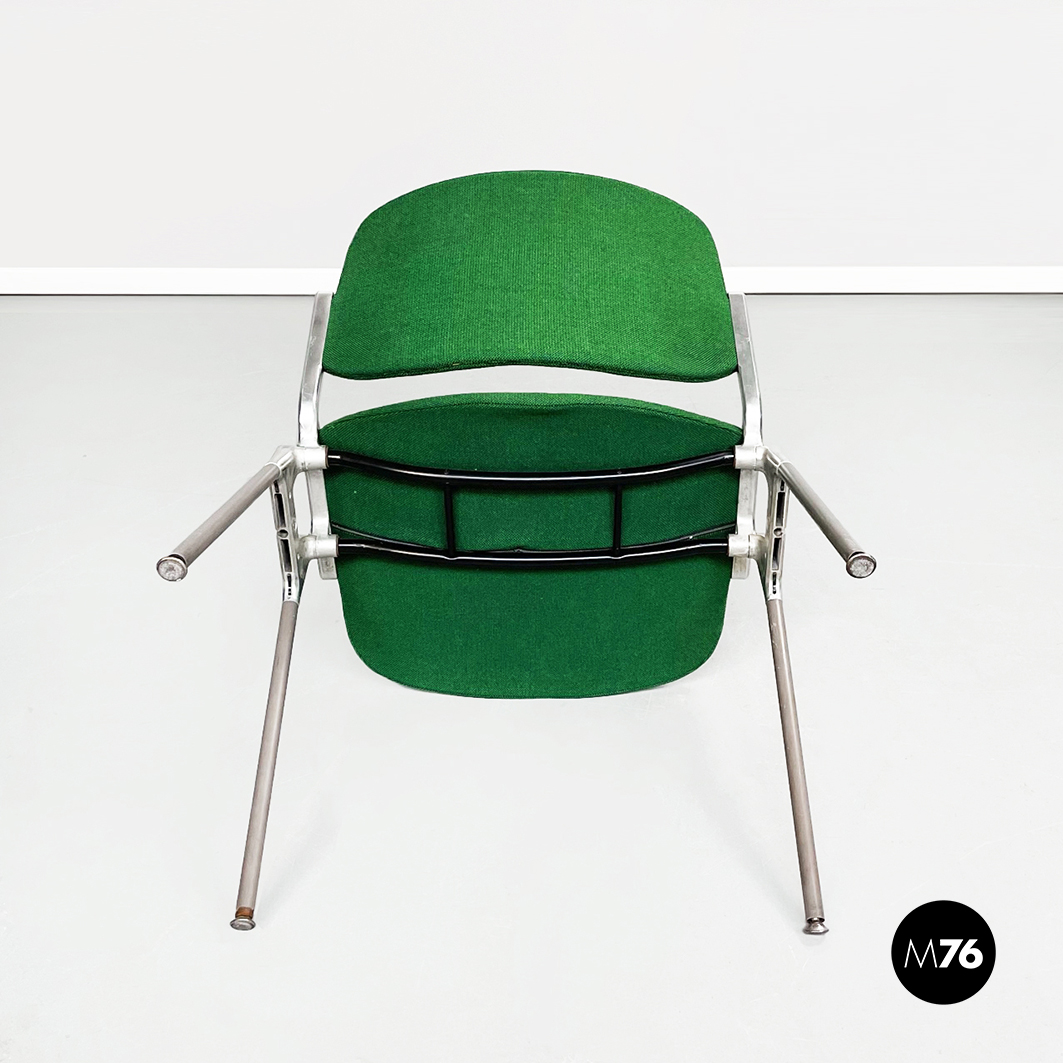 Sedia modello DSC con seduta e schienale di forma stondata e rivestiti in tessuto verde brillante. La struttura robusta è in allumininio con gambe a sezione tonda rivestite in plastica grigia.