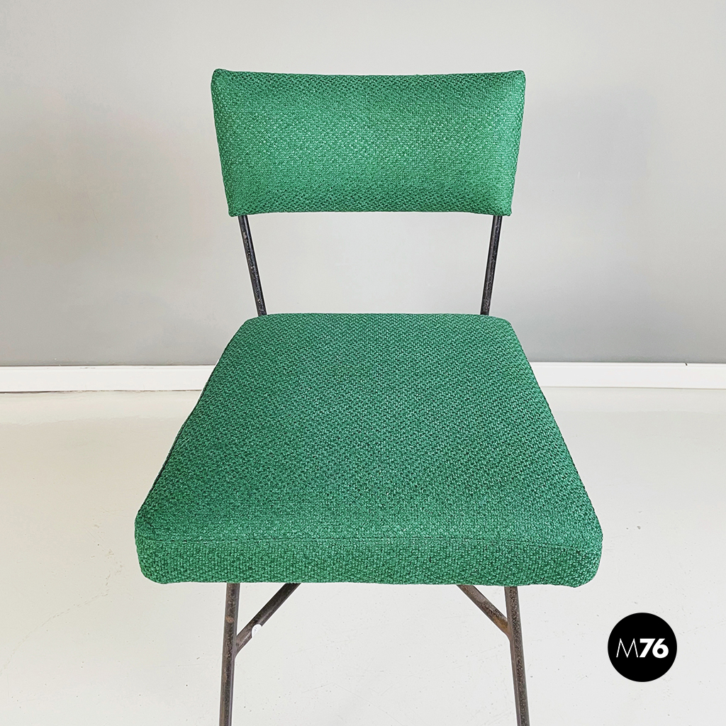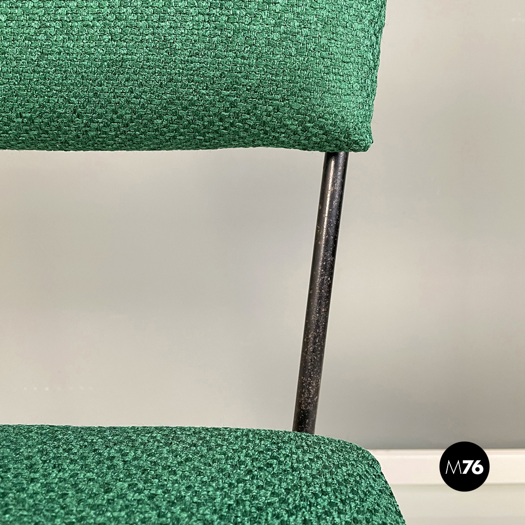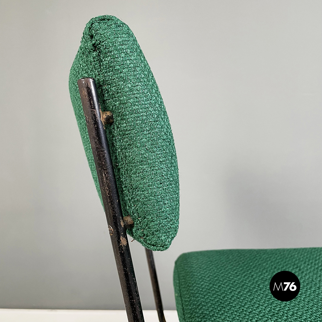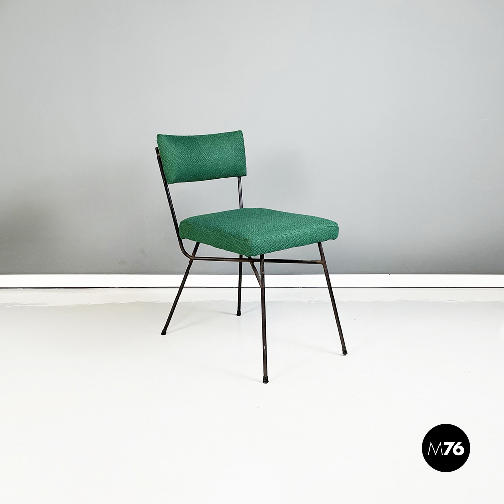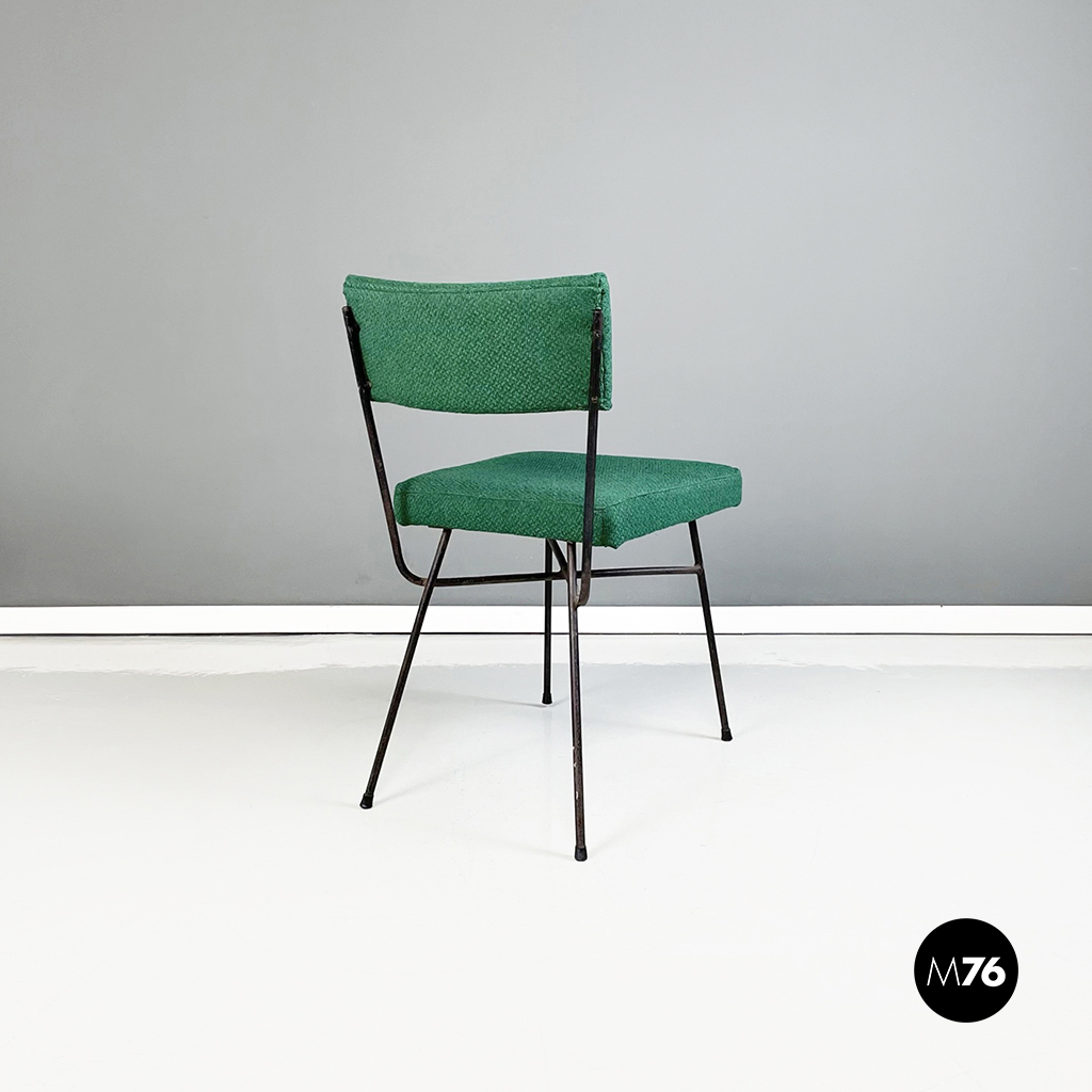 Sedia modello Elettra con seduta squadrata e schienale rettangolare incurvato in tessuto verde bosco. La struttura è in tondino di metallo verniciato nero.