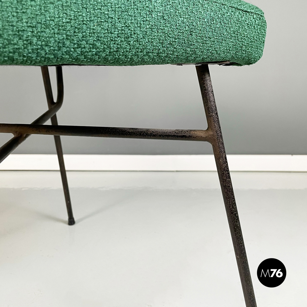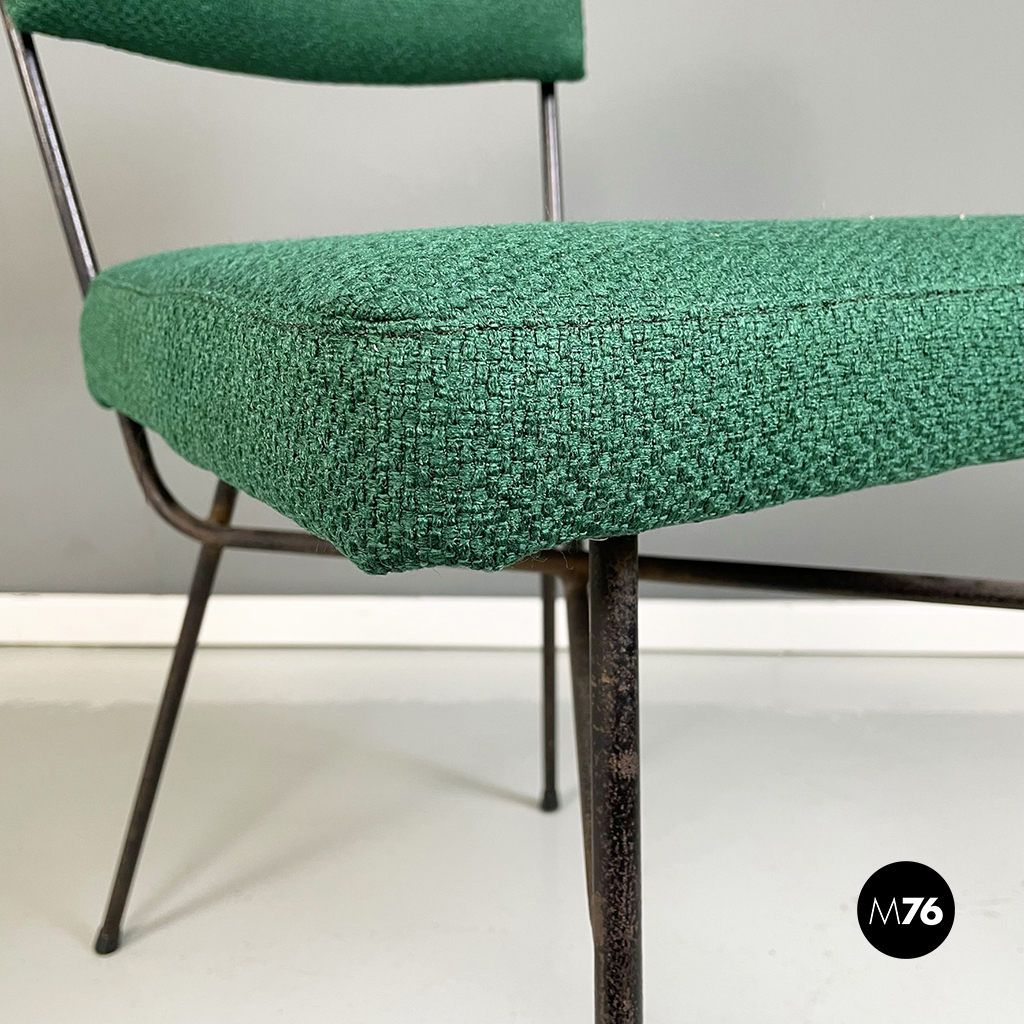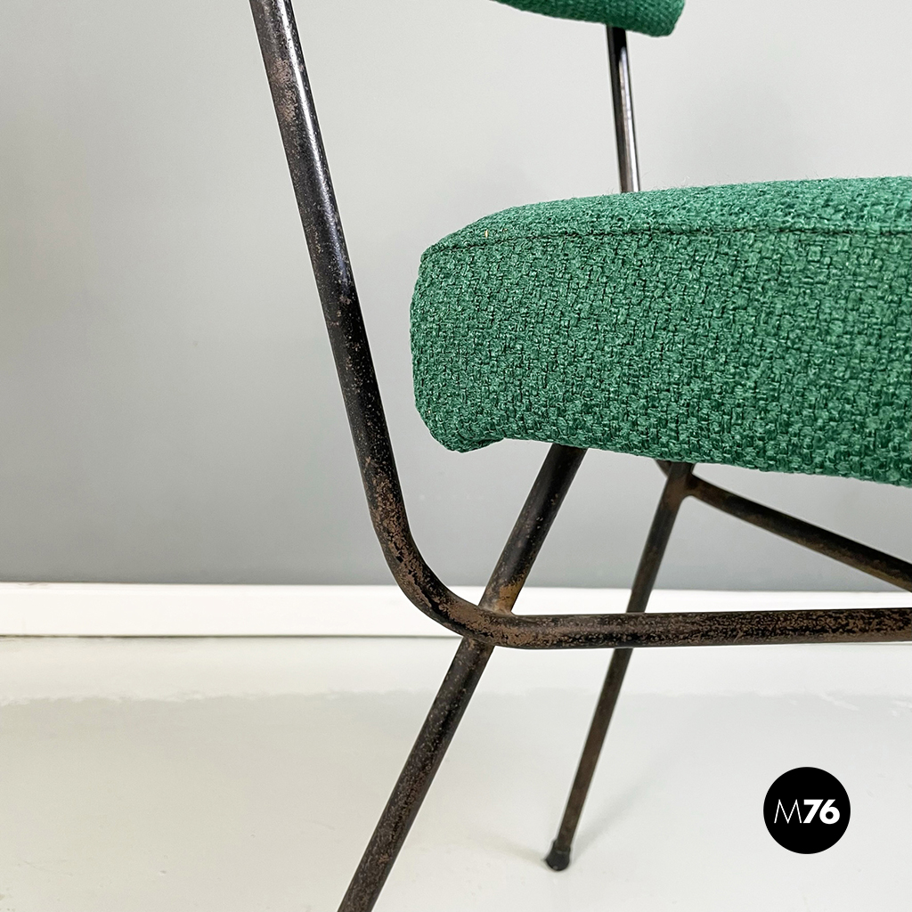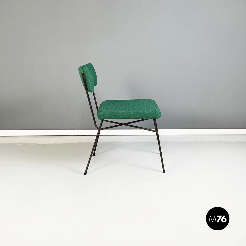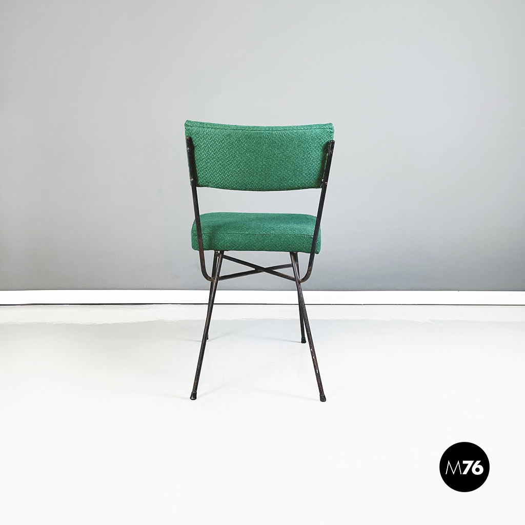 Sedia modello Elettra con seduta squadrata e schienale rettangolare incurvato in tessuto verde bosco. La struttura è in tondino di metallo verniciato nero.