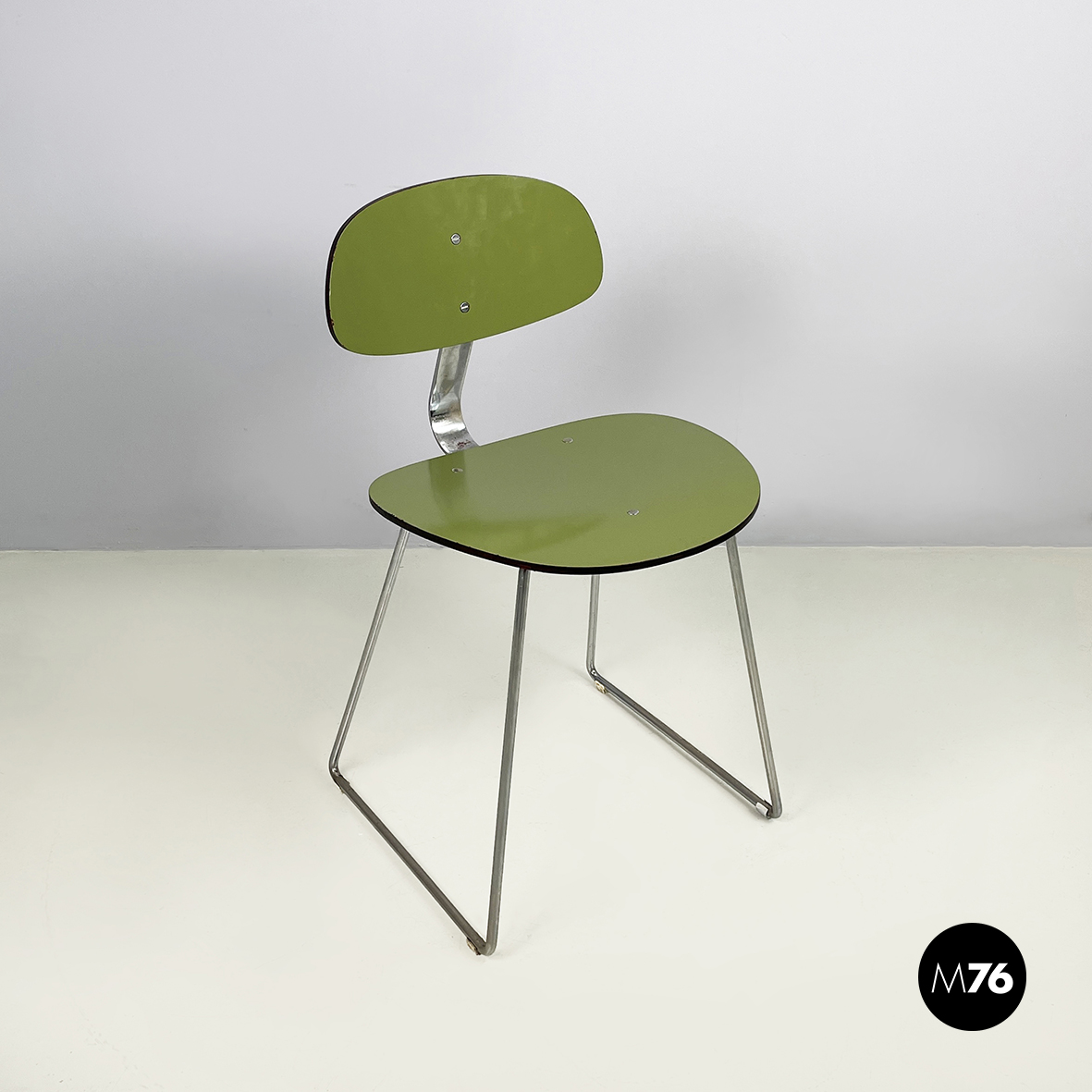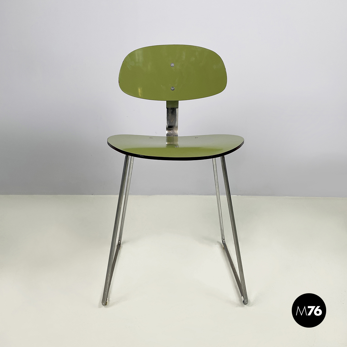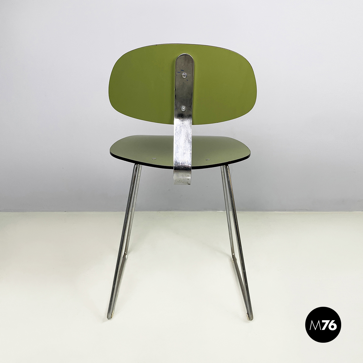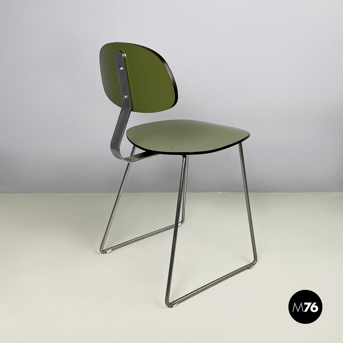 Sedia con seduta e schienale tondeggianti e sagomati in formica verde con profili neri. Lo schienale è collegato alla seduta grazie a una sottile lastra curvata in metallo cromato. Zampe squadrate in tondino di metallo cromato.