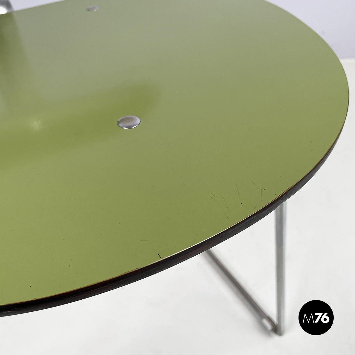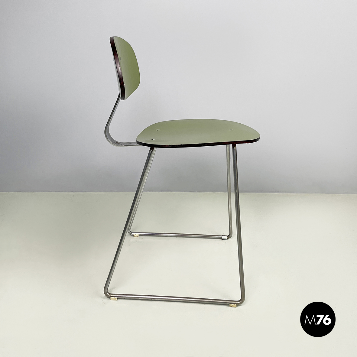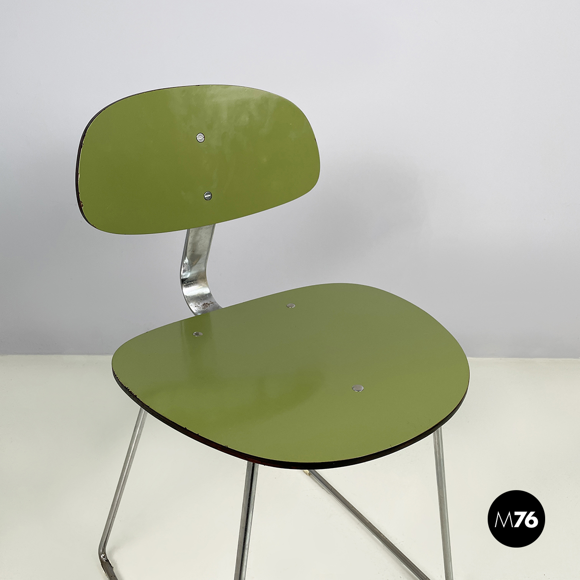 Sedia con seduta e schienale tondeggianti e sagomati in formica verde con profili neri. Lo schienale è collegato alla seduta grazie a una sottile lastra curvata in metallo cromato. Zampe squadrate in tondino di metallo cromato.