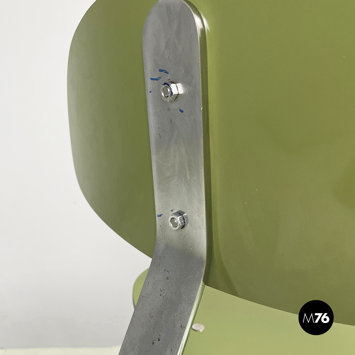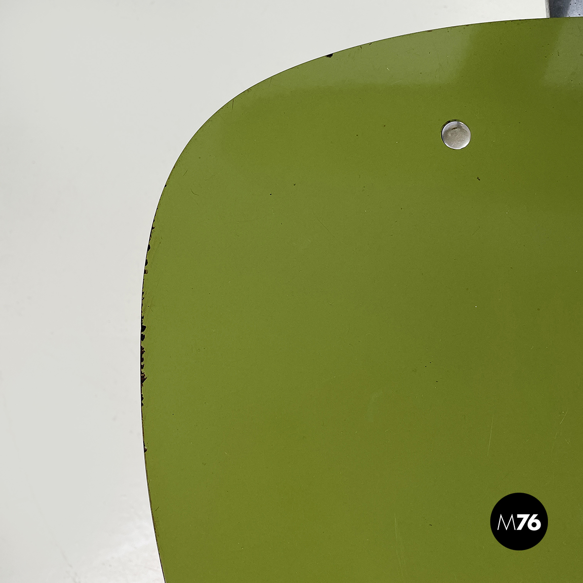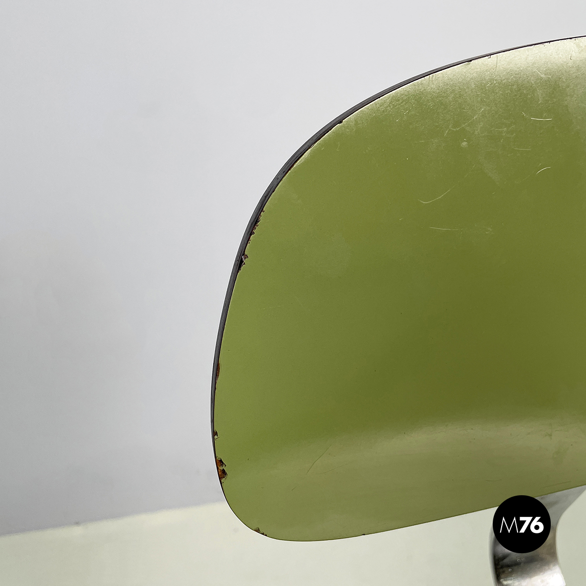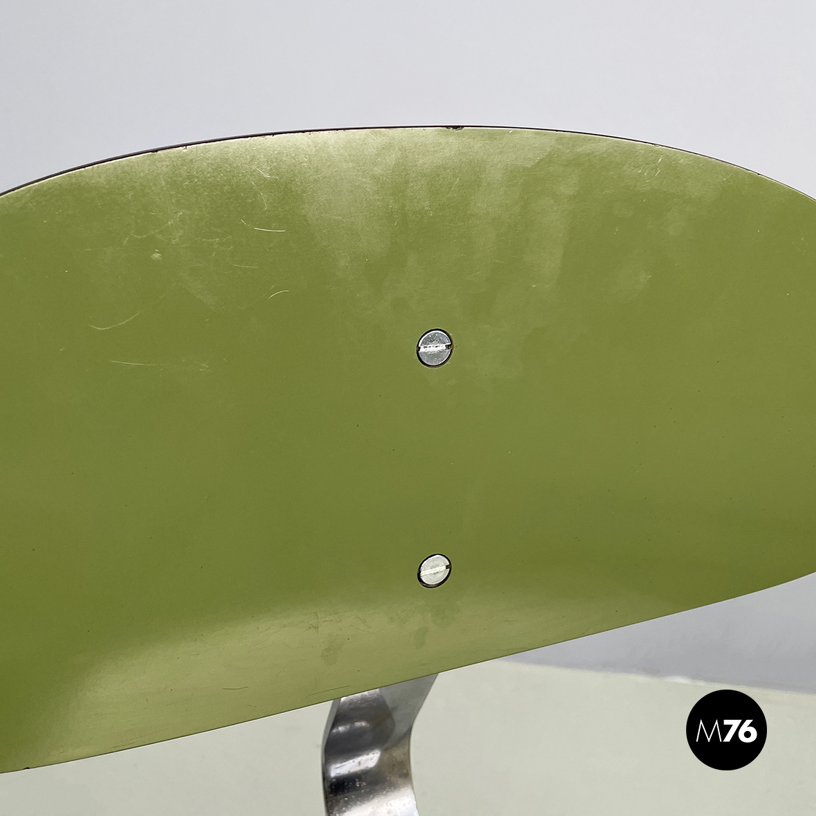 Sedia con seduta e schienale tondeggianti e sagomati in formica verde con profili neri. Lo schienale è collegato alla seduta grazie a una sottile lastra curvata in metallo cromato. Zampe squadrate in tondino di metallo cromato.