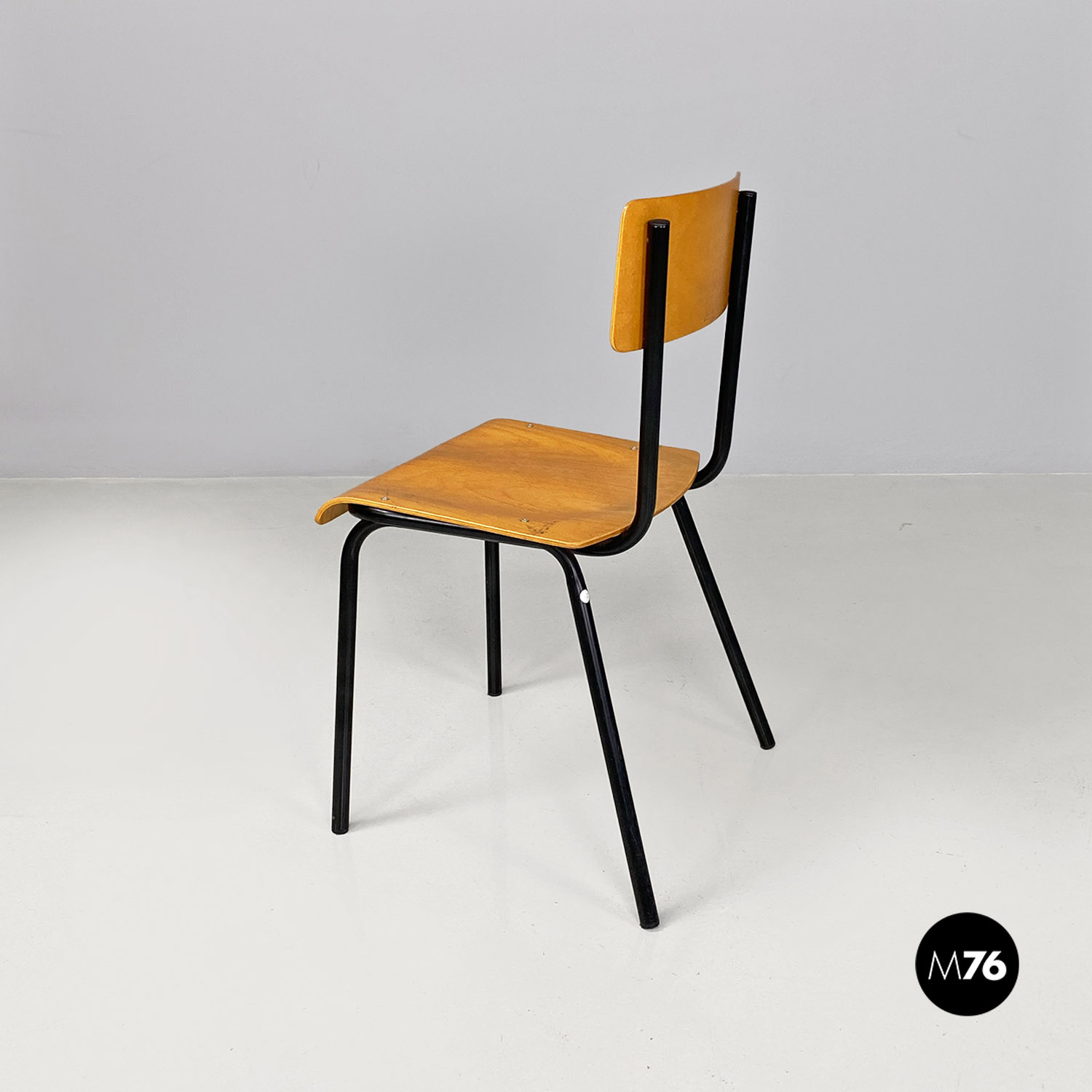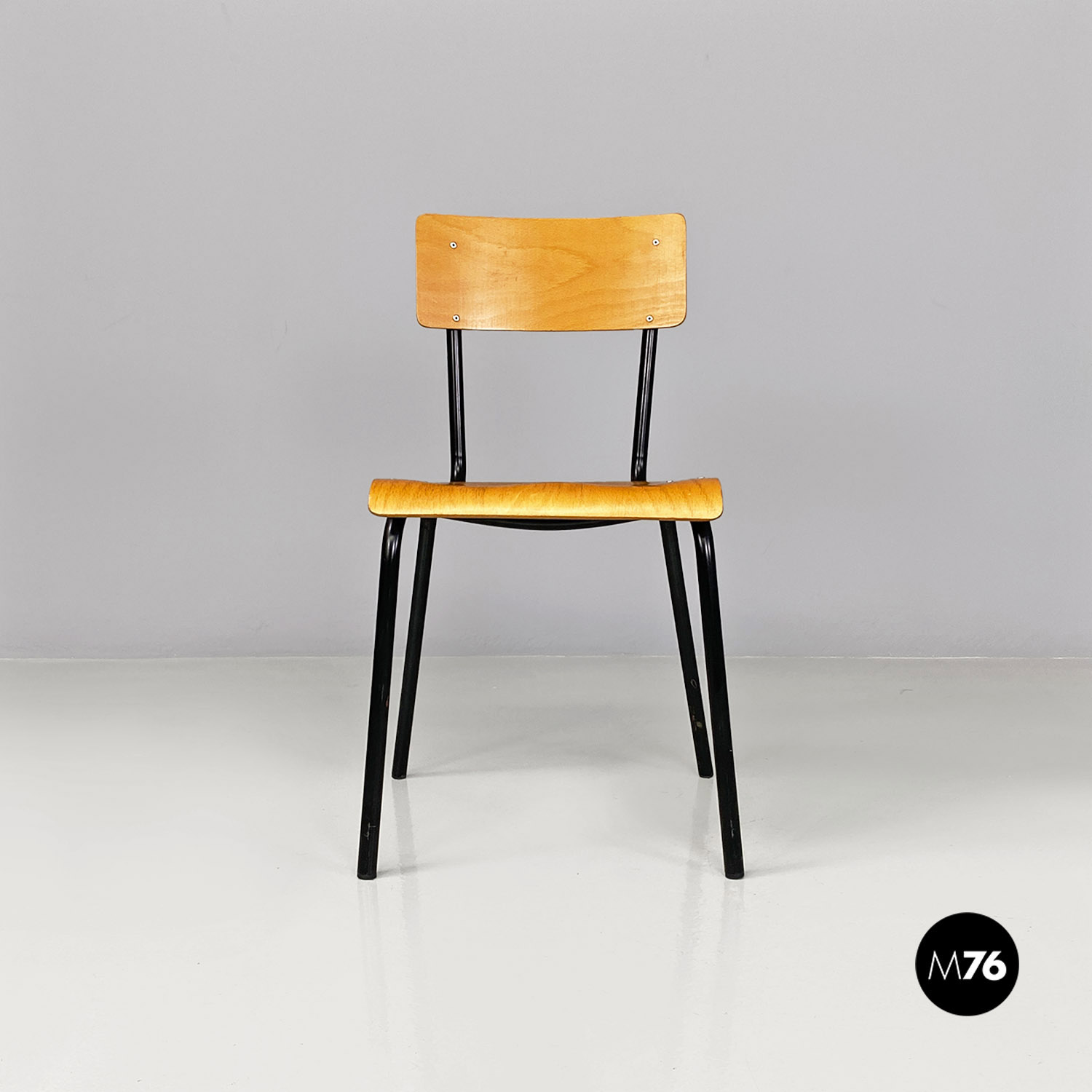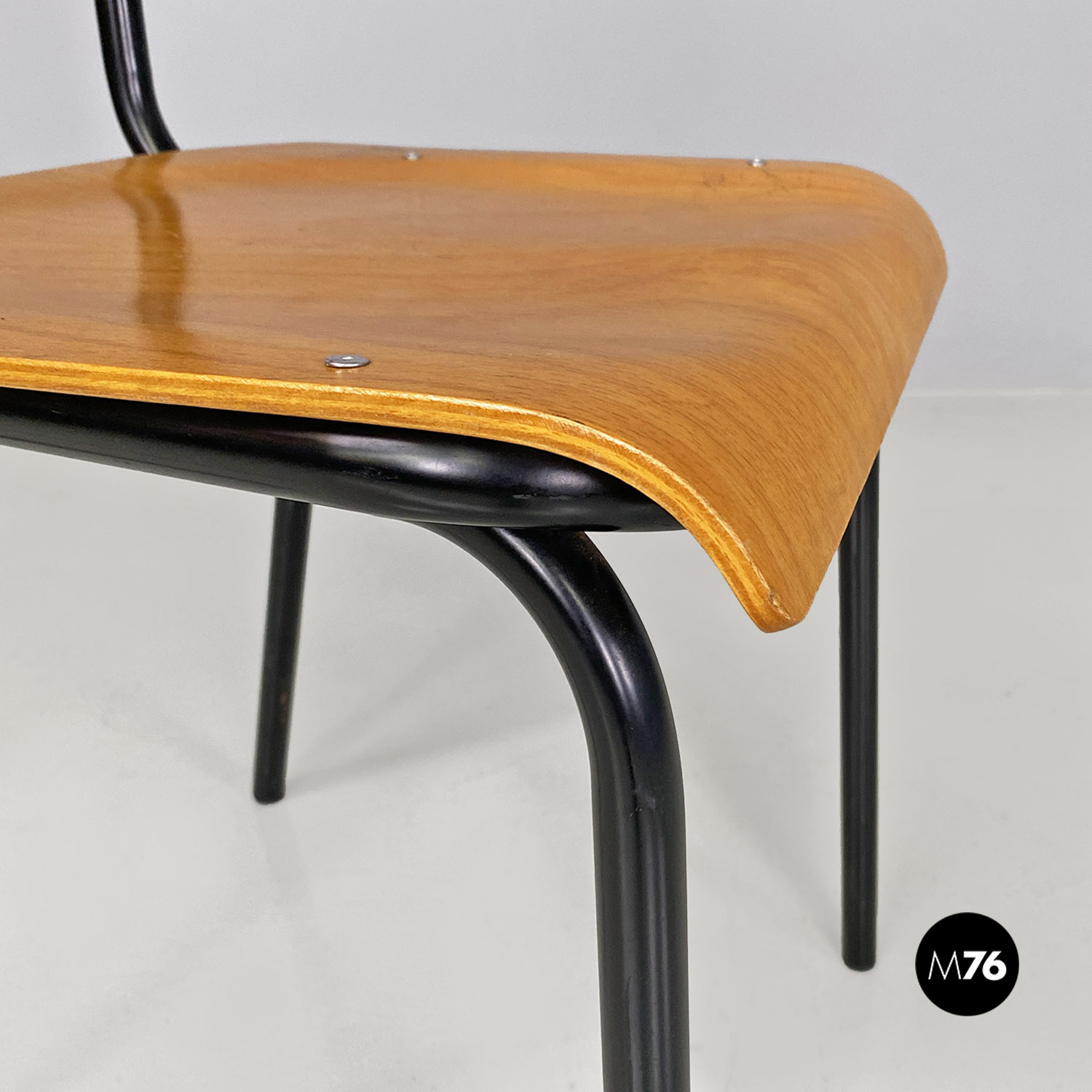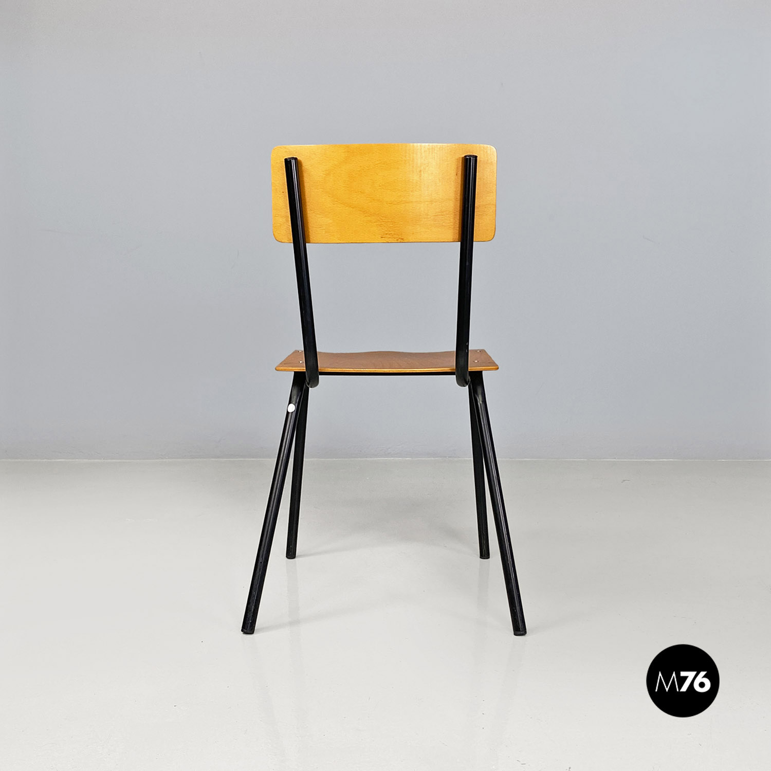 Sedia con seduta e schienale in legno di faggio con struttura in tondino di metallo nero.