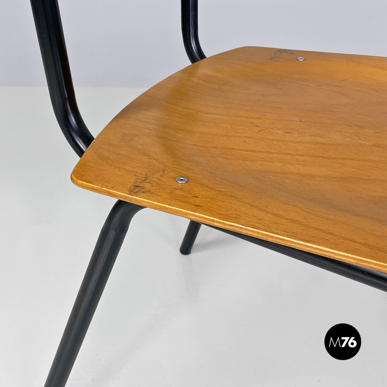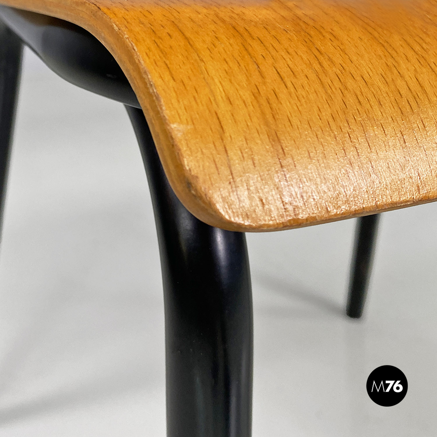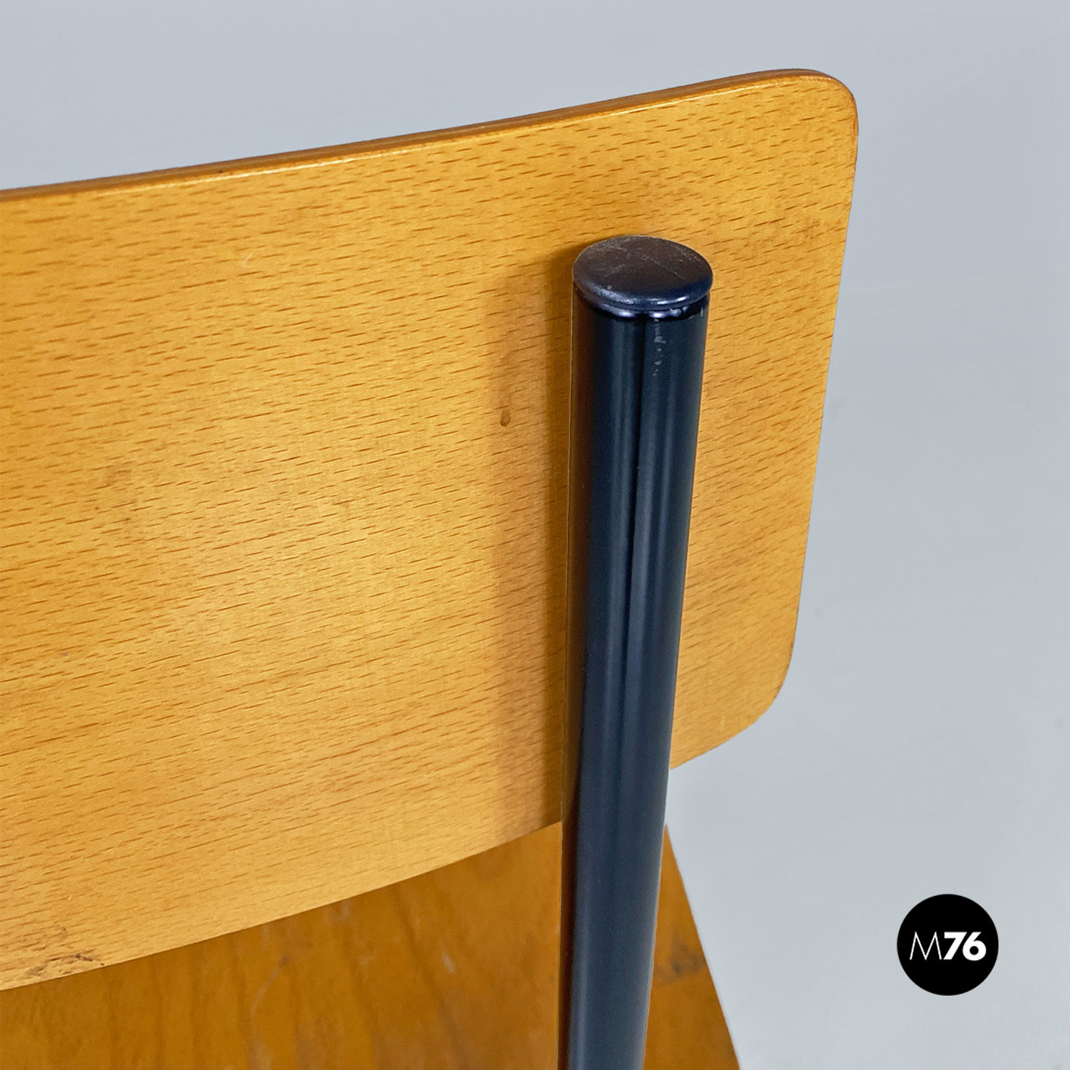 Sedia con seduta e schienale in legno di faggio con struttura in tondino di metallo nero.