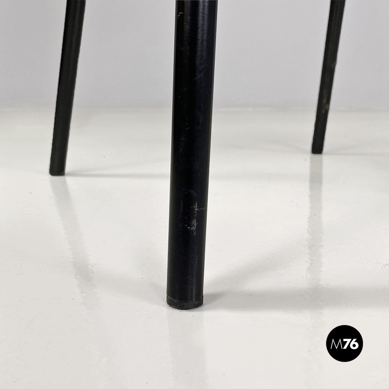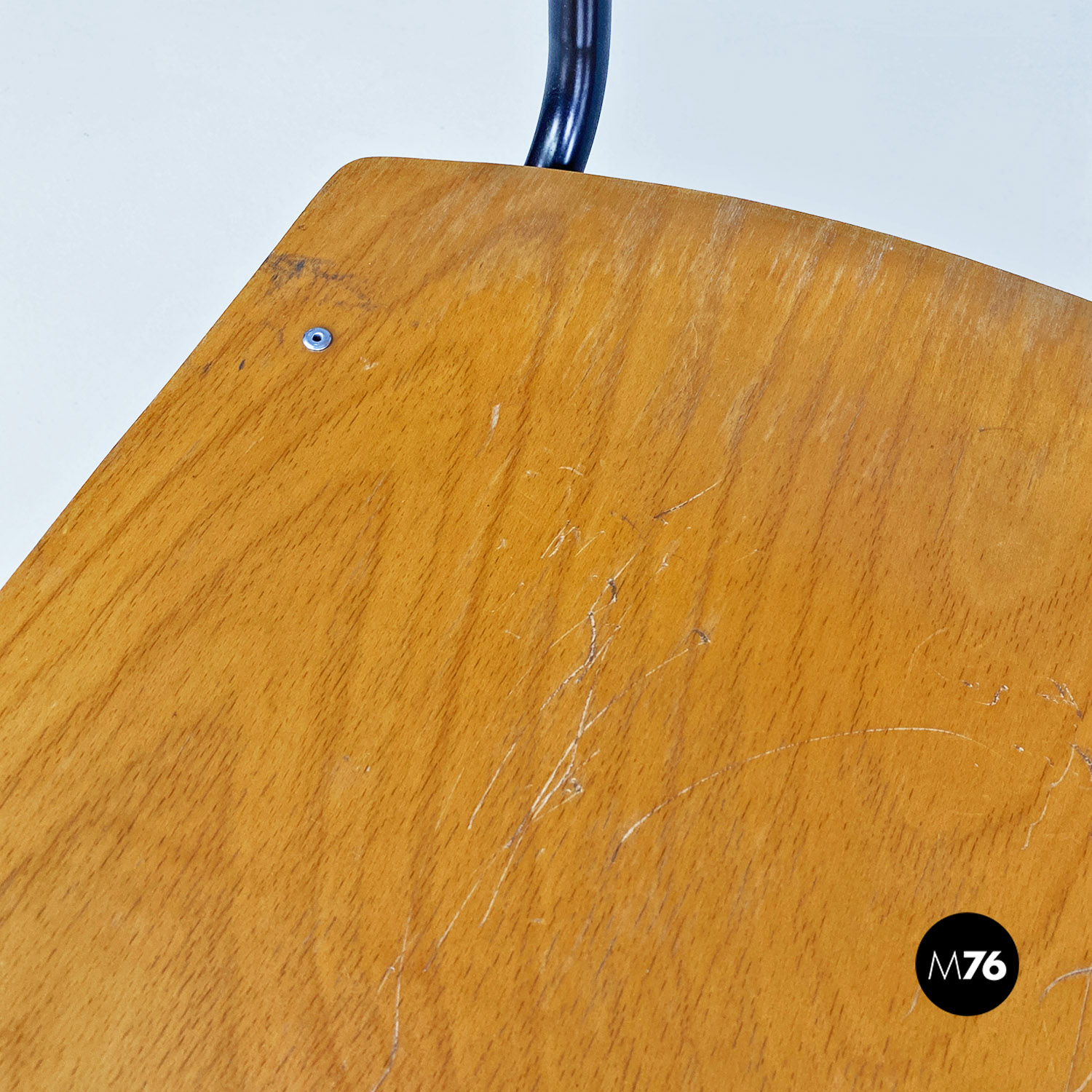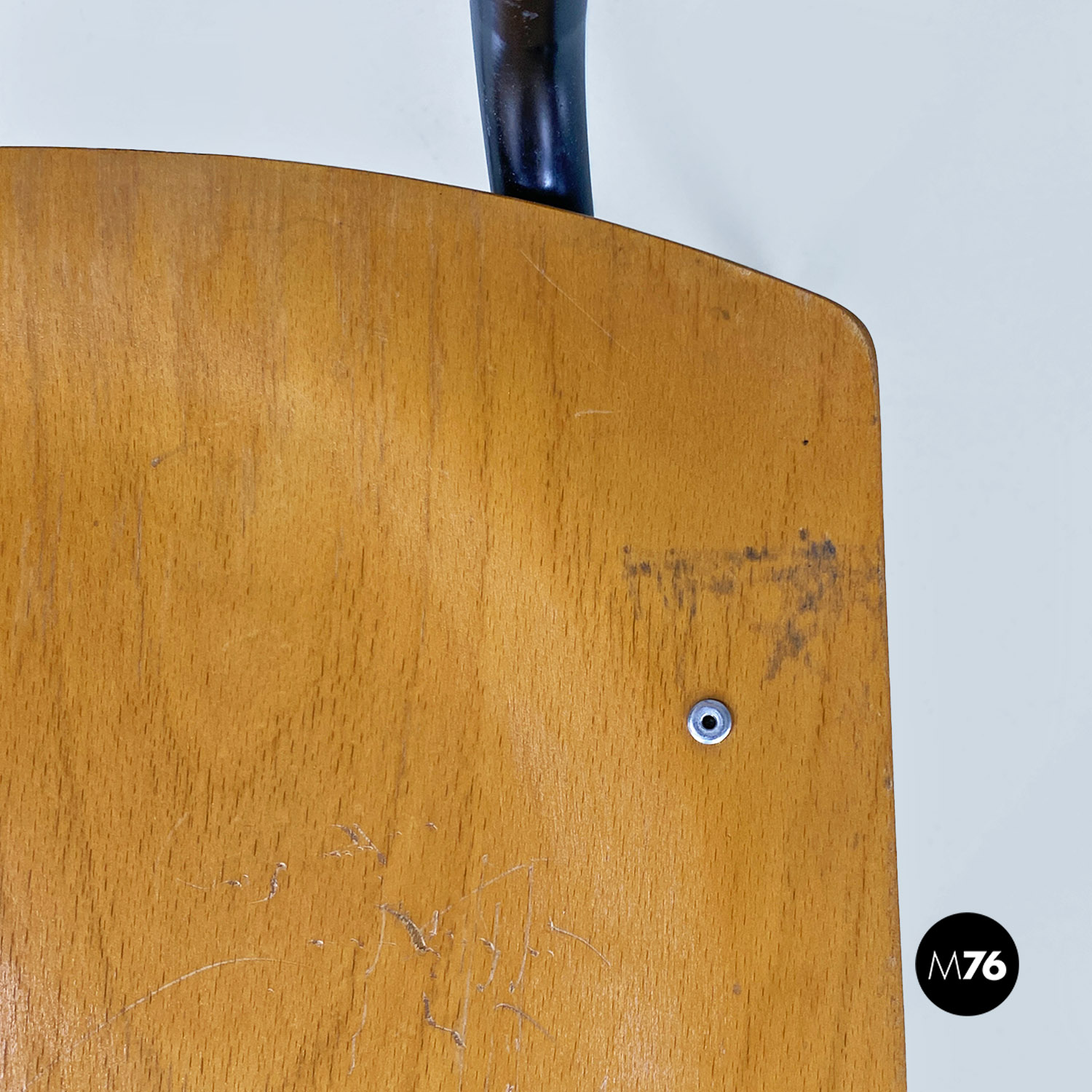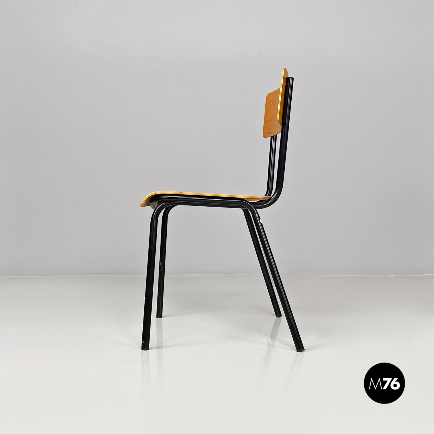 Sedia con seduta e schienale in legno di faggio con struttura in tondino di metallo nero.