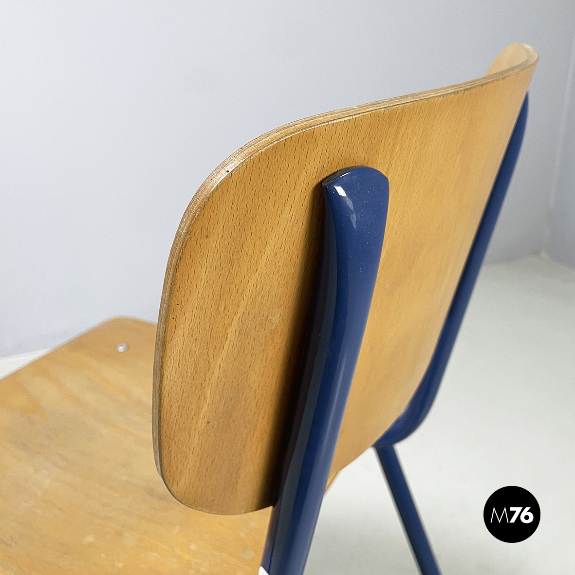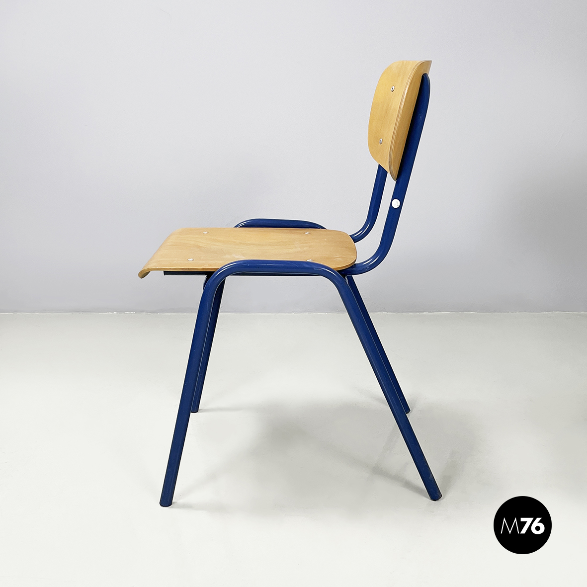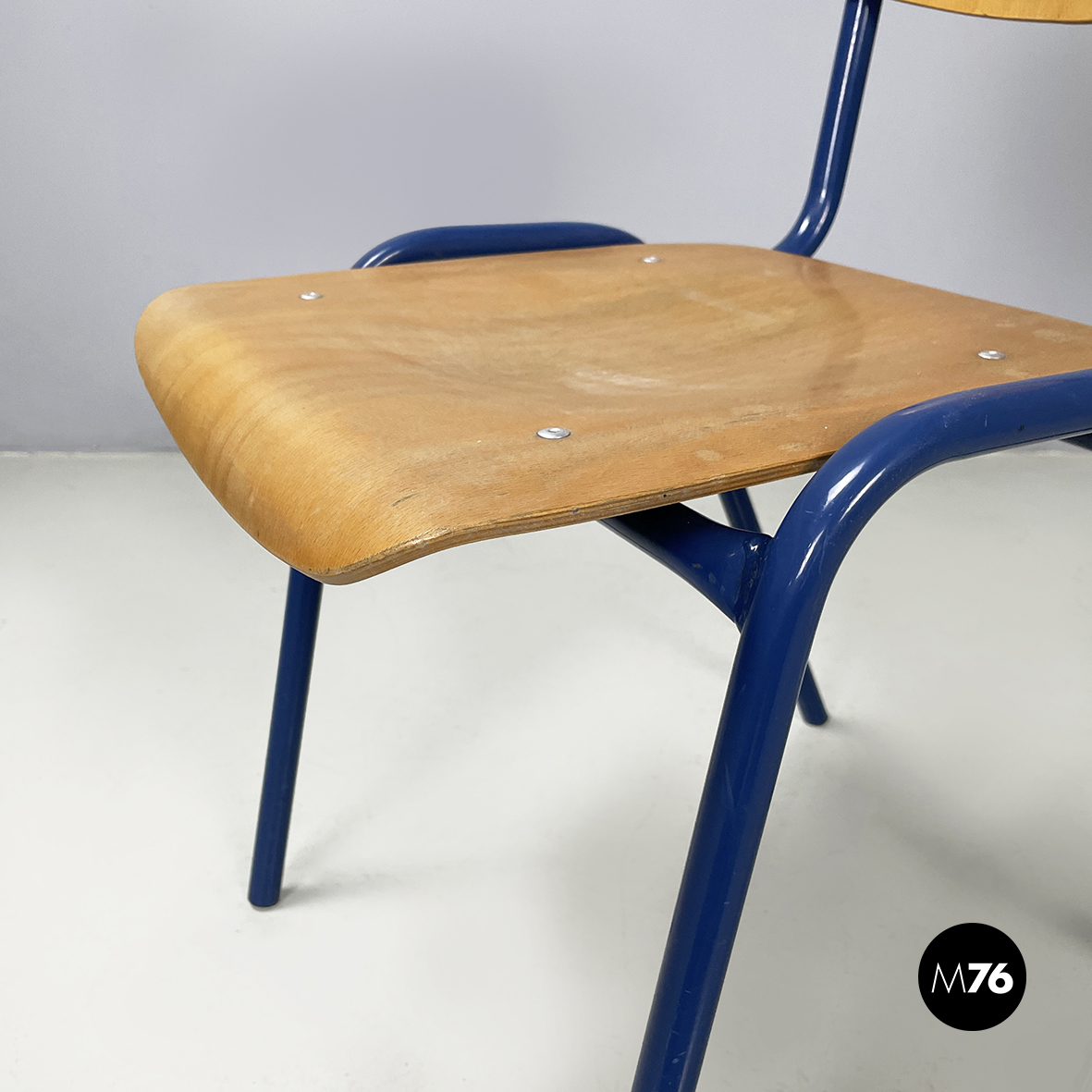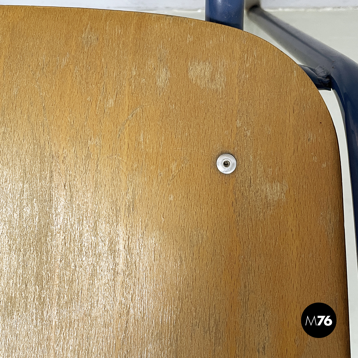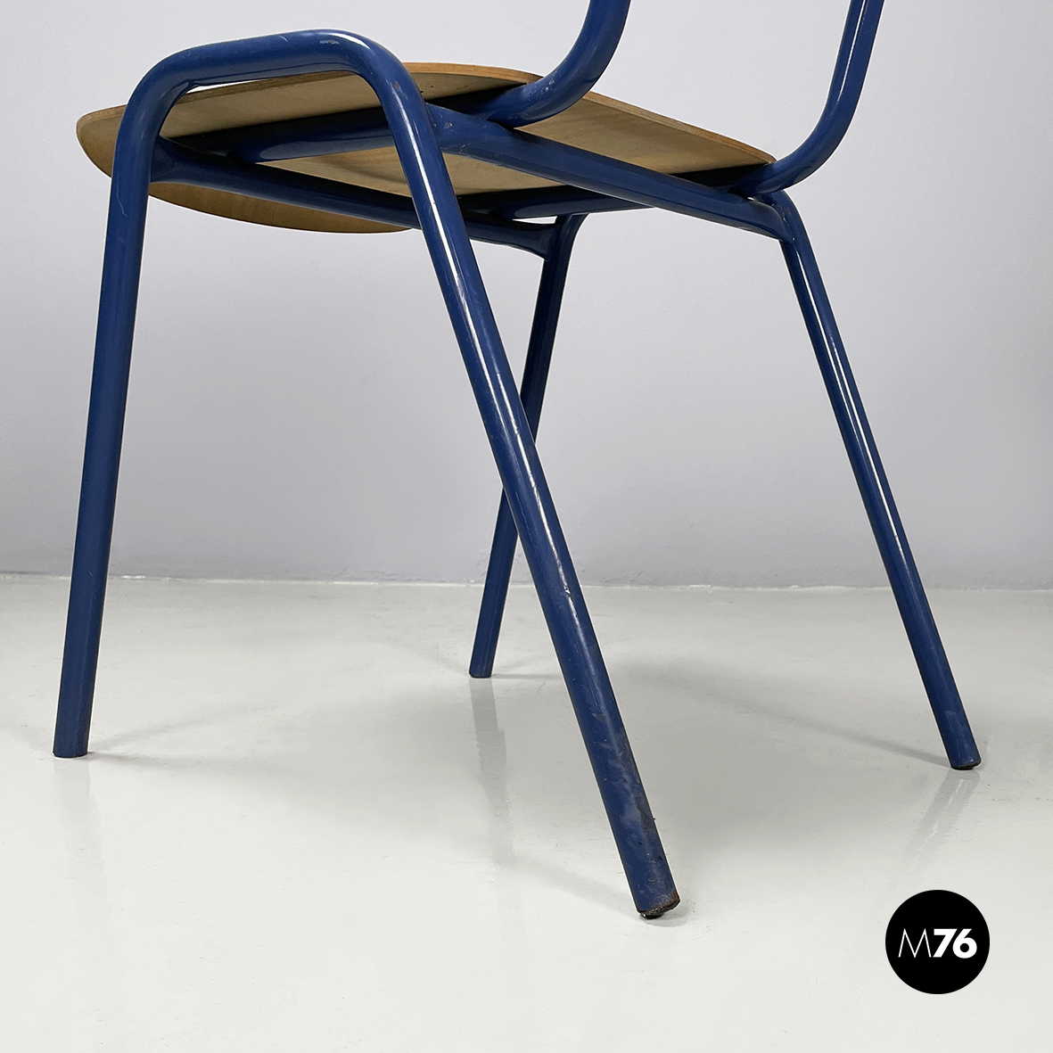 Sedia con seduta e schienale ad angoli arrotondati in legno chiaro. La struttura e le zampe sono in tubolare di metallo verniciato blu.