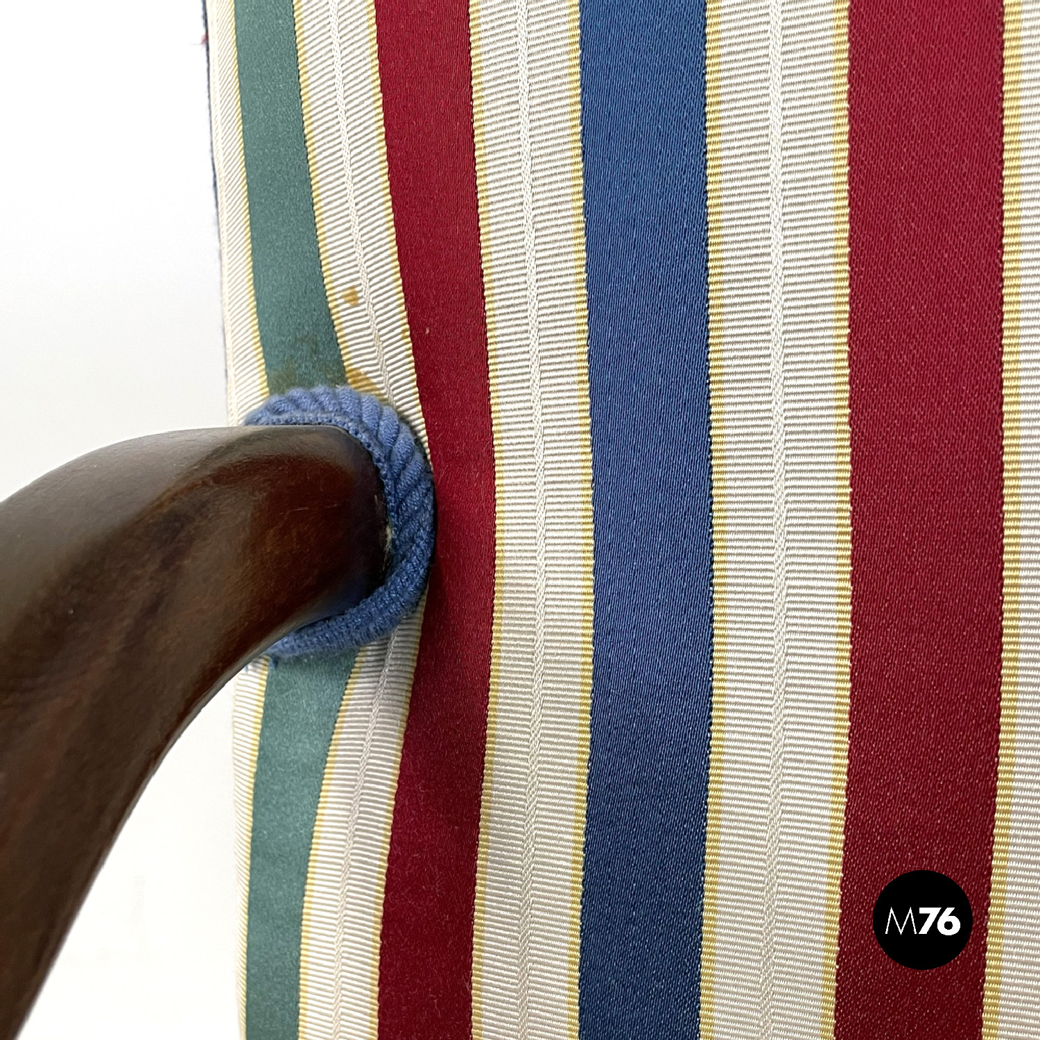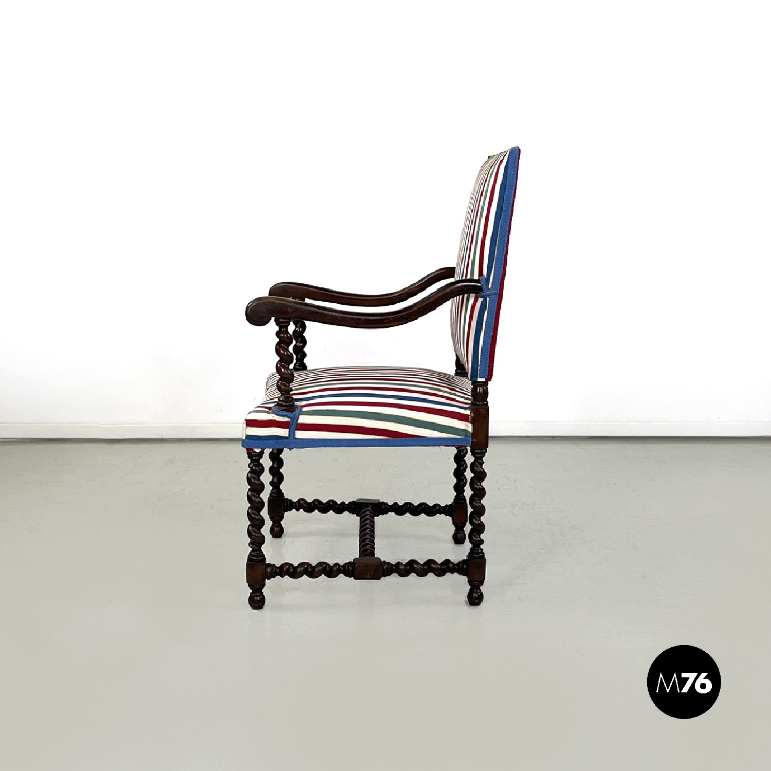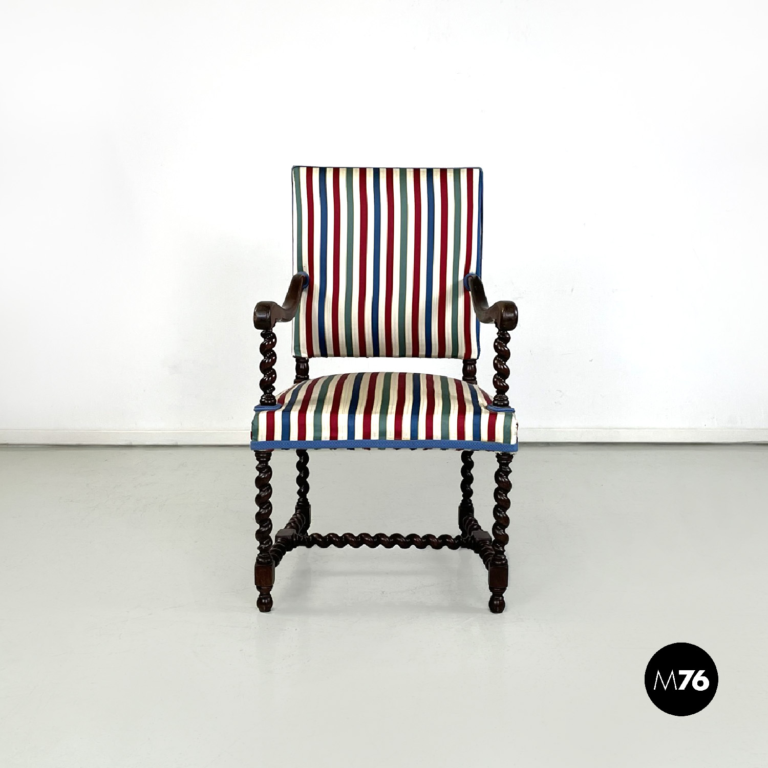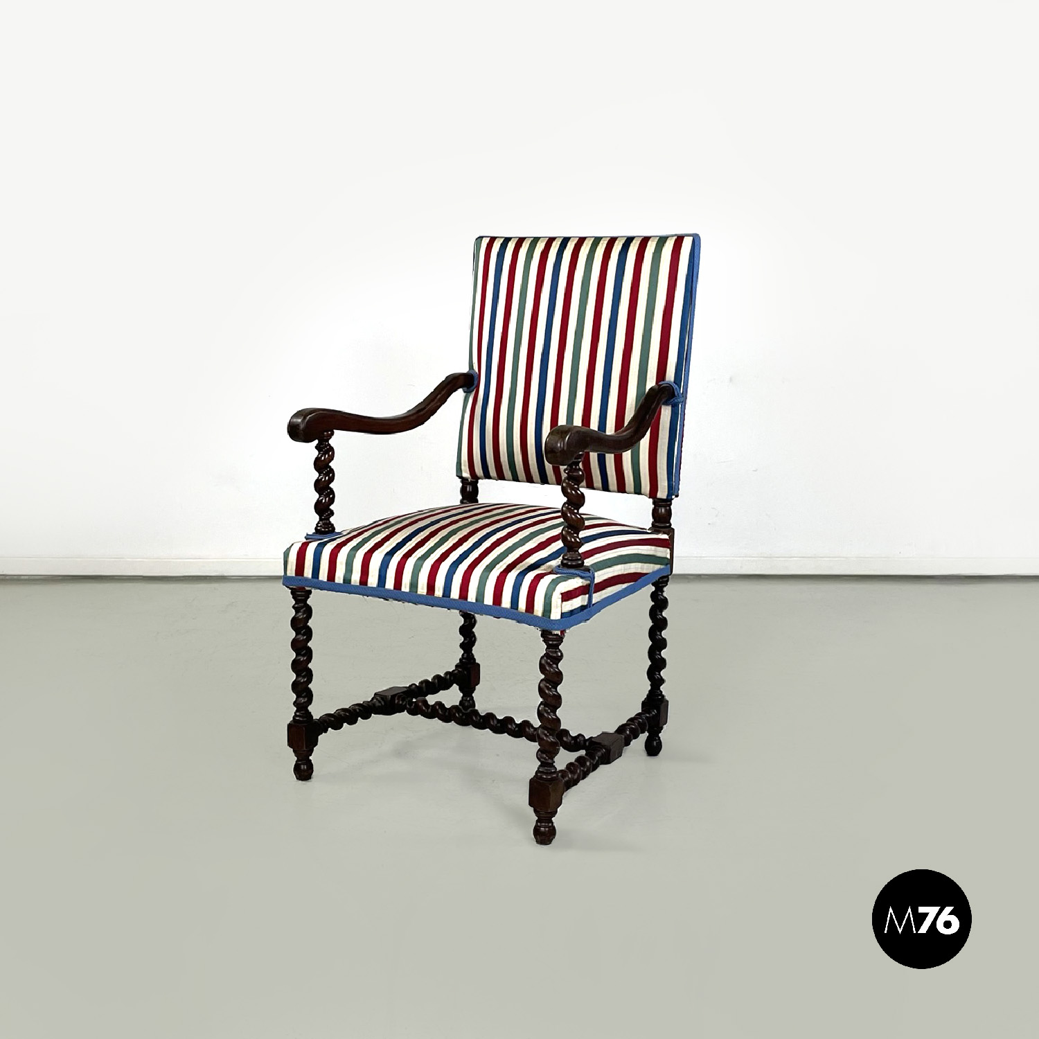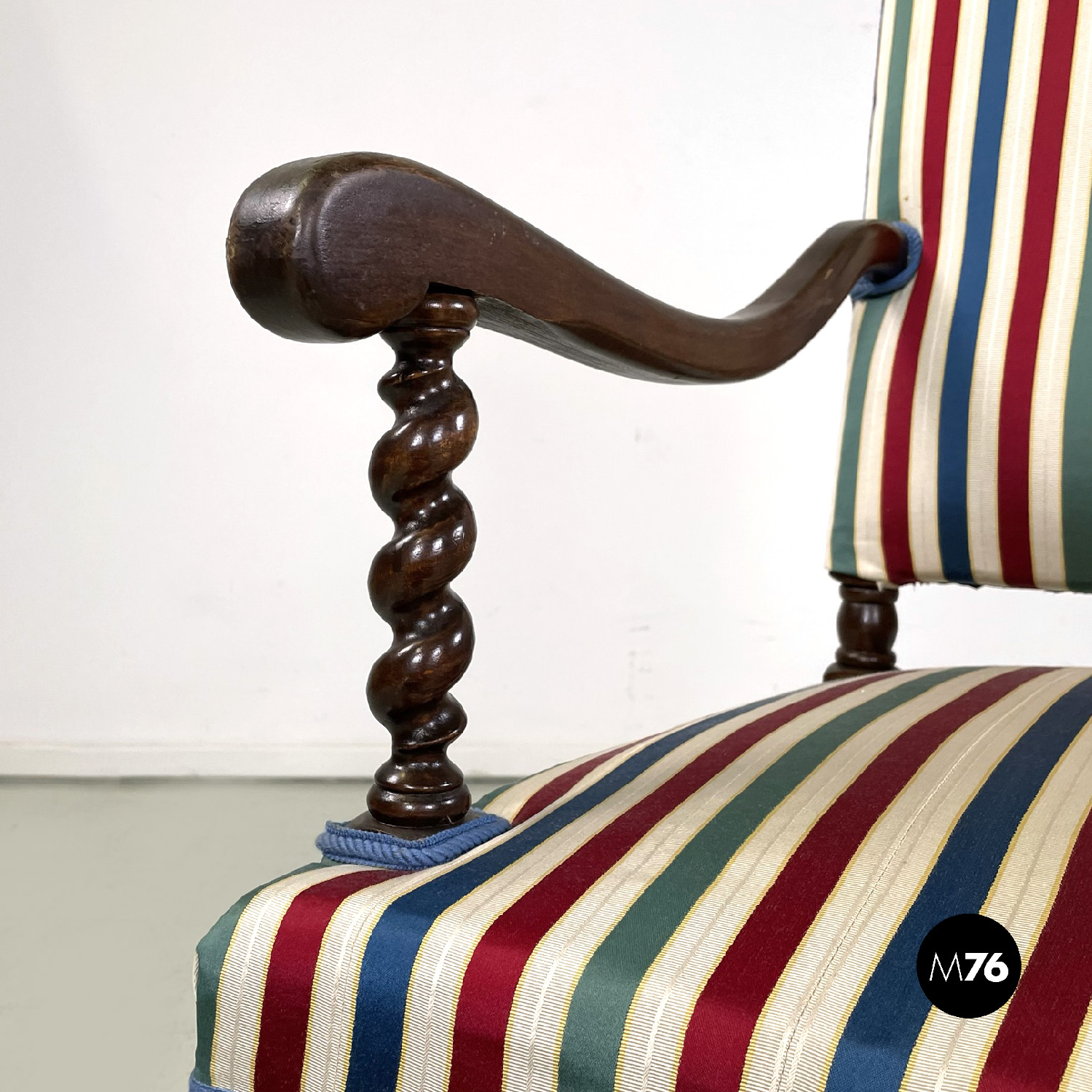 Poltrona o sedia a schienale alto o poltrona da capo tavola con braccioli, con struttura in legno. La seduta e lo schienale sono imbottiti e rivestiti da un tessuto tipo seta a righe bianche, rosse, blu e verdi. Presenta una passamaneria celeste che segue il profilo del rivestimento di tessuto e fa da dettaglio decorativo. I braccioli, le quattro gambe e la loro struttura portante sono decorati a torciglione.