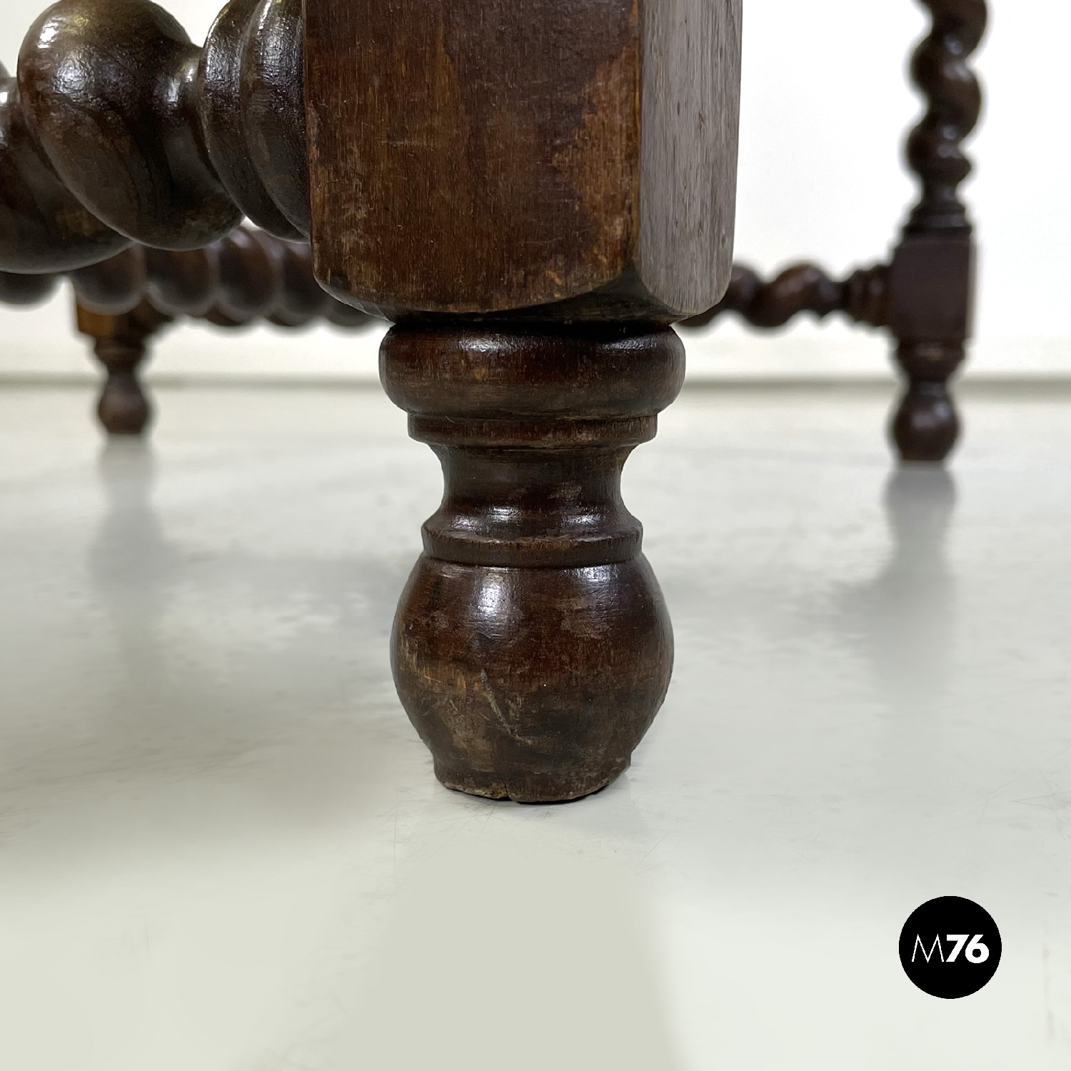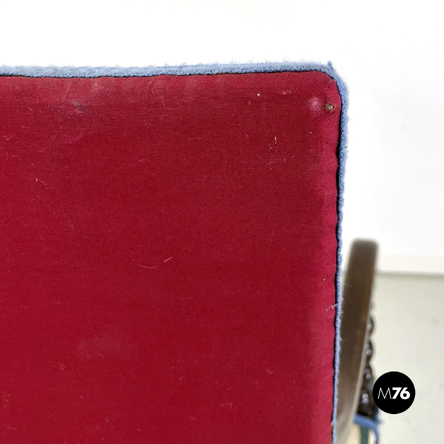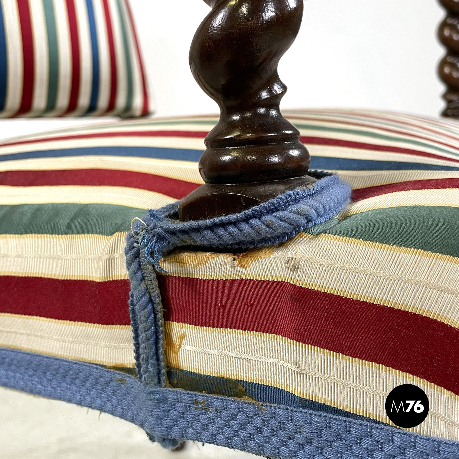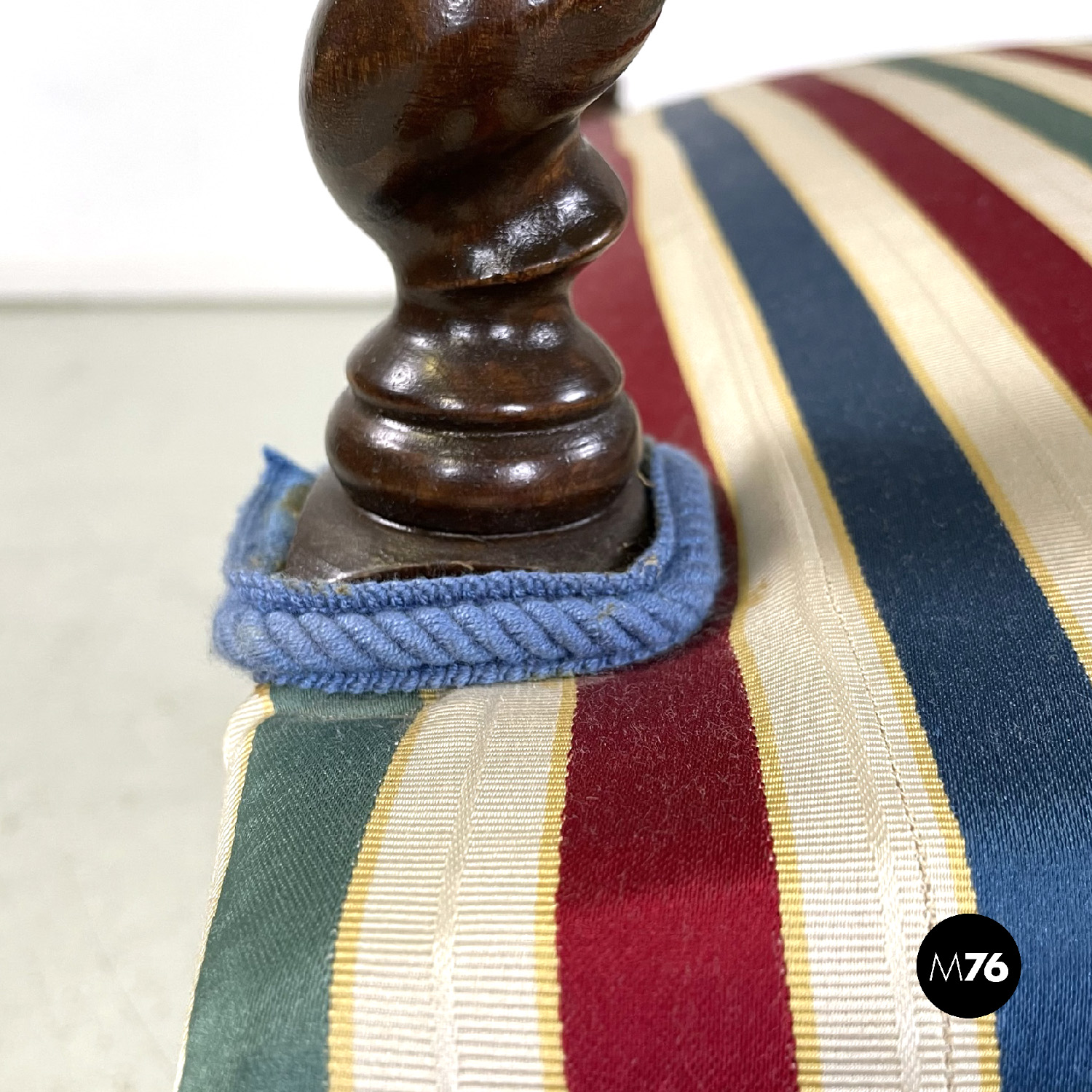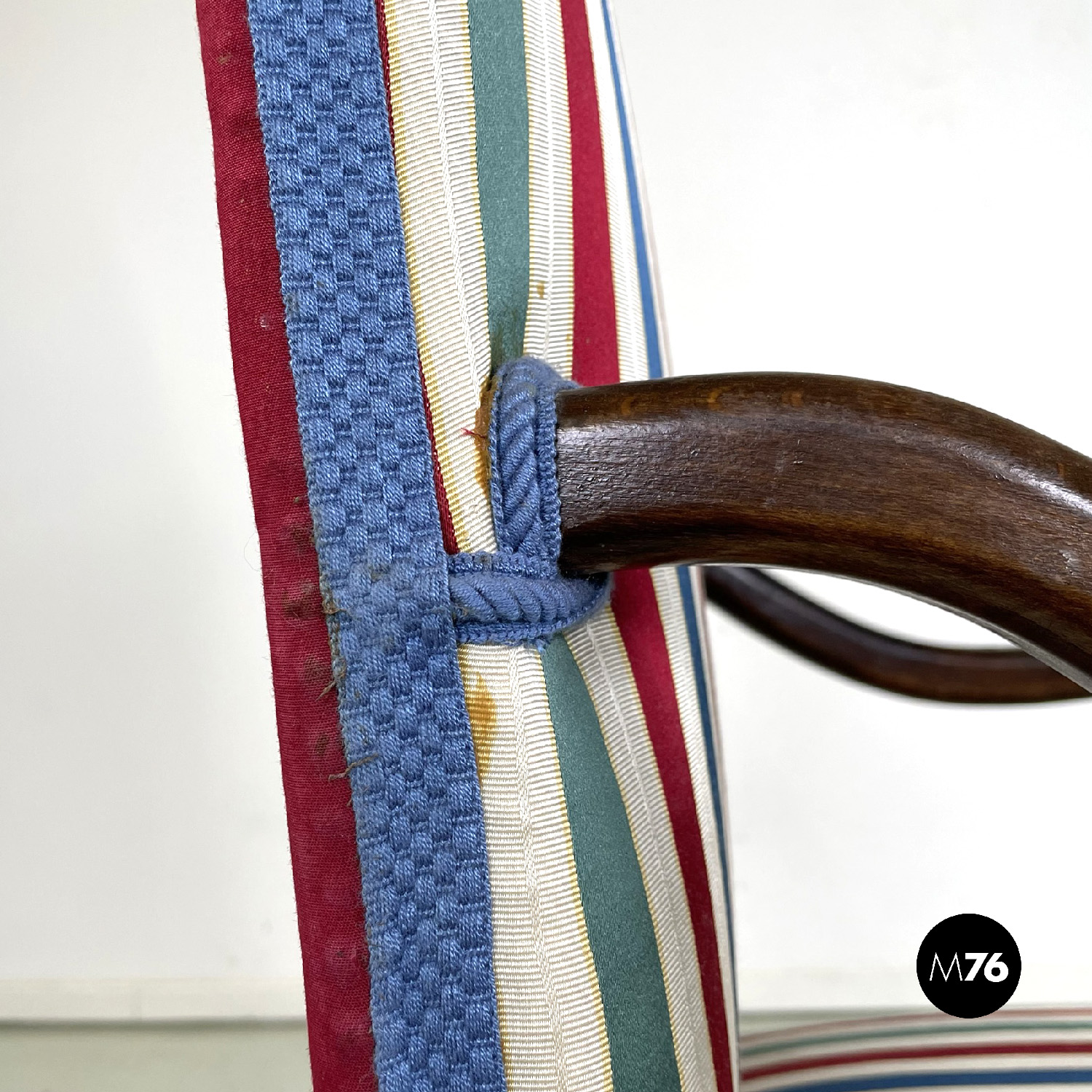 Poltrona o sedia a schienale alto o poltrona da capo tavola con braccioli, con struttura in legno. La seduta e lo schienale sono imbottiti e rivestiti da un tessuto tipo seta a righe bianche, rosse, blu e verdi. Presenta una passamaneria celeste che segue il profilo del rivestimento di tessuto e fa da dettaglio decorativo. I braccioli, le quattro gambe e la loro struttura portante sono decorati a torciglione.