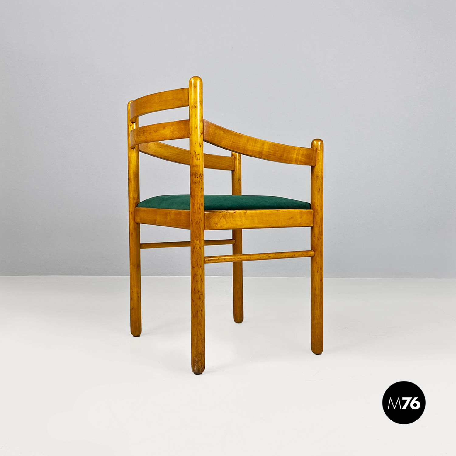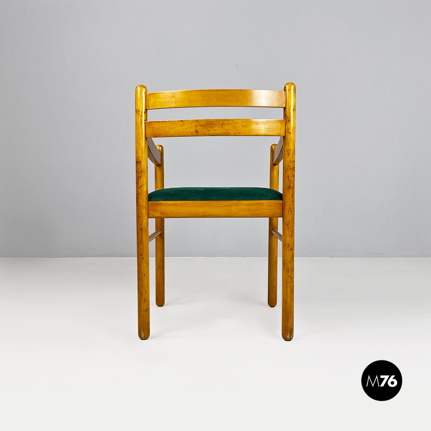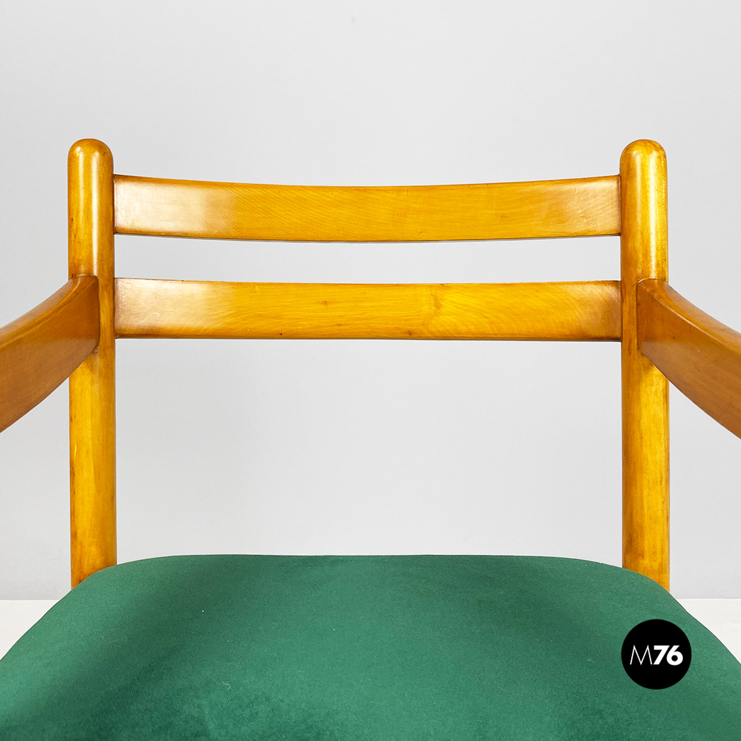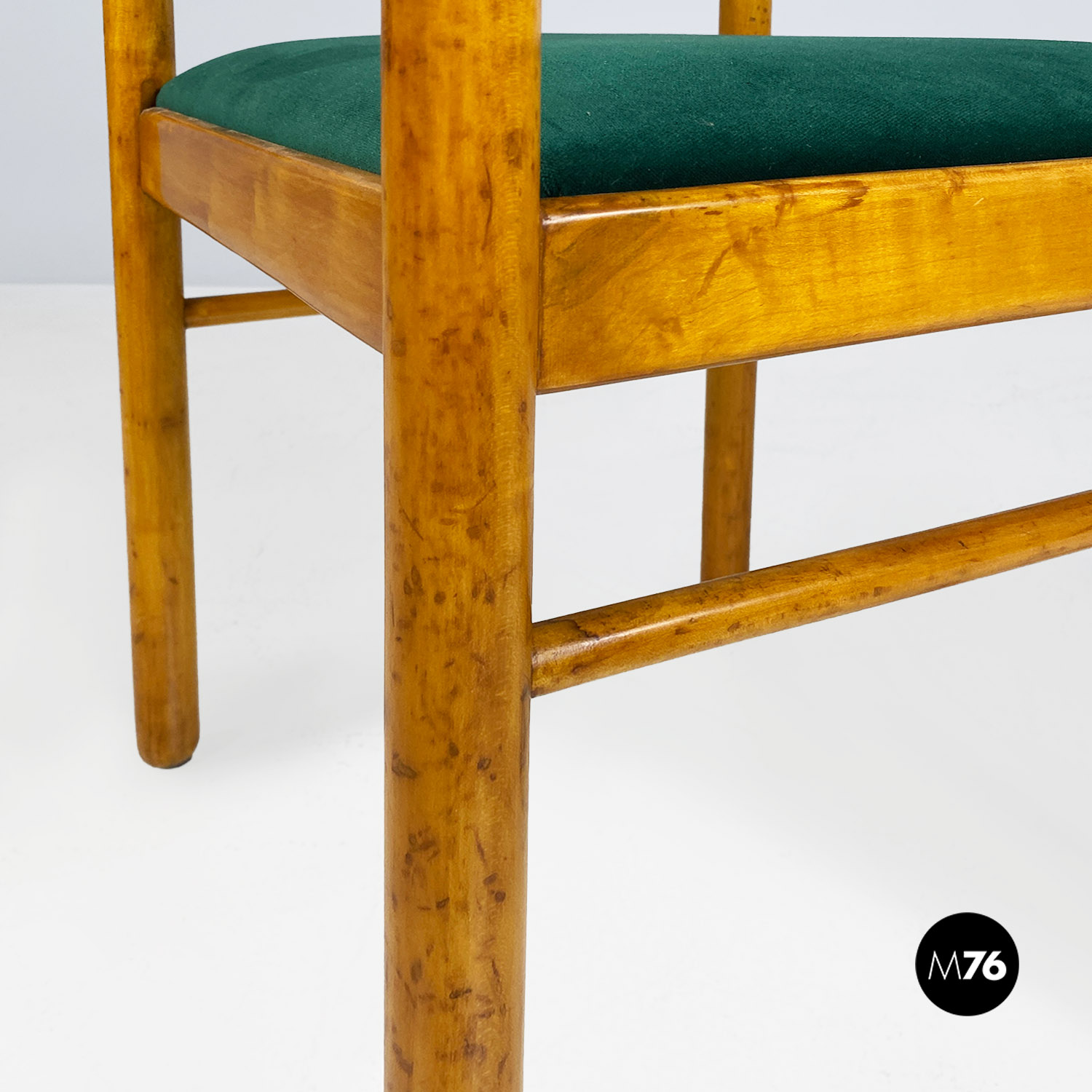 Sedia in legno con braccioli curvi, con seduta rettangolare in velluto verde bosco. Con zampe a sezione tonda.