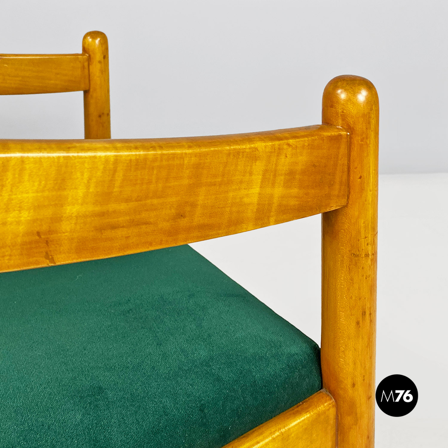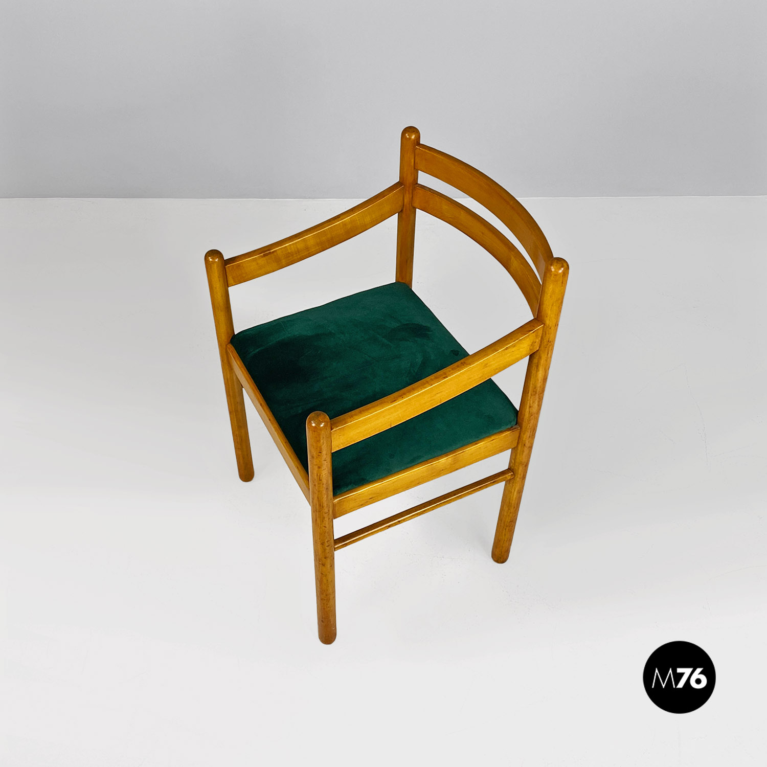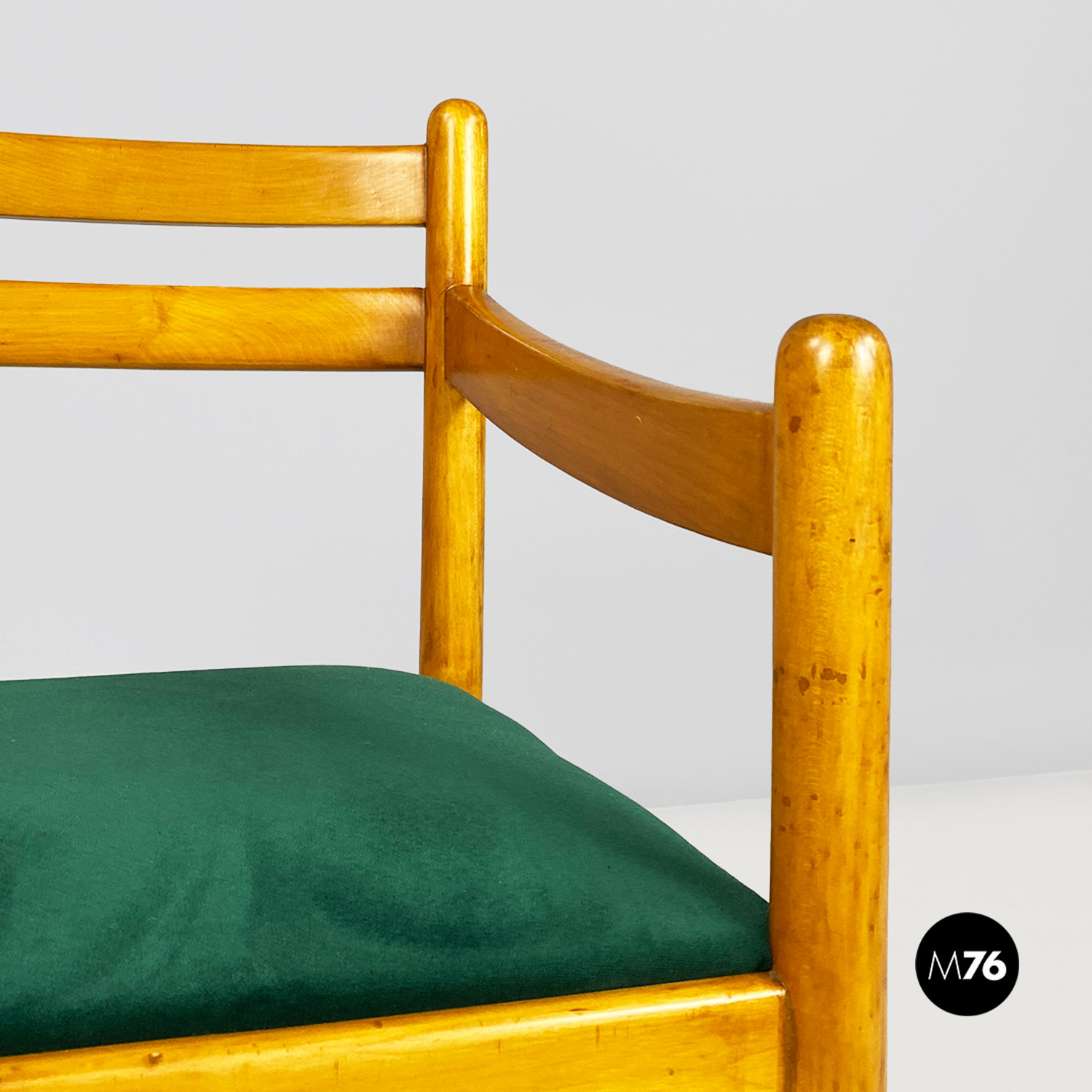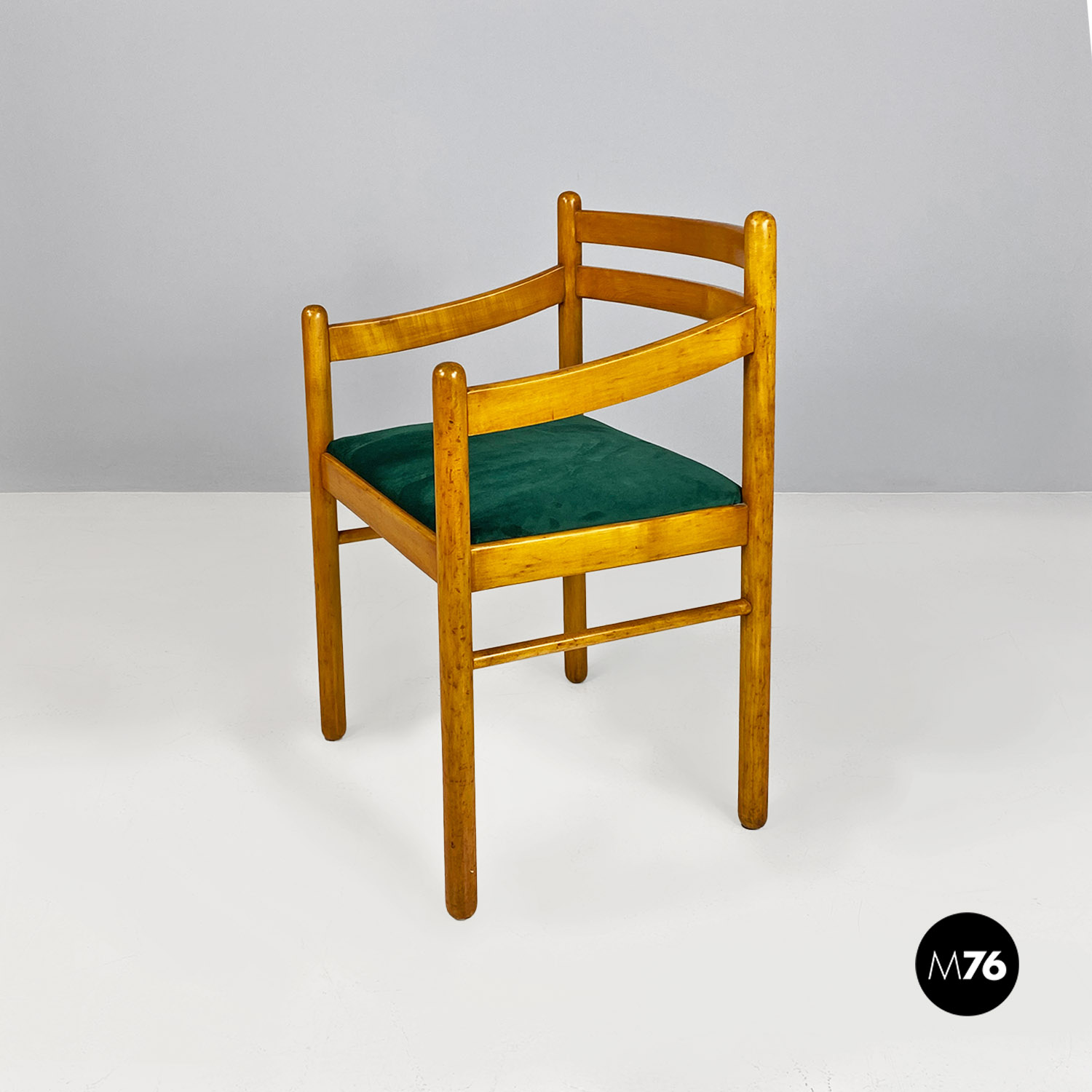Sedia in legno con braccioli curvi, con seduta rettangolare in velluto verde bosco. Con zampe a sezione tonda.