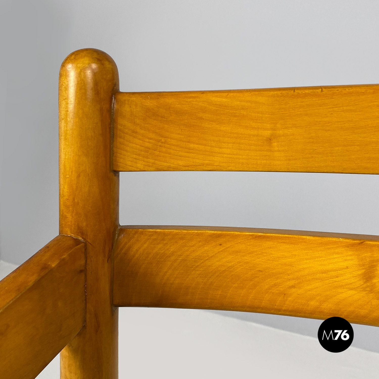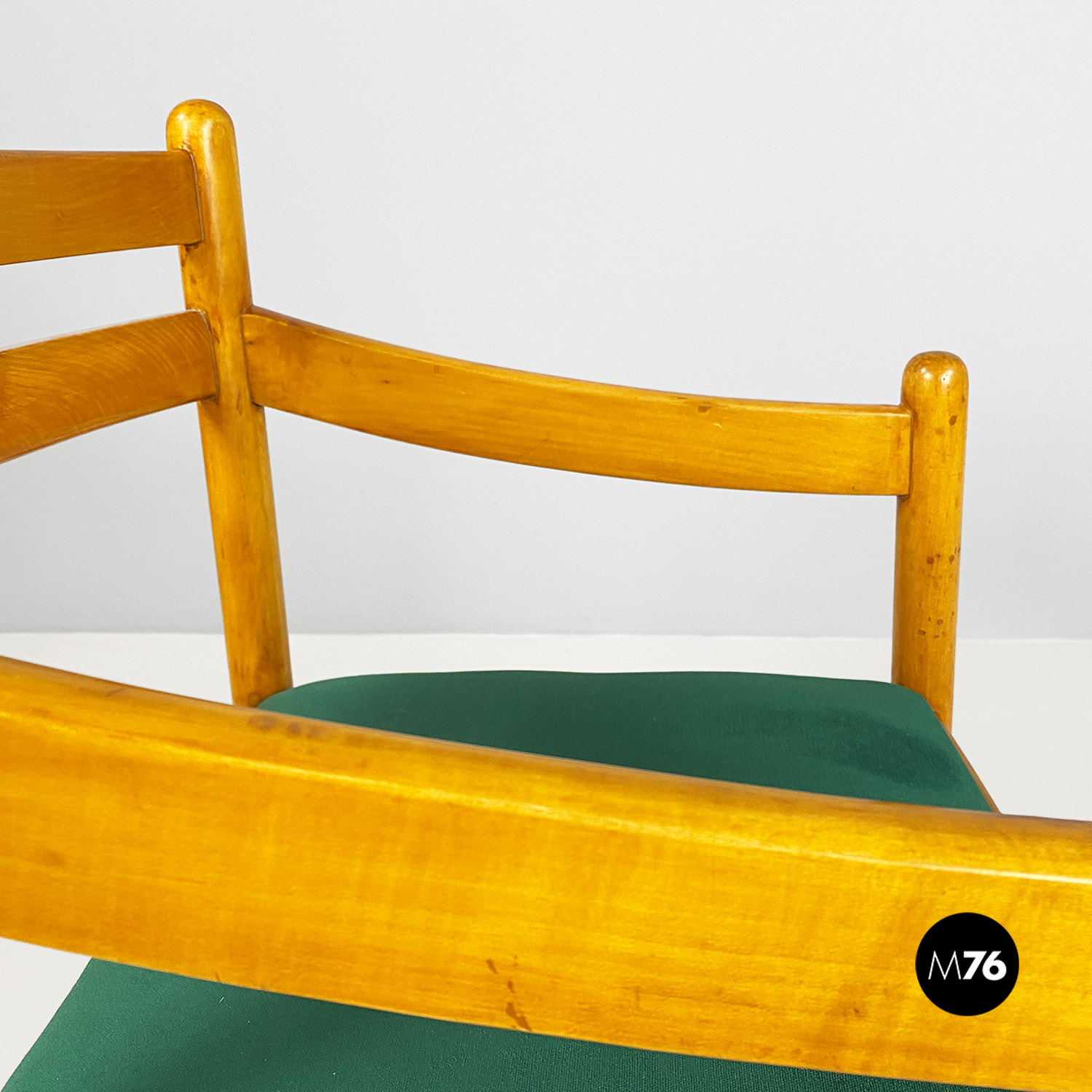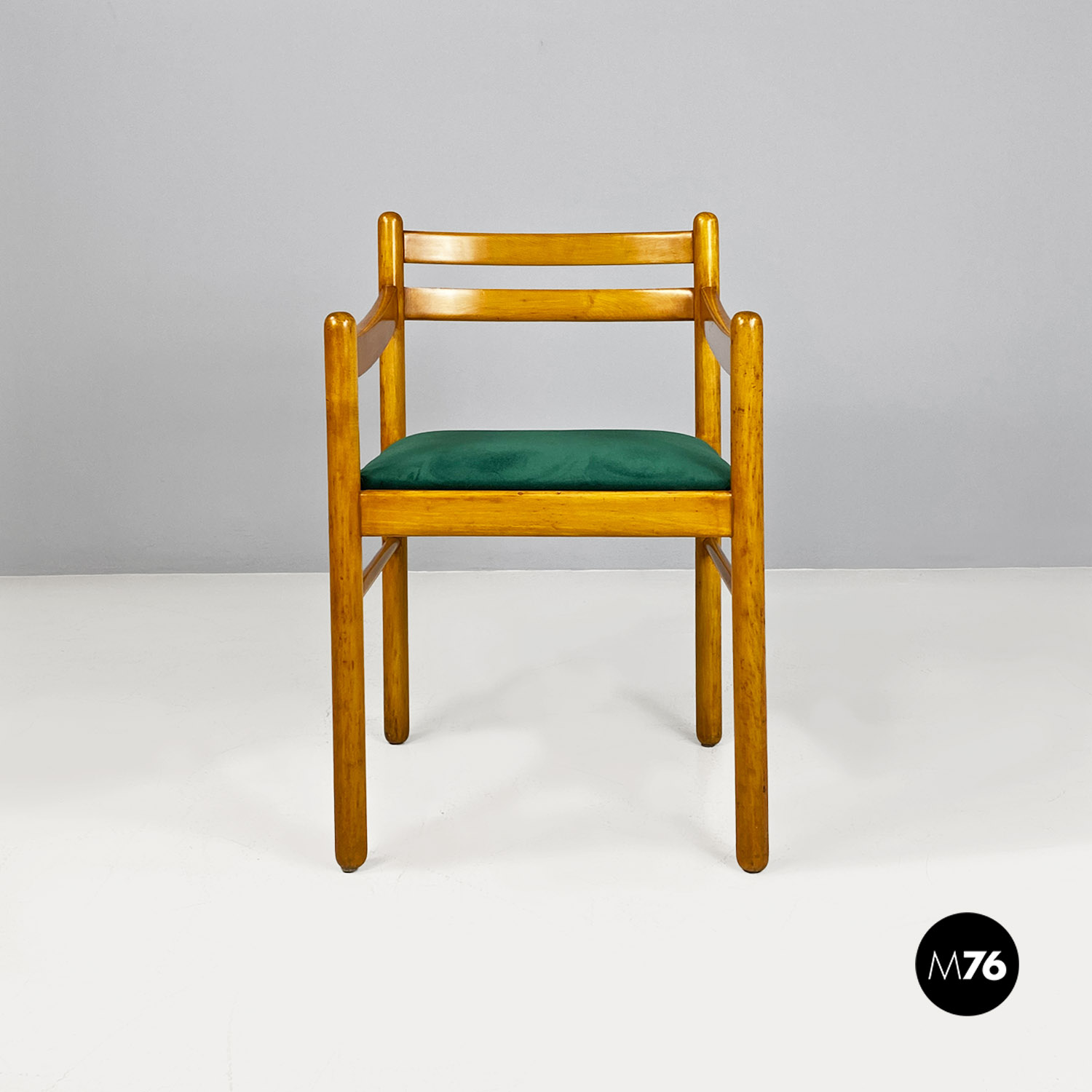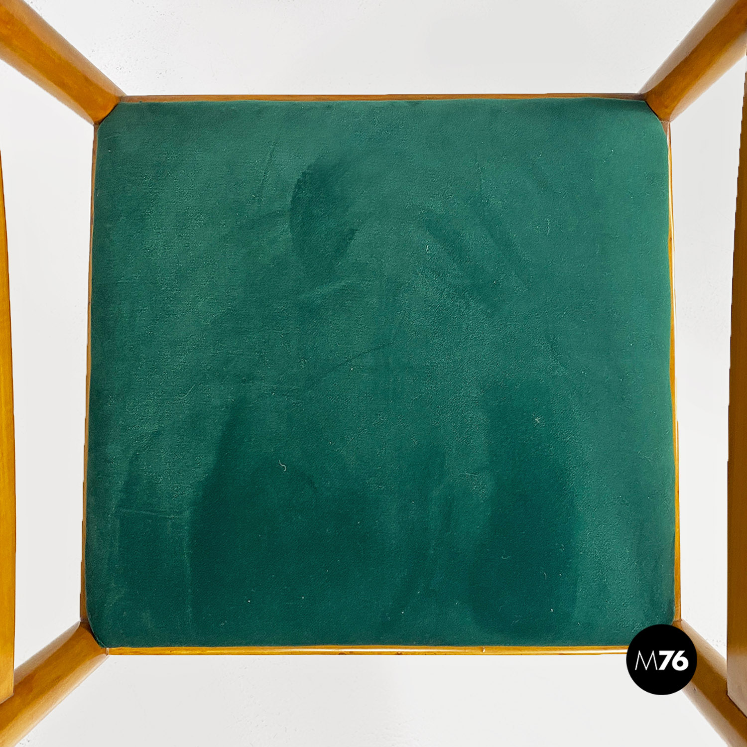 Sedia in legno con braccioli curvi, con seduta rettangolare in velluto verde bosco. Con zampe a sezione tonda.