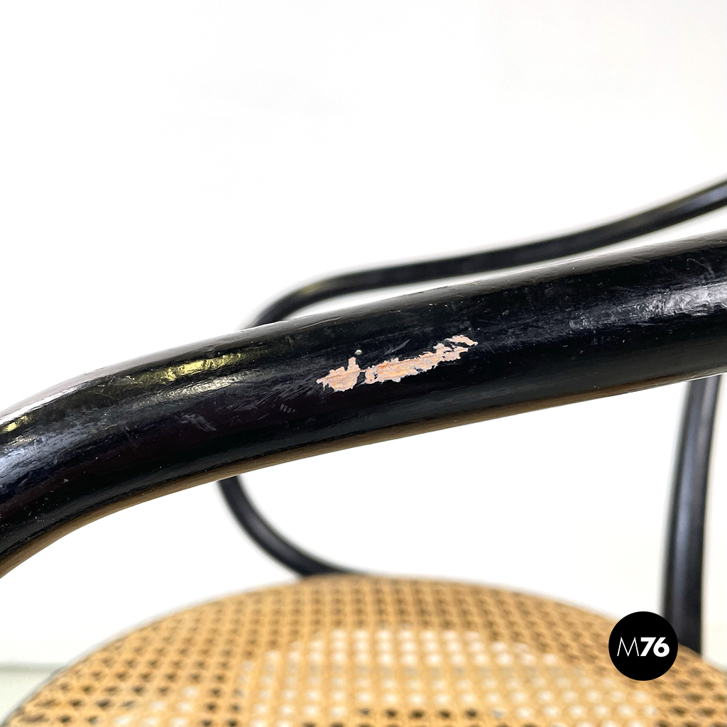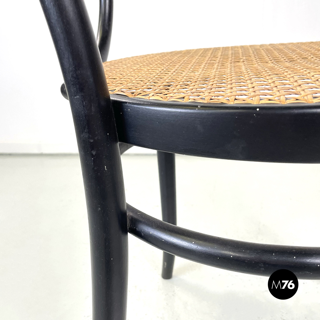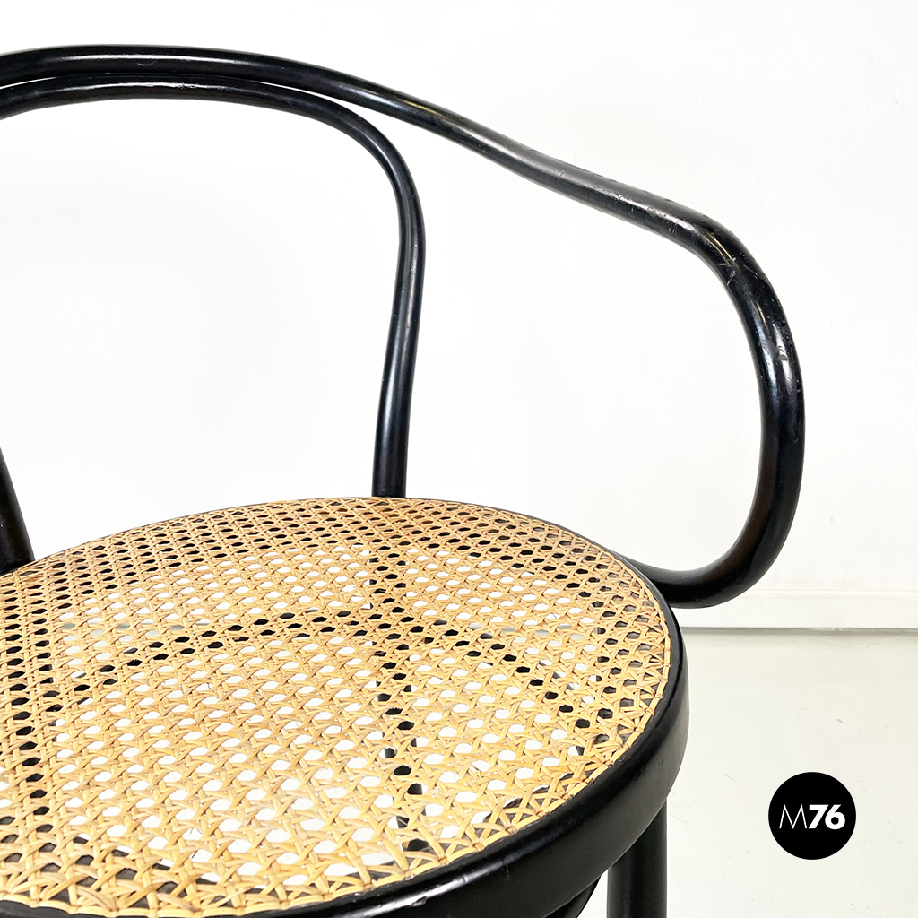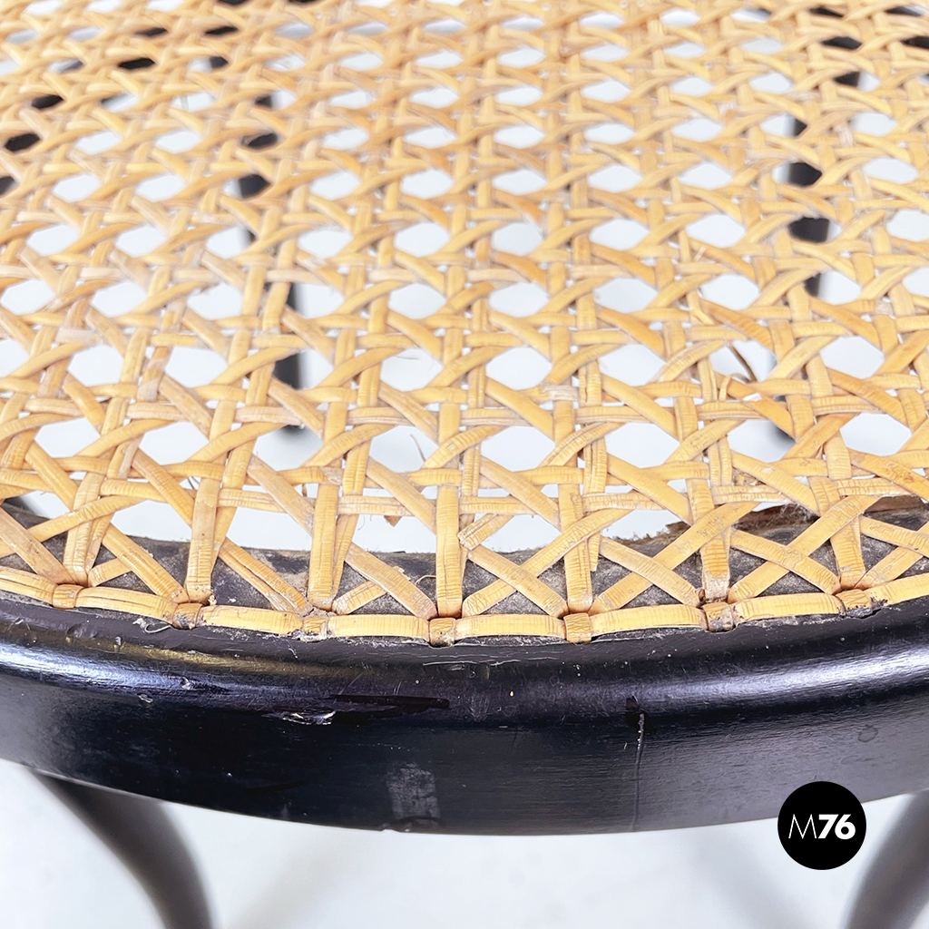 Sedia con seduta tonda in paglia di Vienna. La struttura, che comprende schienale e gambe, è in legno incurvato a sezione tonda e verniciato nero.