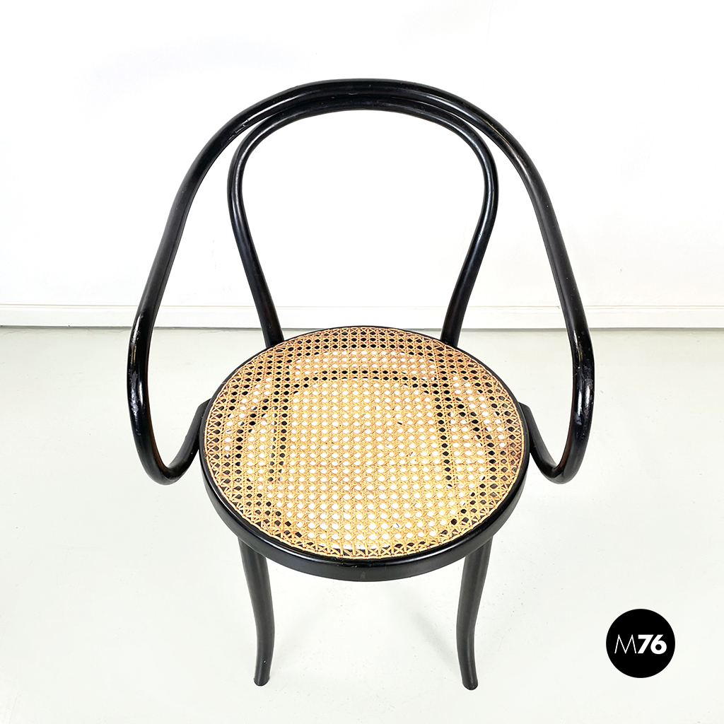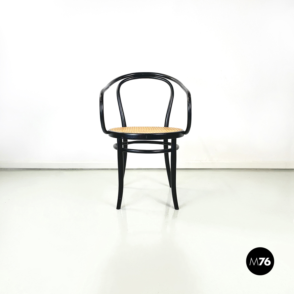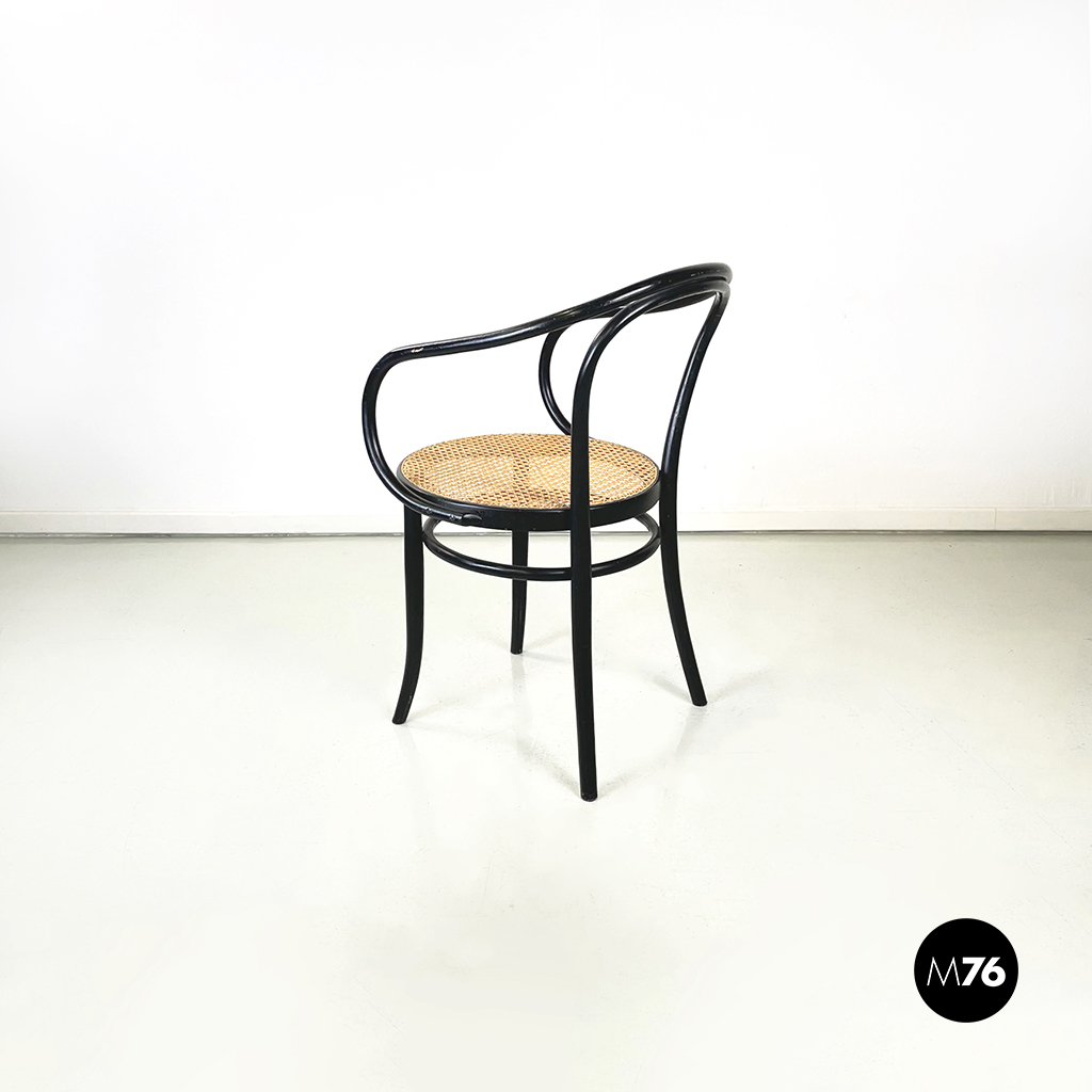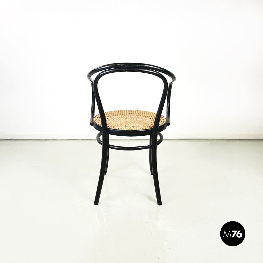 Sedia con seduta tonda in paglia di Vienna. La struttura, che comprende schienale e gambe, è in legno incurvato a sezione tonda e verniciato nero.
