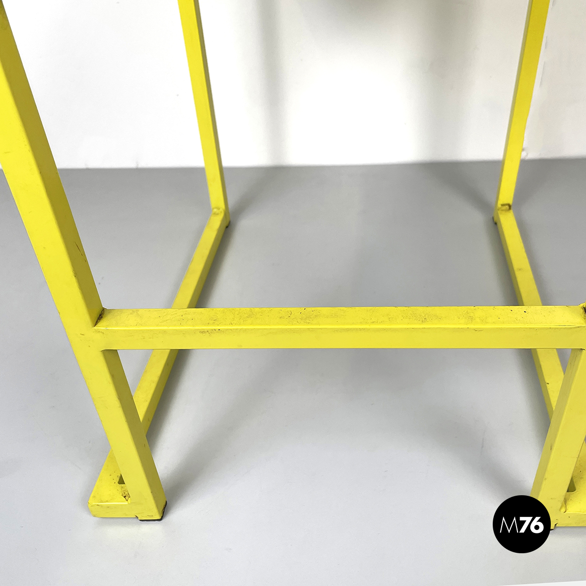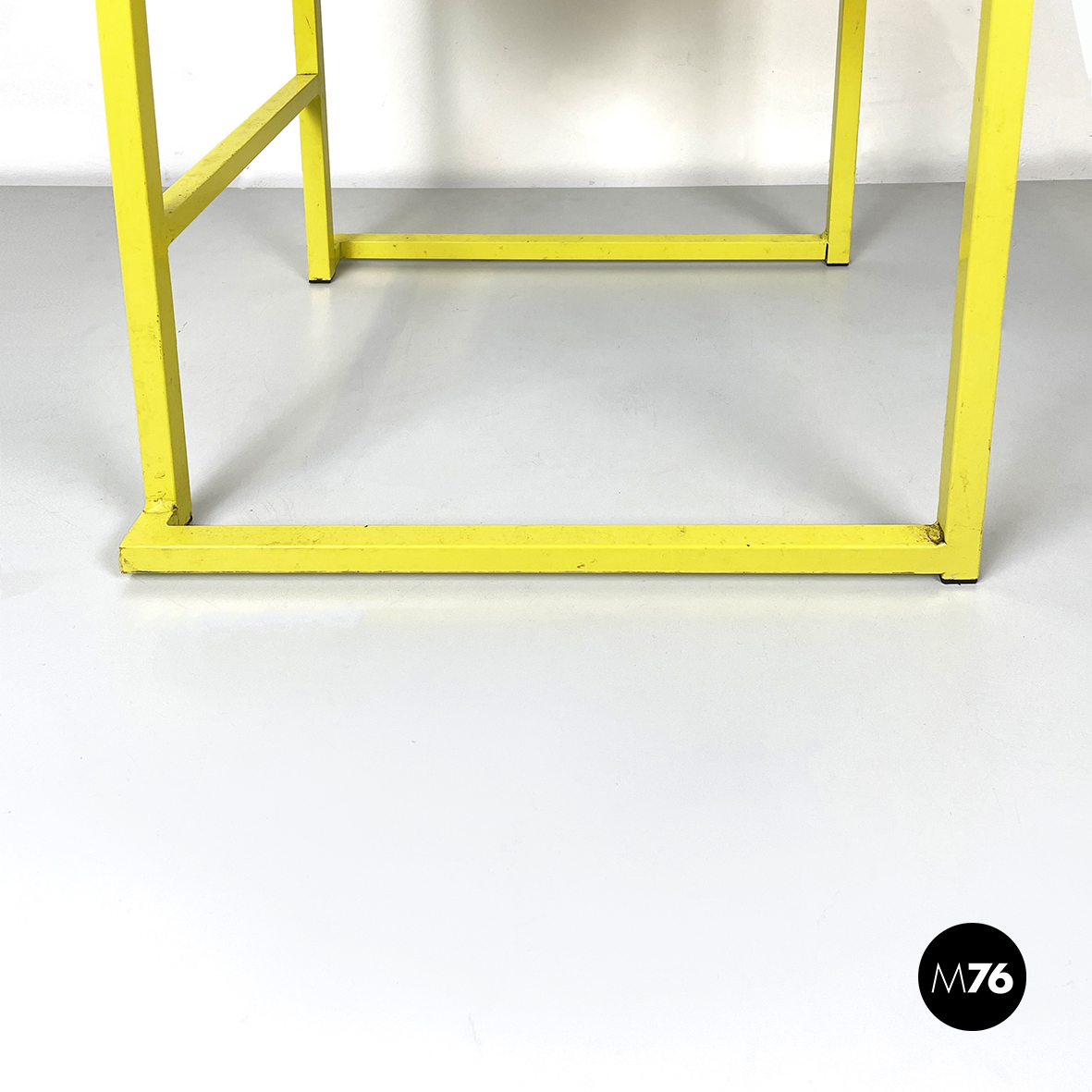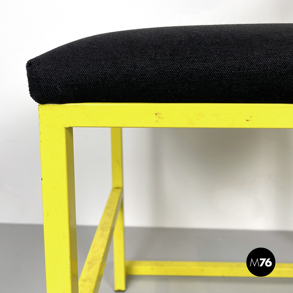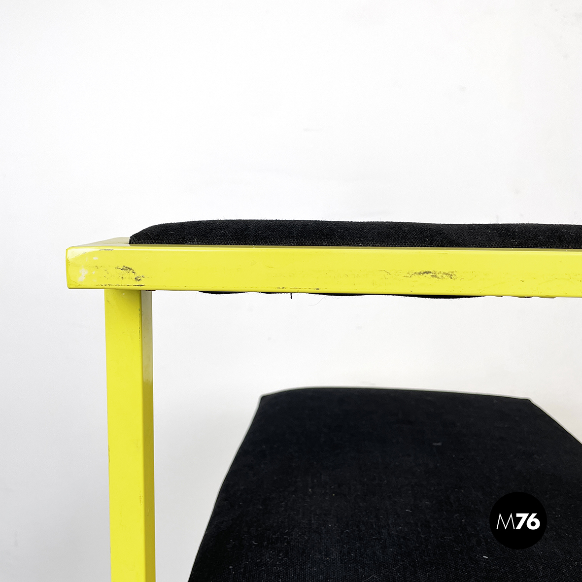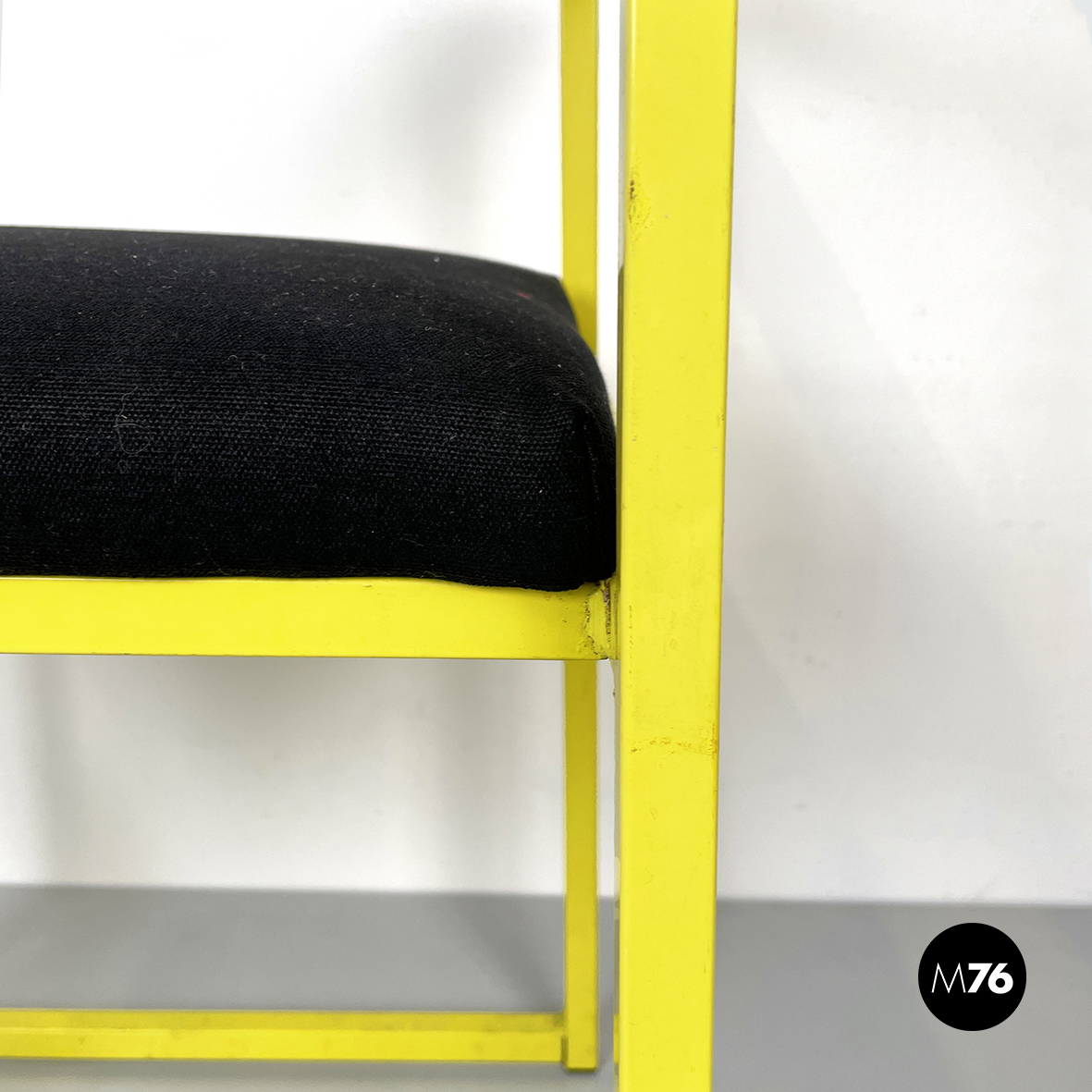 Sedia con seduta e schienale rettangolari imbottiti e rivestiti in tessuto nero. La struttura a seziona quadrata è in metallo verniciato giallo. Sul fronte è presente un poggiapiedi.