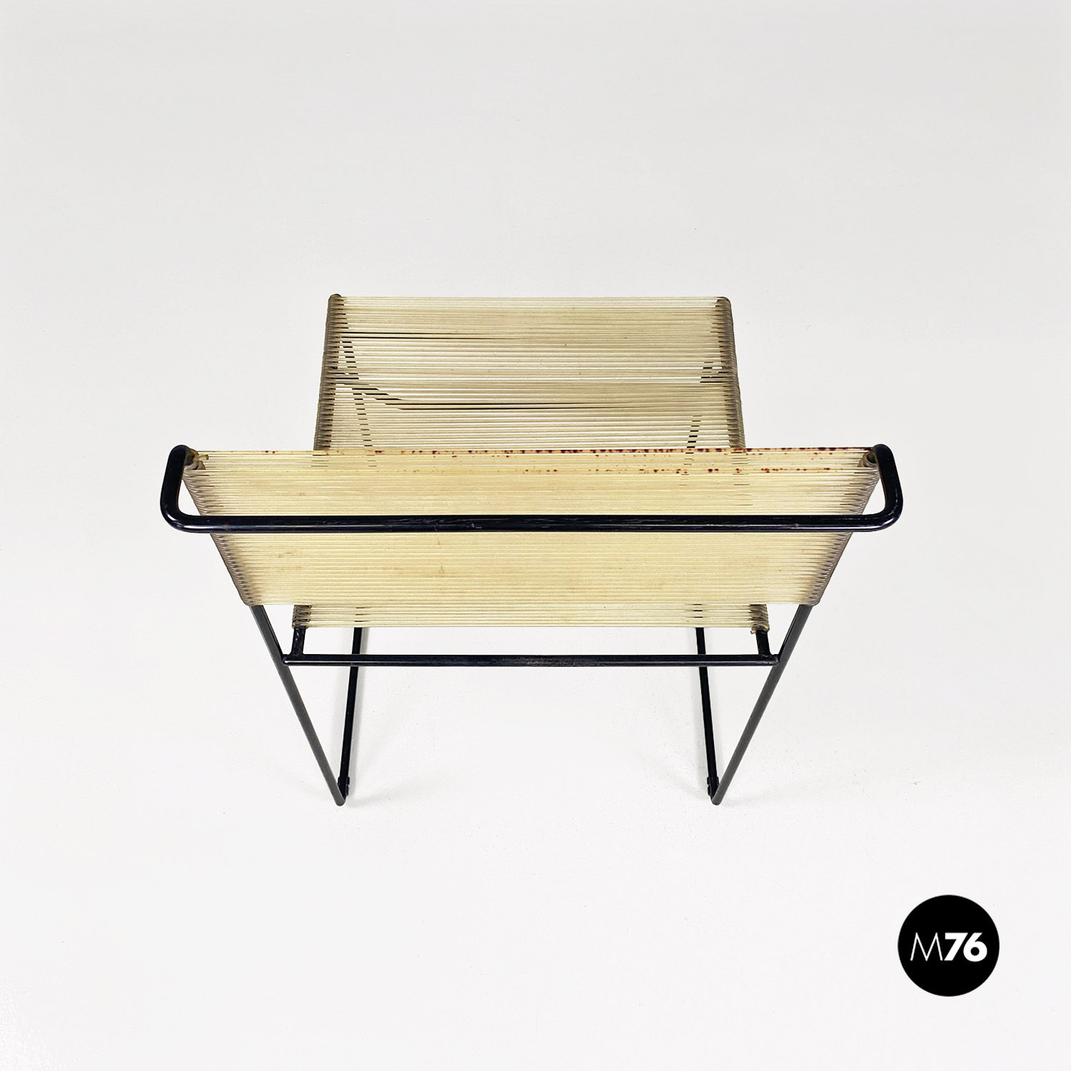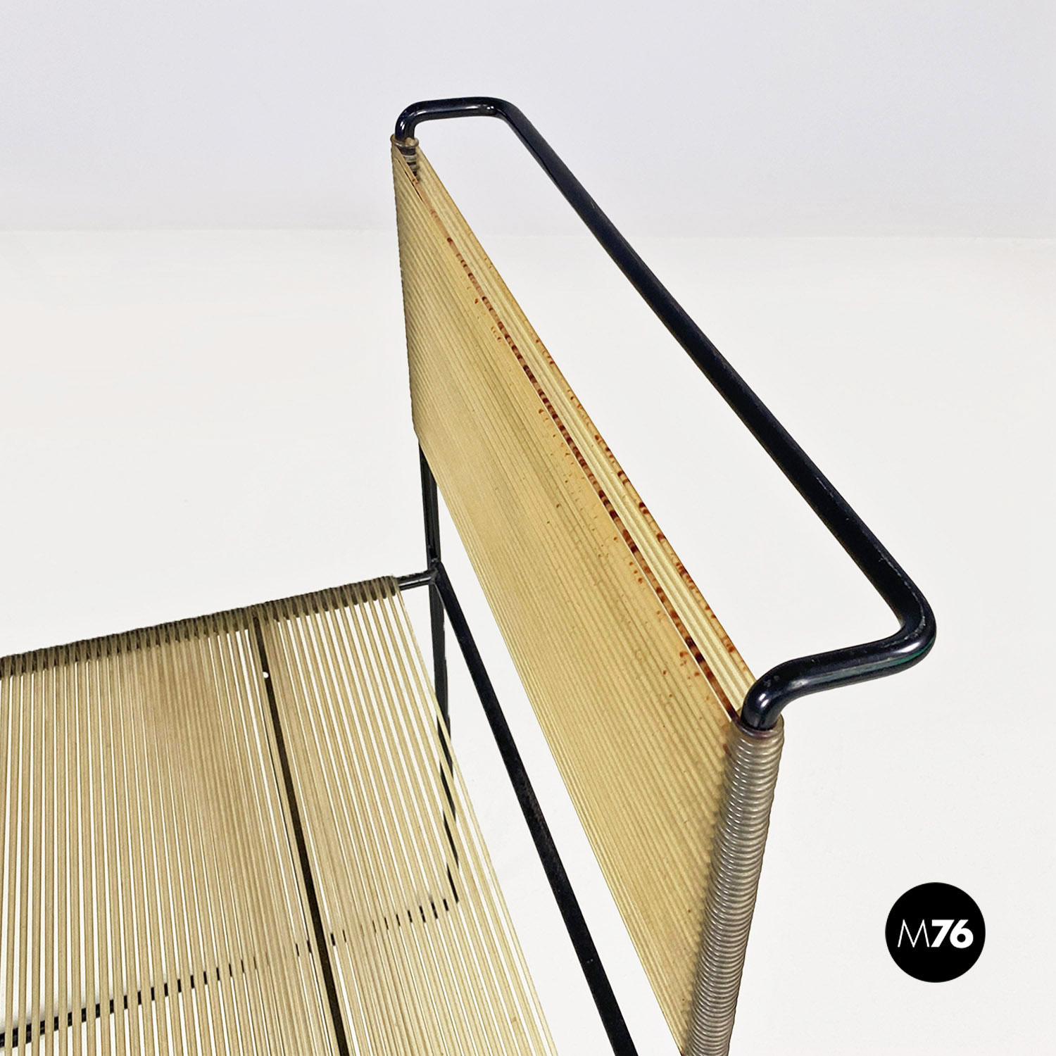 Sedia con struttura in tondino di metallo nero e seduta e schienale creati con fili di plastica trasparenti.