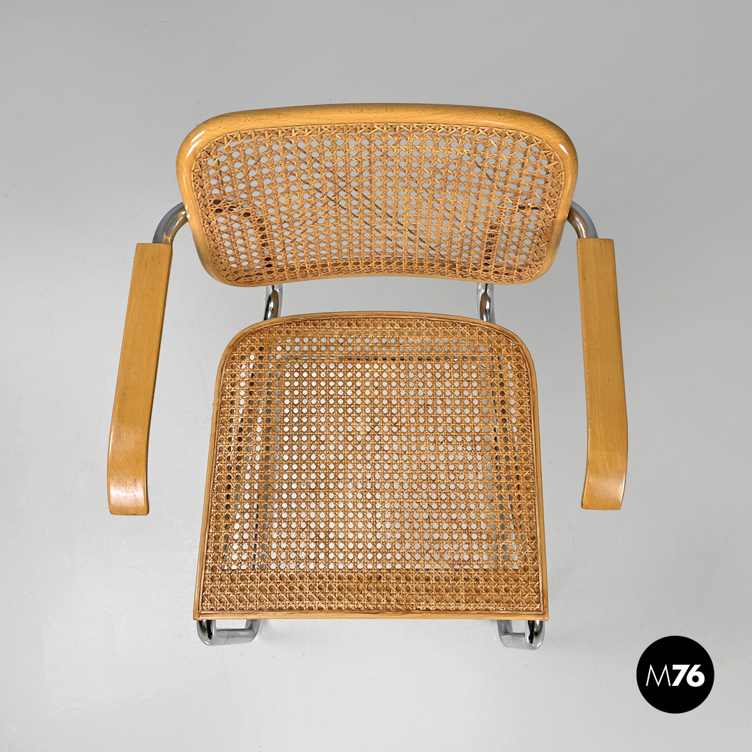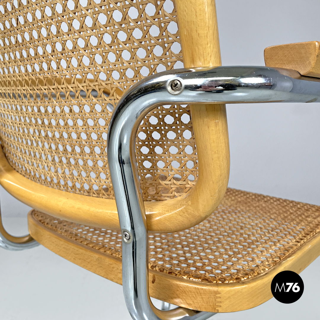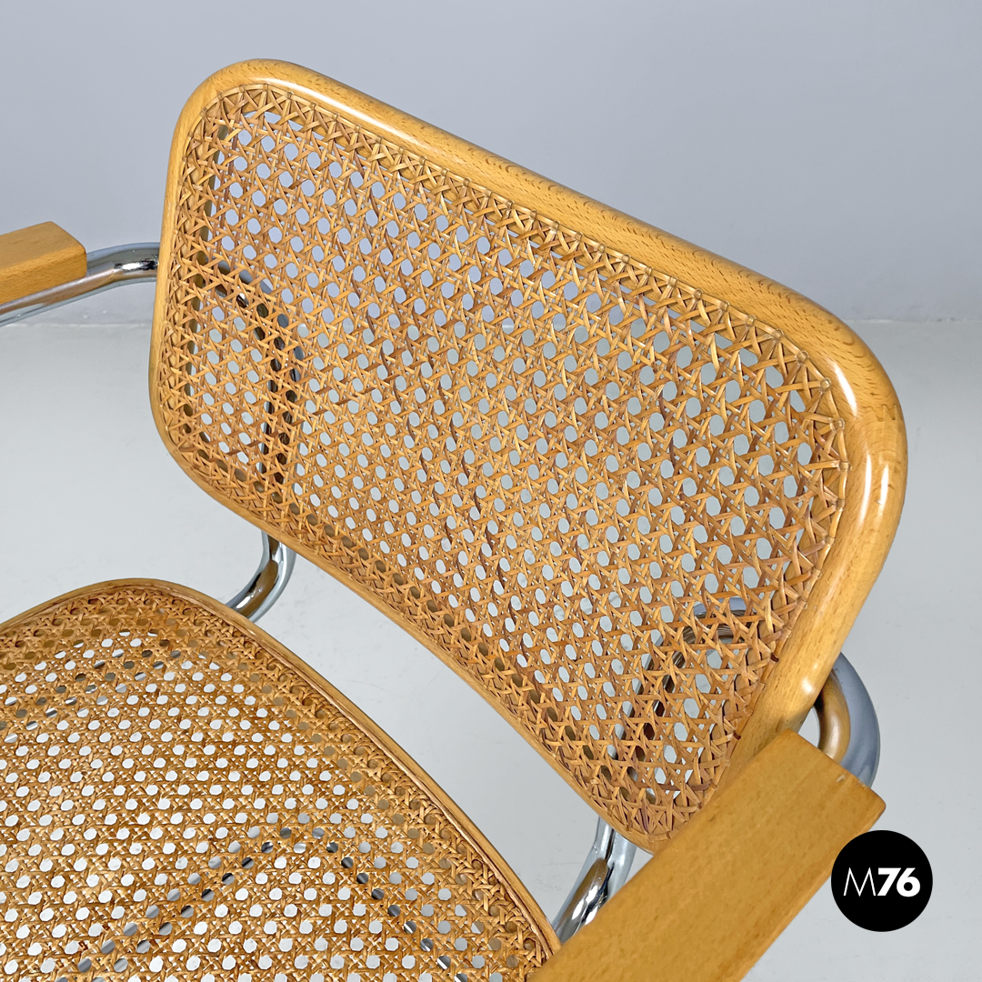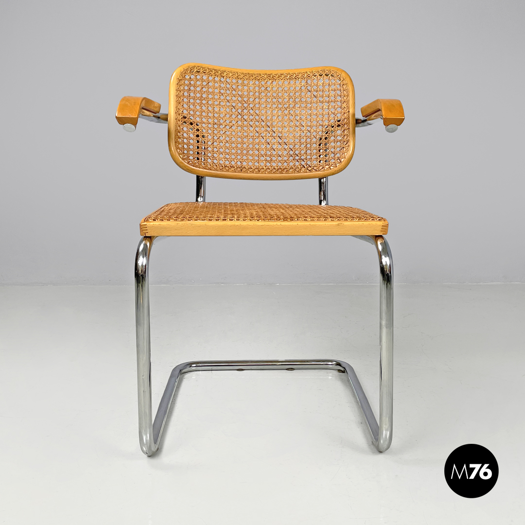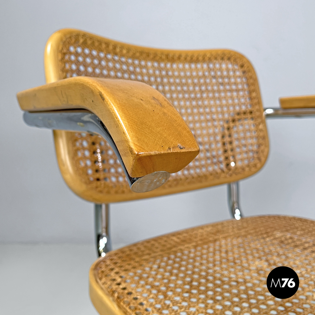 Sedia con braccioli in stile Cesca con seduta e schienale in paglia chiara di Vienna e profili in legno chiaro. La struttura è in tubolare d’acciaio.