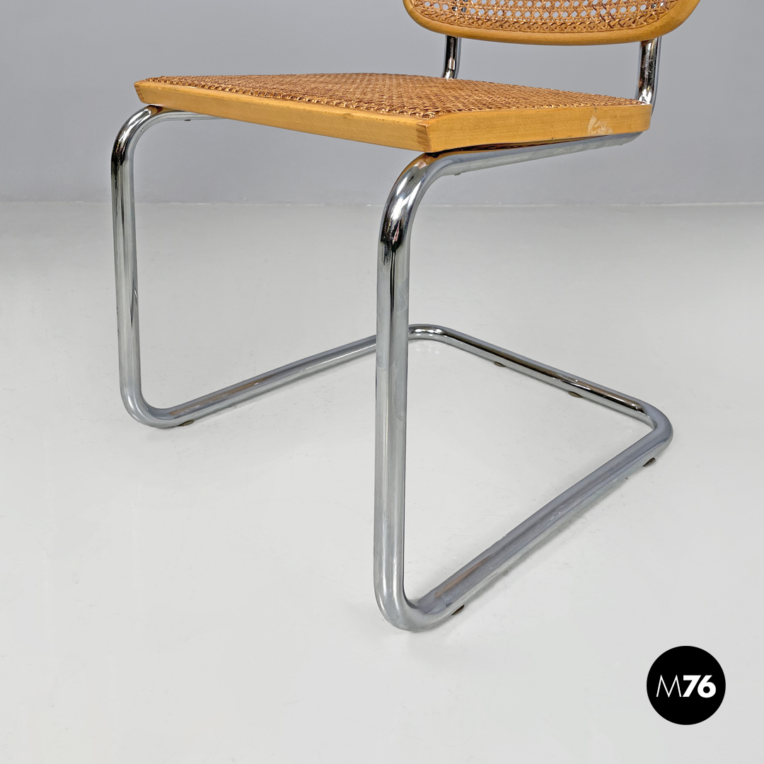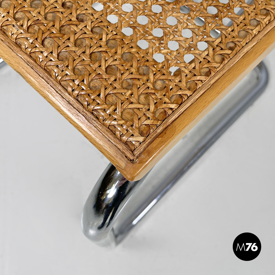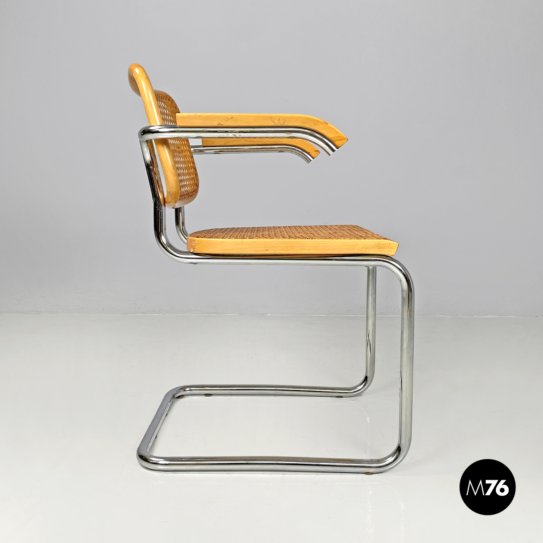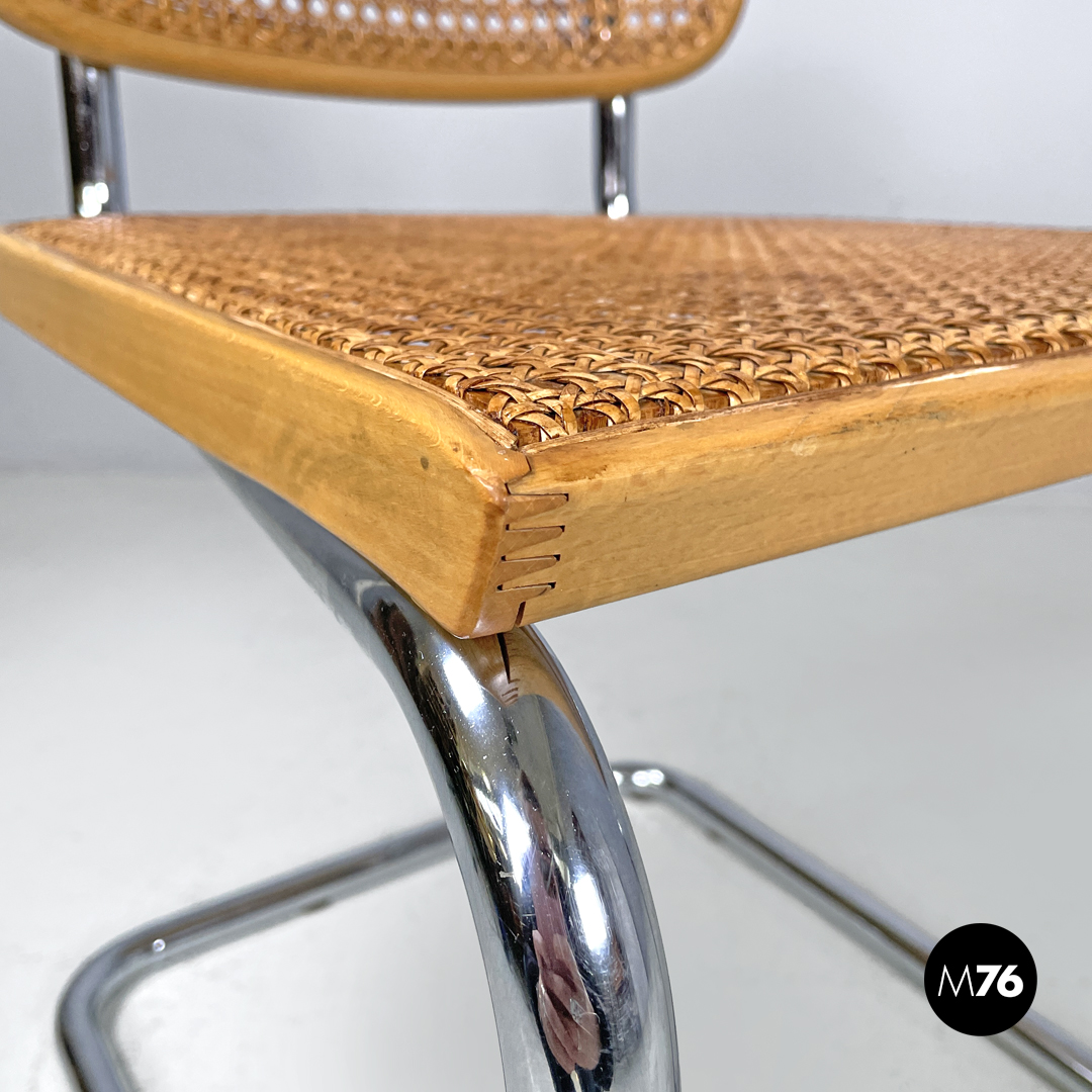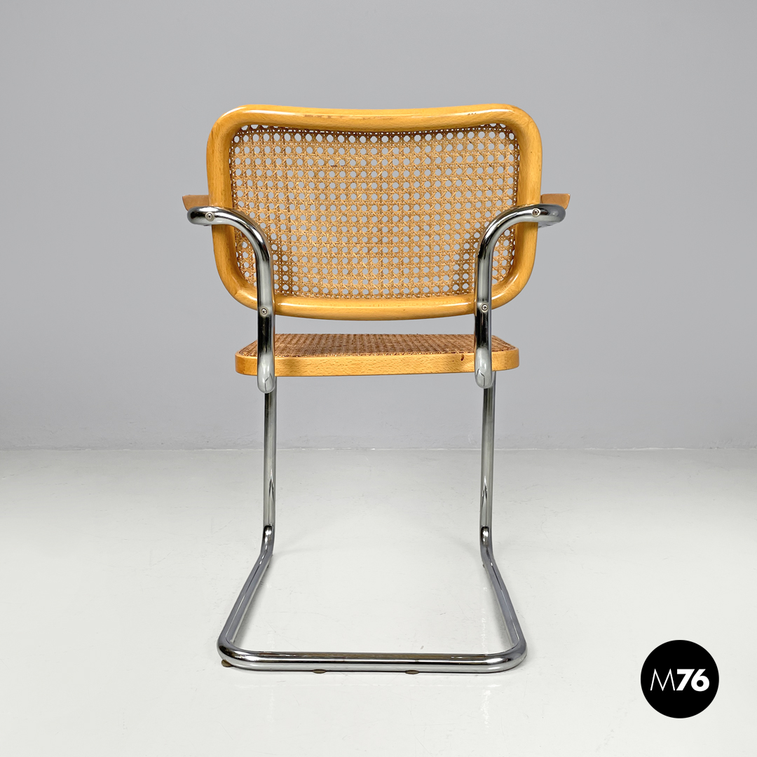 Sedia con braccioli in stile Cesca con seduta e schienale in paglia chiara di Vienna e profili in legno chiaro. La struttura è in tubolare d’acciaio.