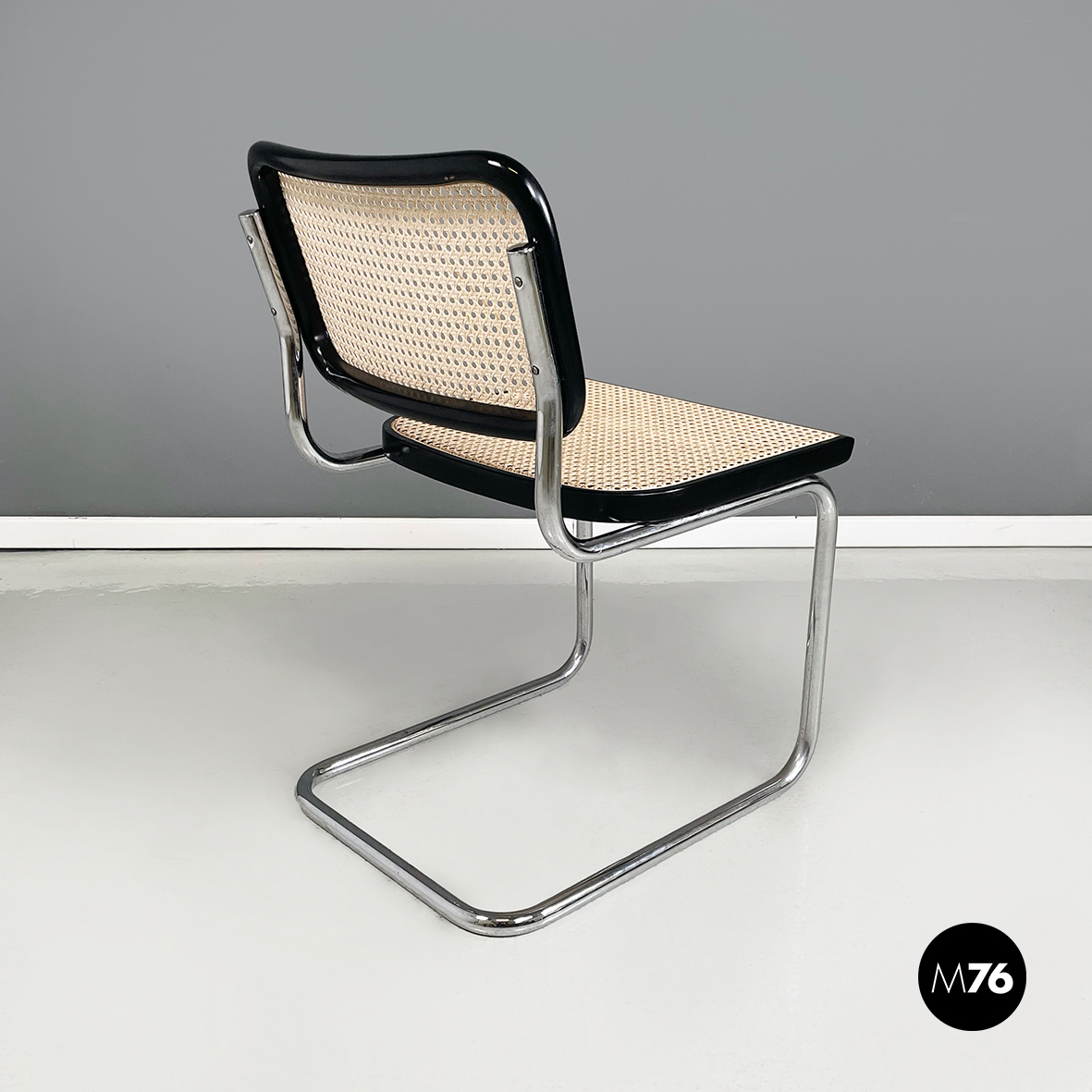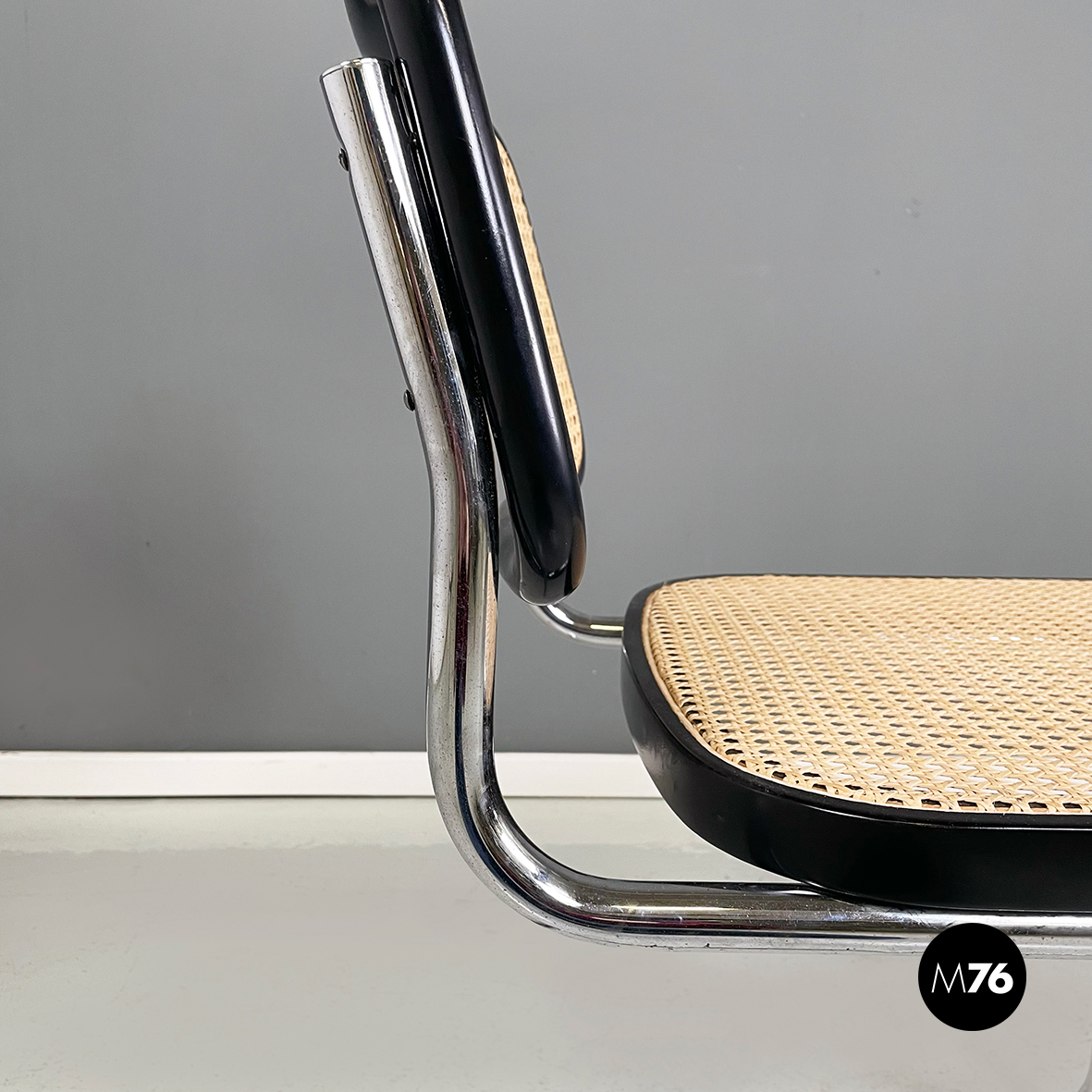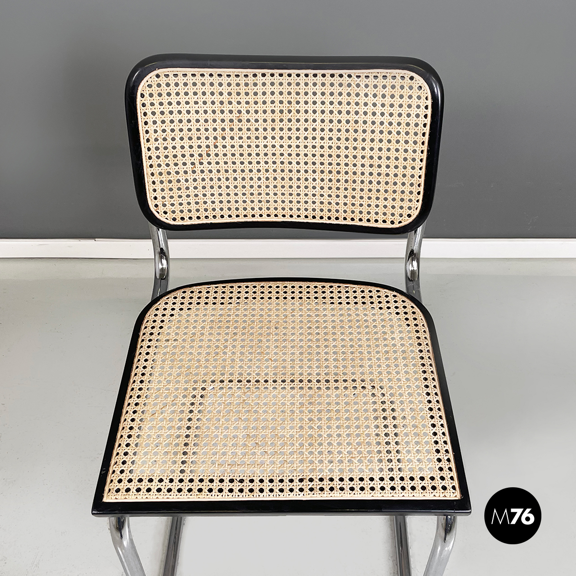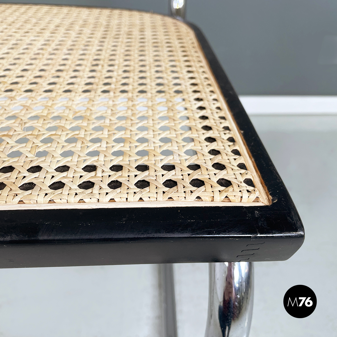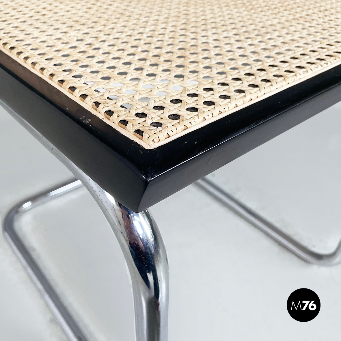Sedia in stile Cesca con seduta e schienale in paglia chiara di Vienna con profili in legno verniciato nero. La struttura è in tubolare d’acciaio. Riprende il disegno di Marcel Breuer.