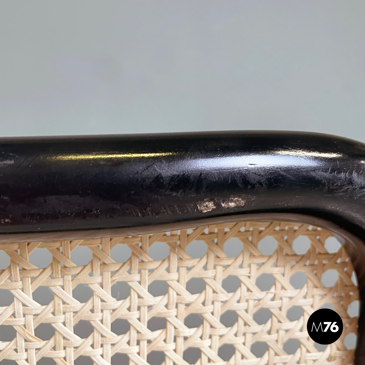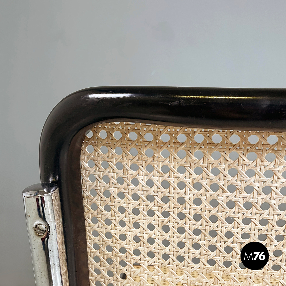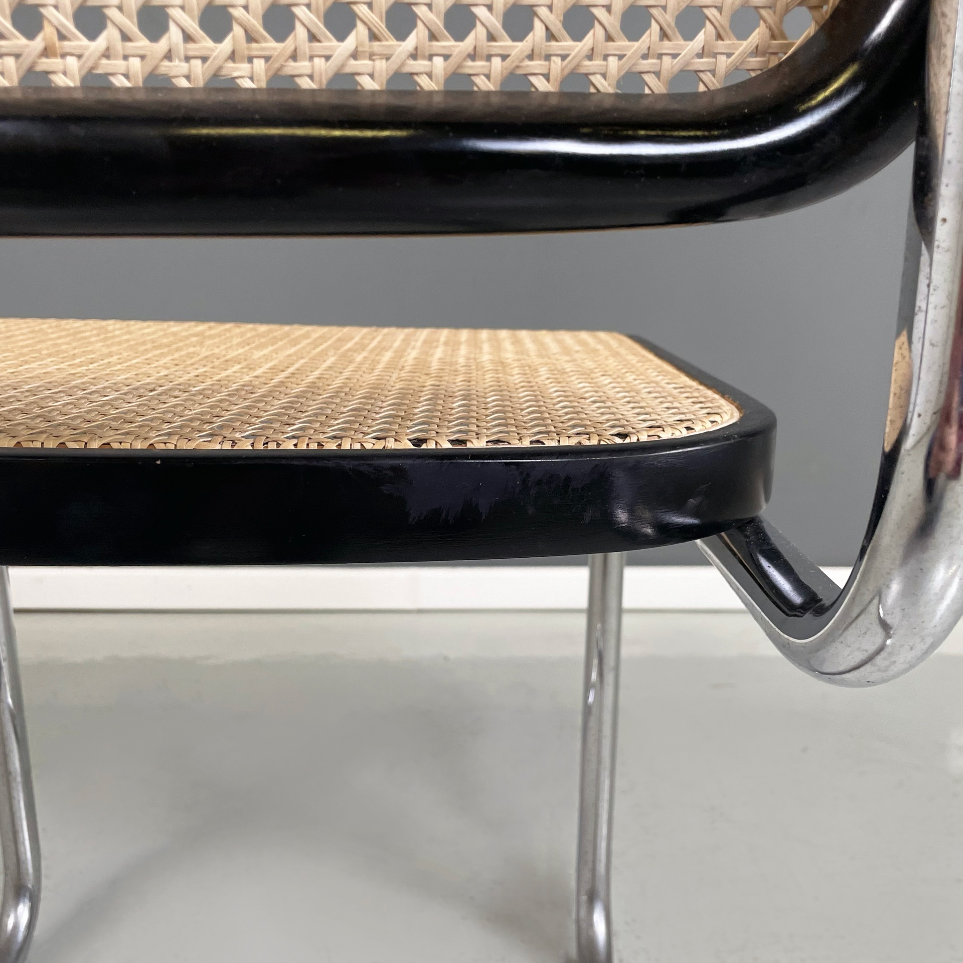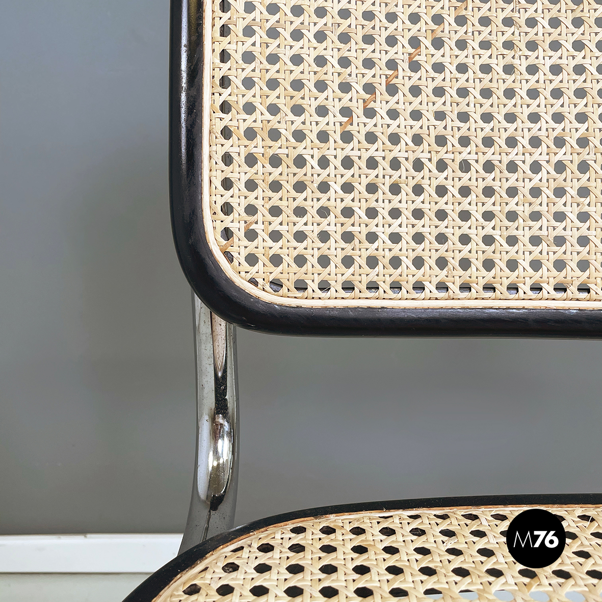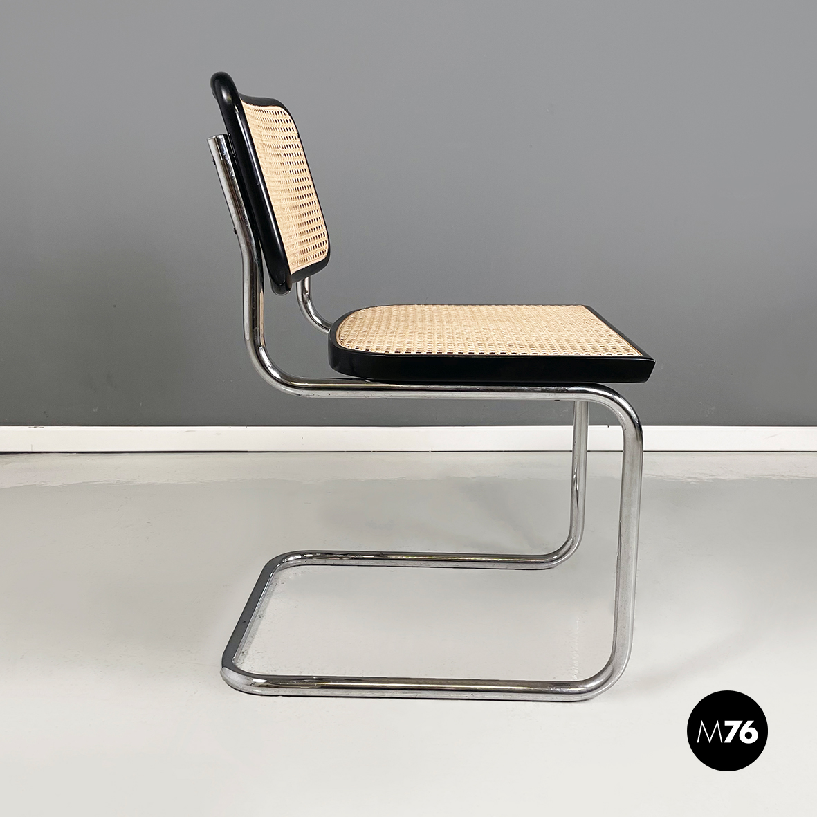Sedia in stile Cesca con seduta e schienale in paglia chiara di Vienna con profili in legno verniciato nero. La struttura è in tubolare d’acciaio. Riprende il disegno di Marcel Breuer.