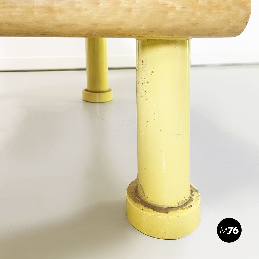 Sedia con seduta squadrata e schienale tondeggiante, imbottiti e rivestiti in velluto grigio. La struttura è composta da una parte in legno di radica e le quattro zampe a sezione tonda in metallo verniciato giallo.