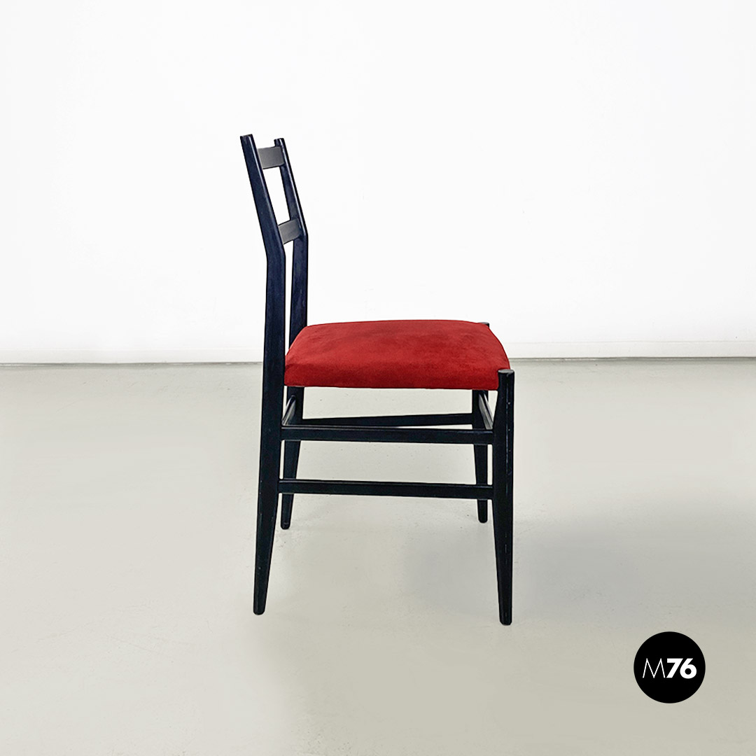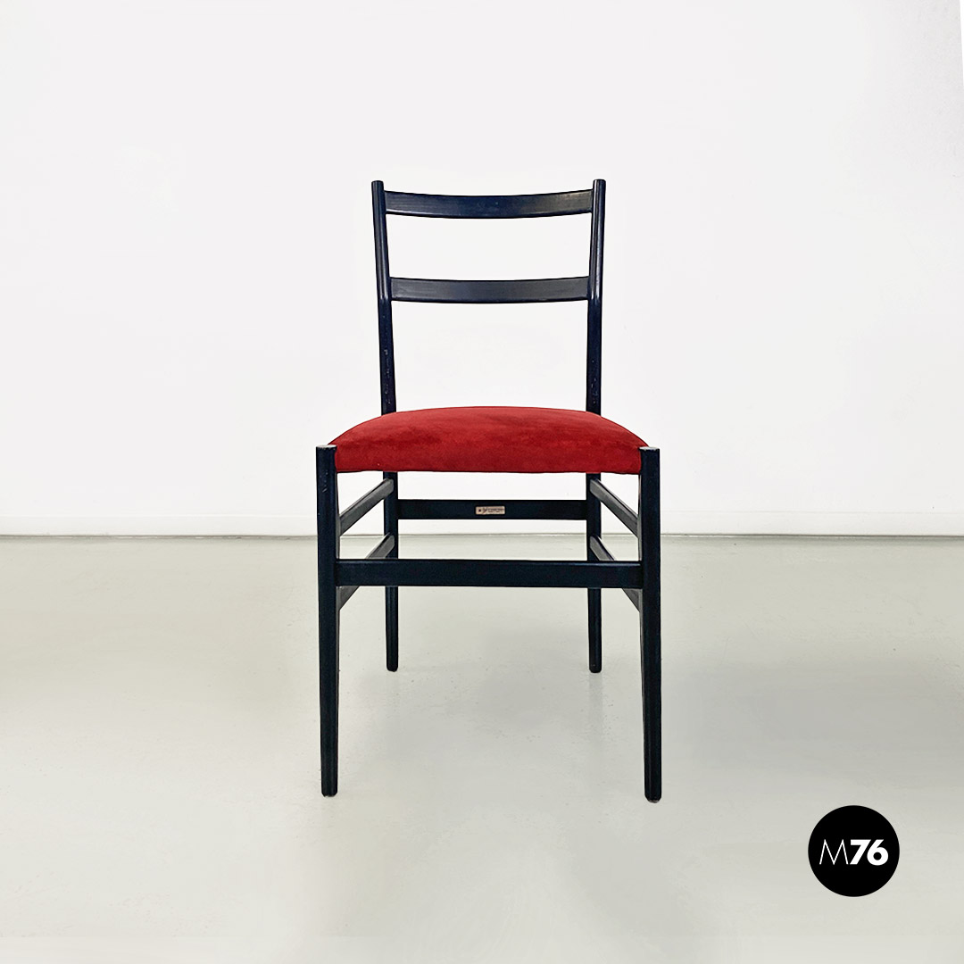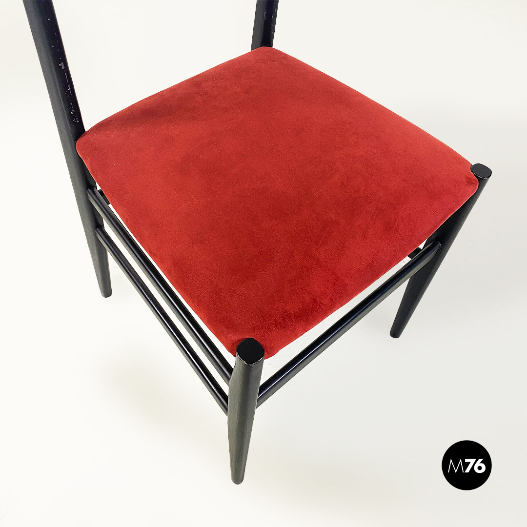Sedia modello Leggera con struttura in legno di faggio tinto nero, con seduta imbottita e rivestita in tessuto rosso.