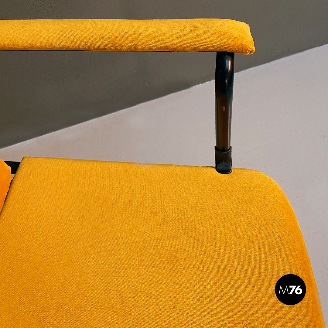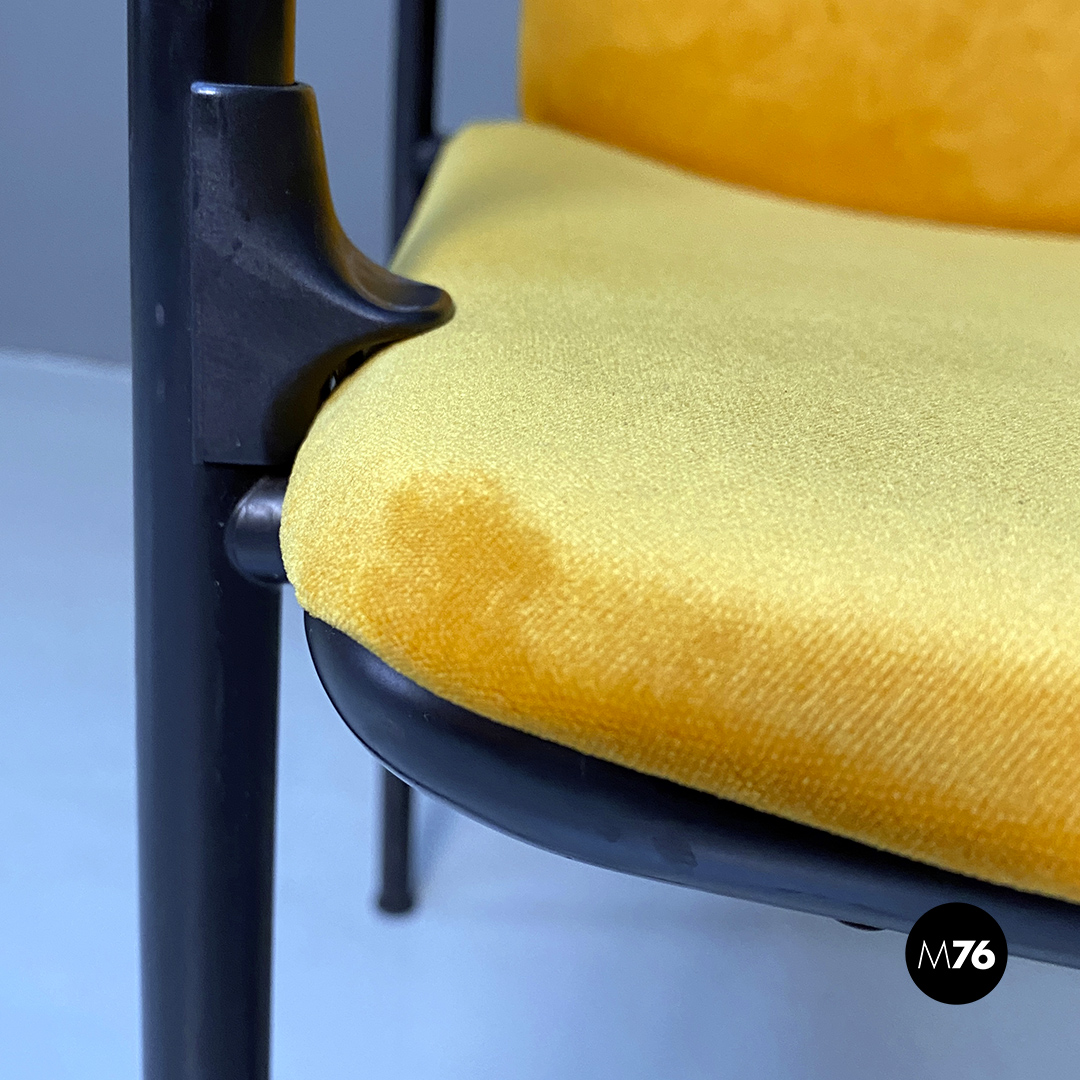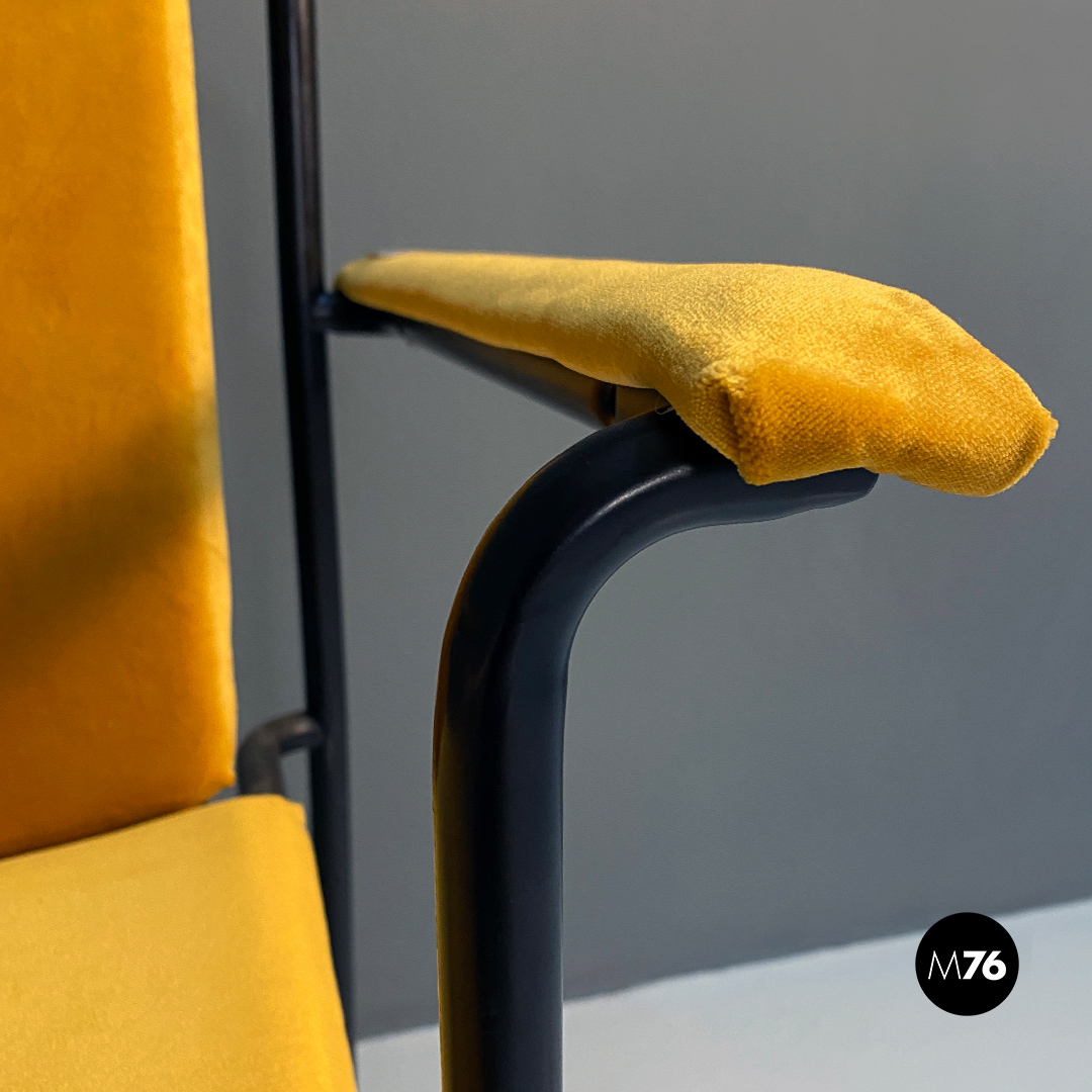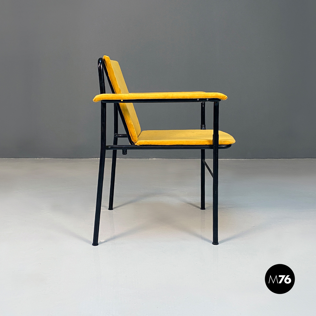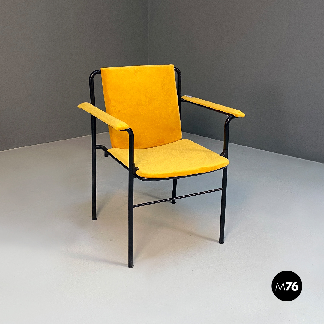 Sedia modello Movie con struttura in tubolare di acciaio nero con finitura opaca. La seduta, lo schienale e i braccioli sono leggermente imbottiti e rivestiti in tessuto giallo.