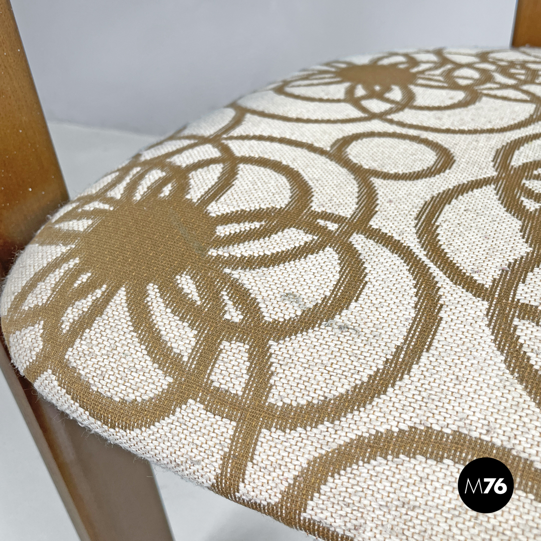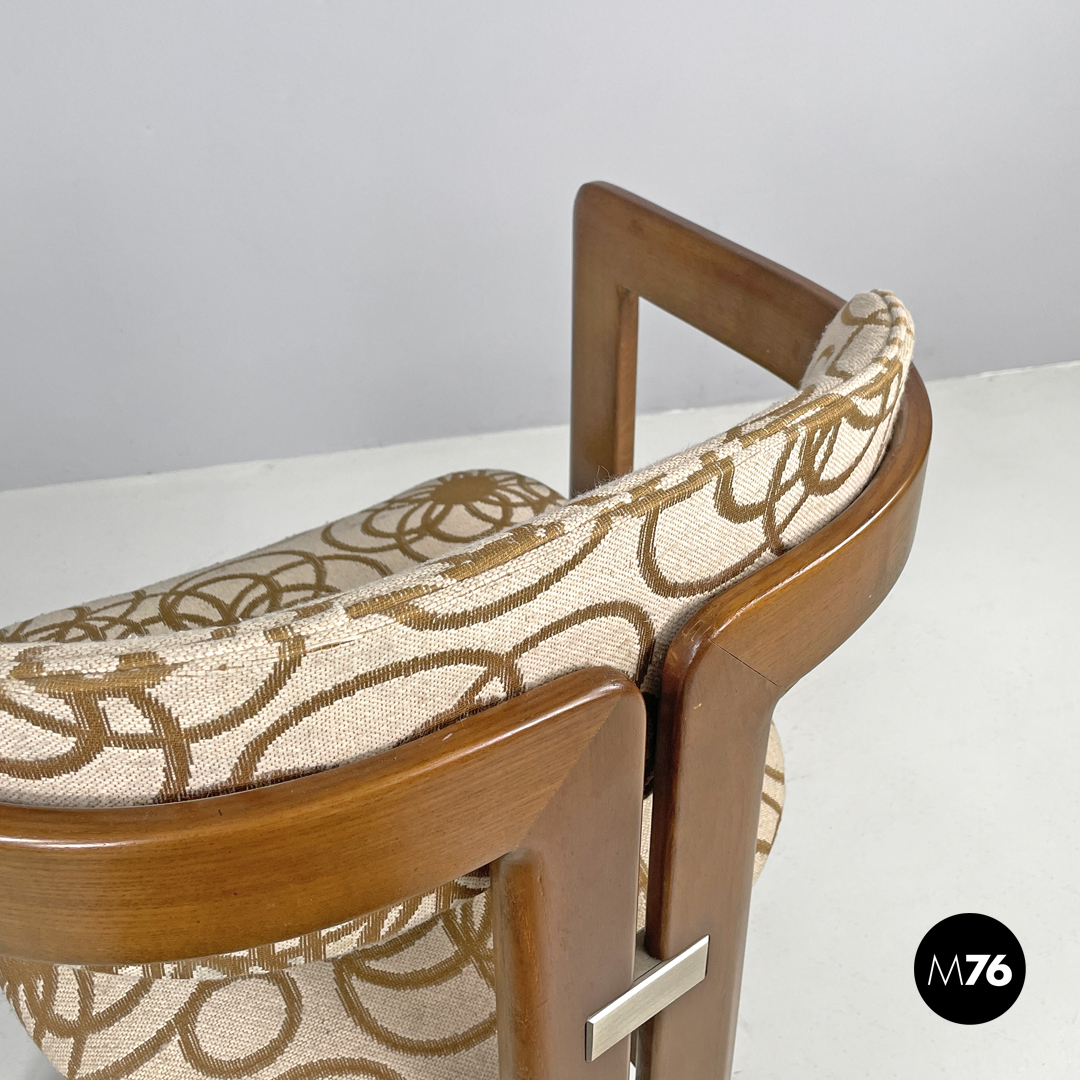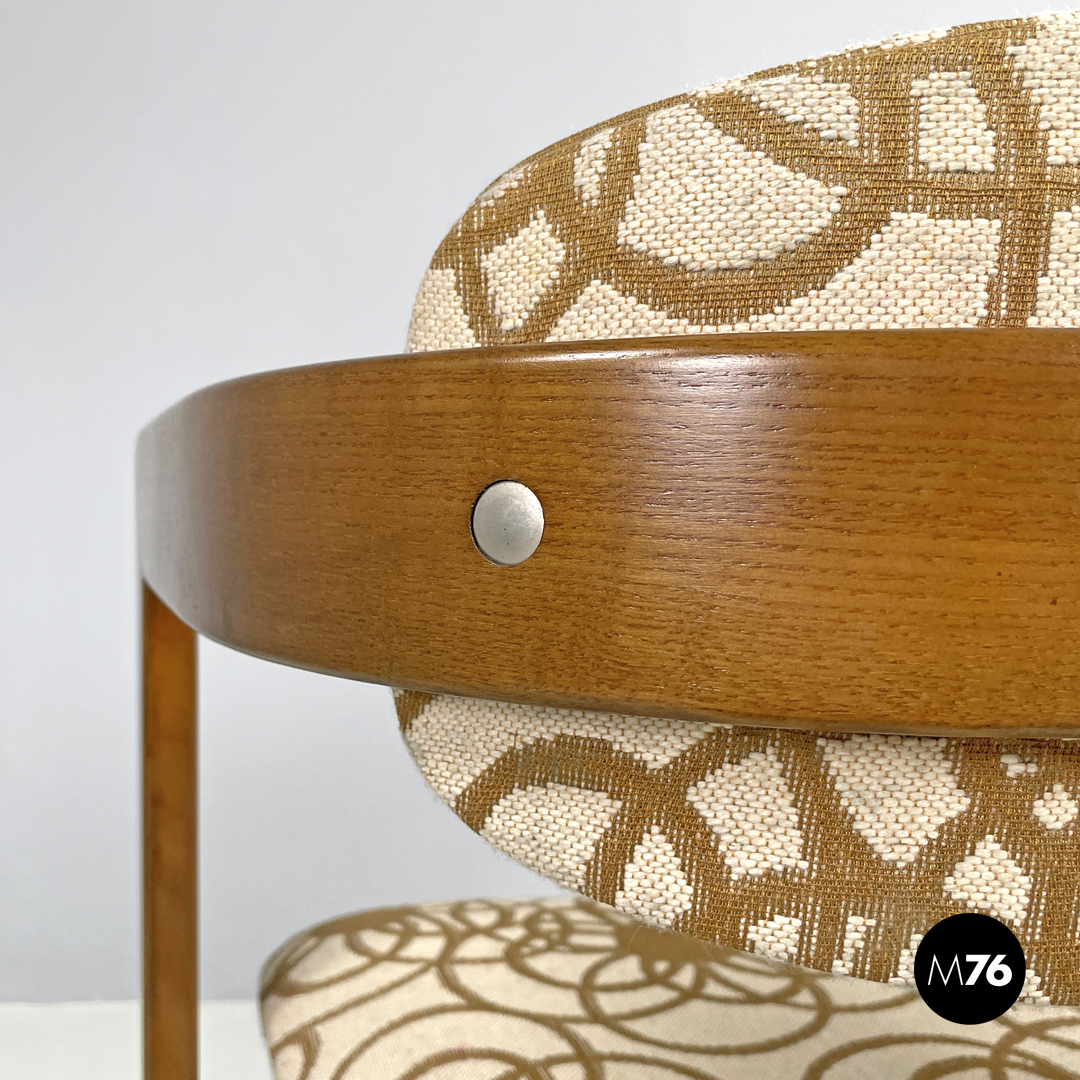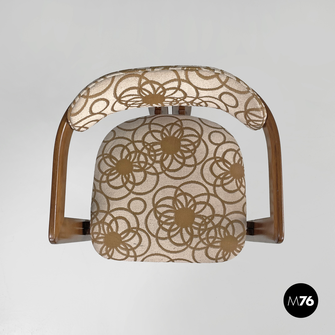 Sedia modello Pamplona a pozzetto in legno e tessuto. La struttura curva nella parte superiore a formare lo schienale e i braccioli. Le quattro gambe a sezione rettangolare sono due anteriori ai lati della struttura e due posteriori al centro. Lo schienale e la seduta sono tappezzate con tessuto a sfondo beige con decorazione floreale stilizzata marrone.