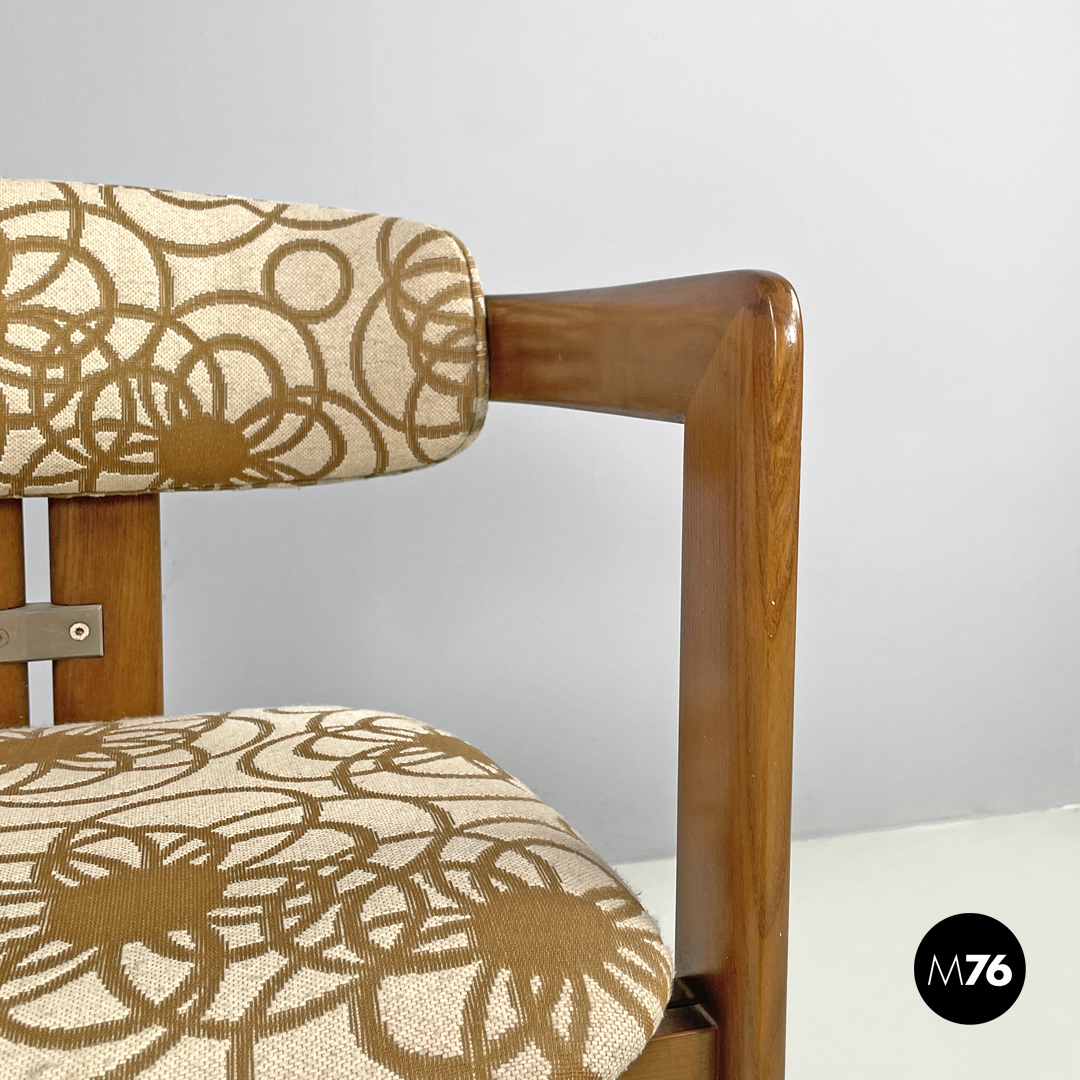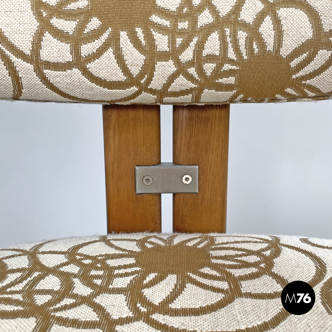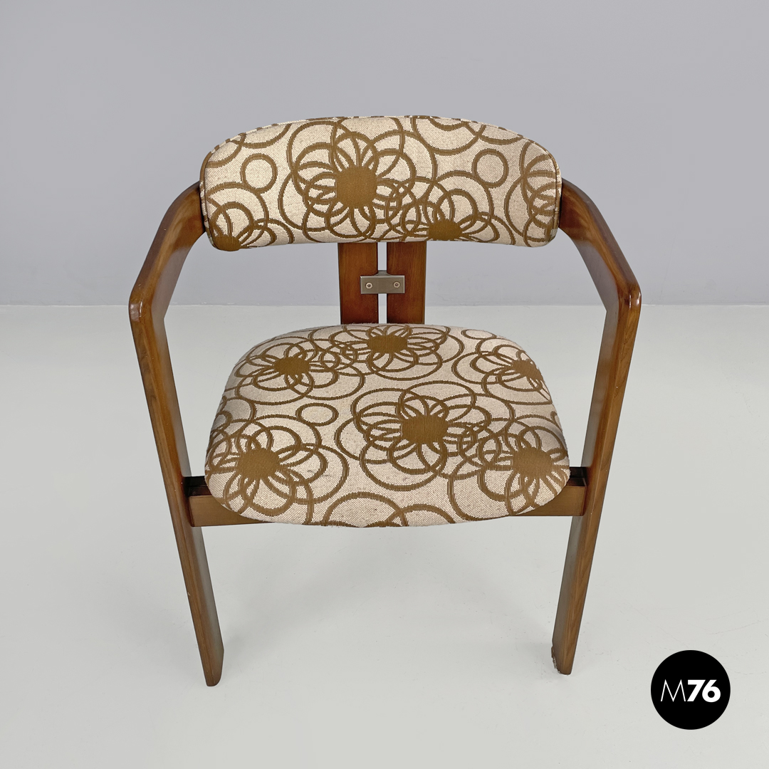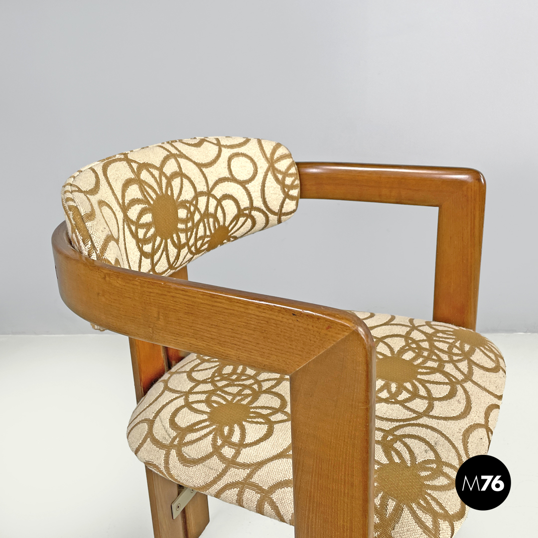 Sedia modello Pamplona a pozzetto in legno e tessuto. La struttura curva nella parte superiore a formare lo schienale e i braccioli. Le quattro gambe a sezione rettangolare sono due anteriori ai lati della struttura e due posteriori al centro. Lo schienale e la seduta sono tappezzate con tessuto a sfondo beige con decorazione floreale stilizzata marrone.