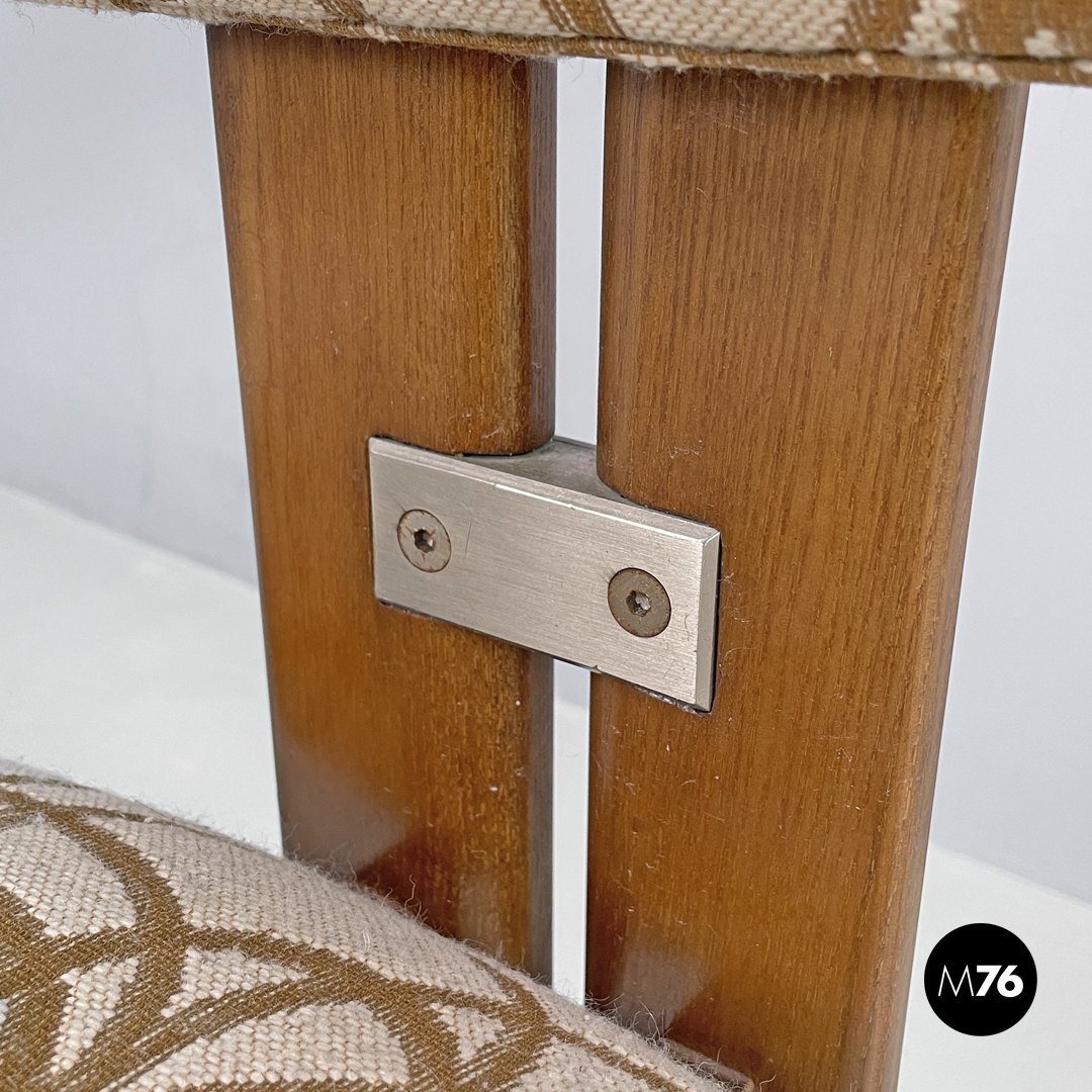 Buone condizioni, con segni dell’uso e del tempo, ossidazioni e piccoli segni di vernice bianca sul legno. Il tessuto della seduta presenta alcune macchie.