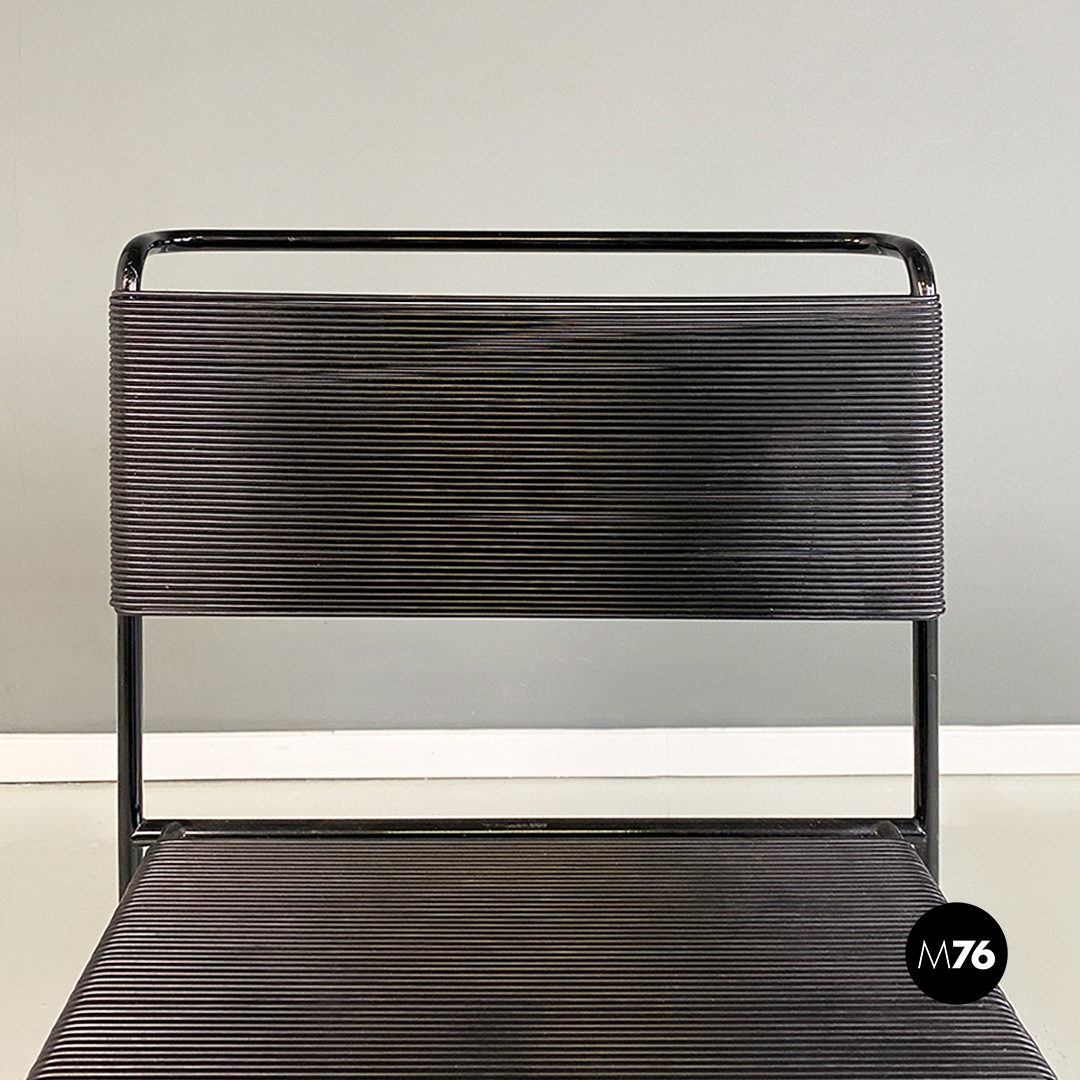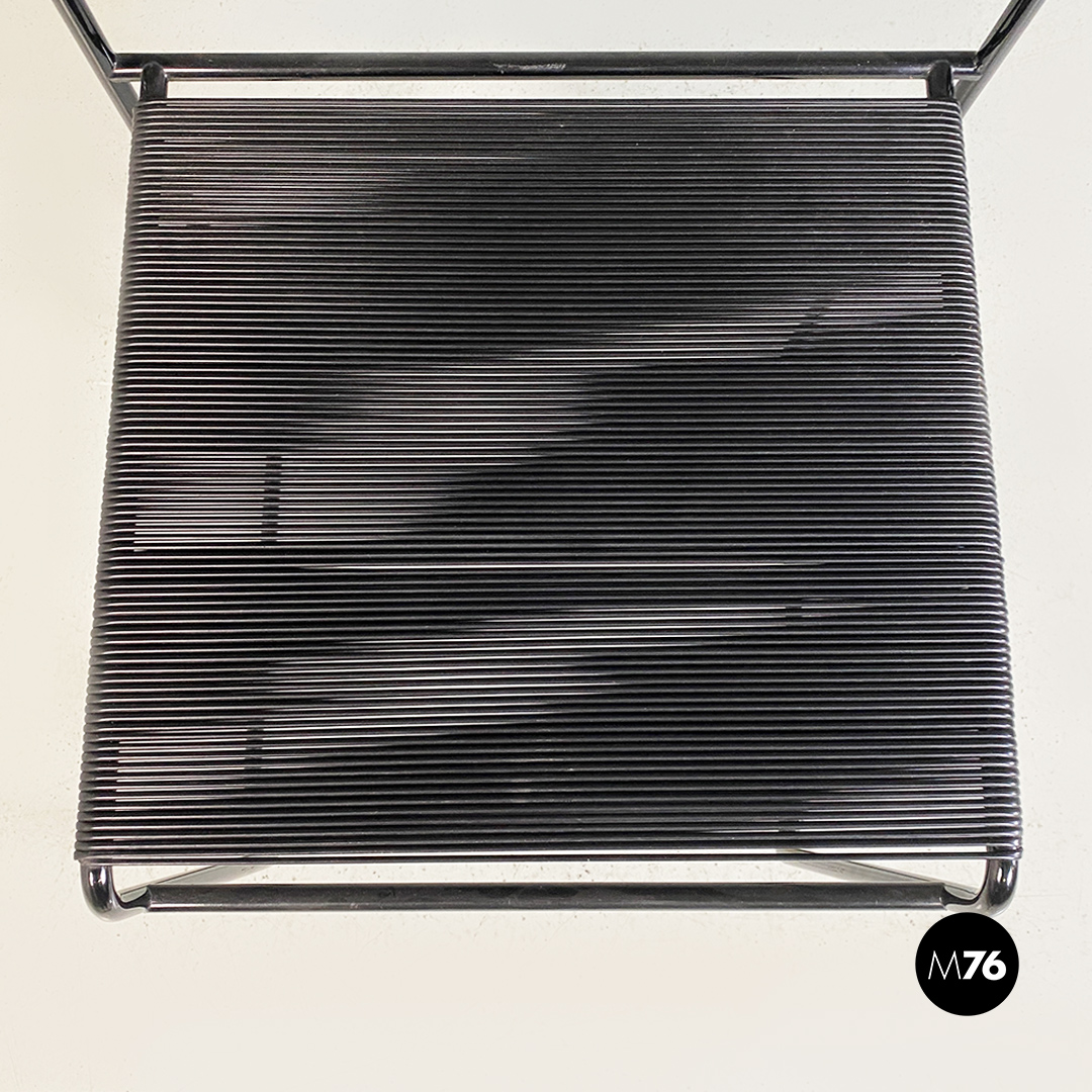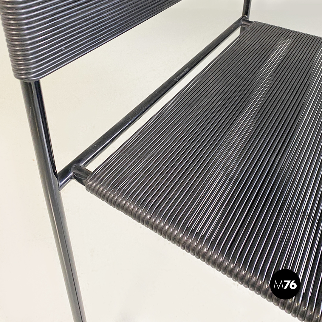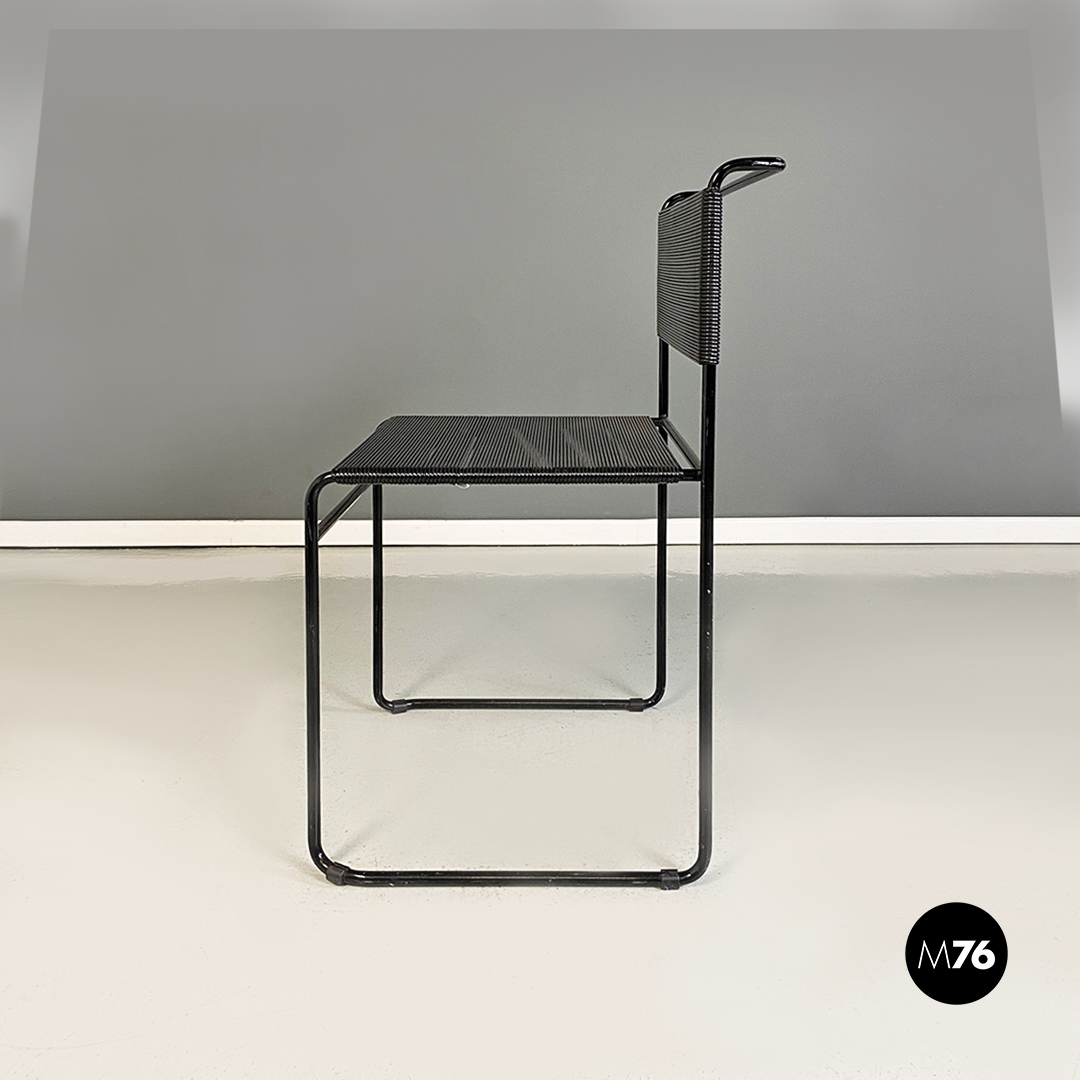 Sedia modello Spaghetti in tondino di metallo nero con seduta e schienale elastici realizzati da fili di scooby nero.