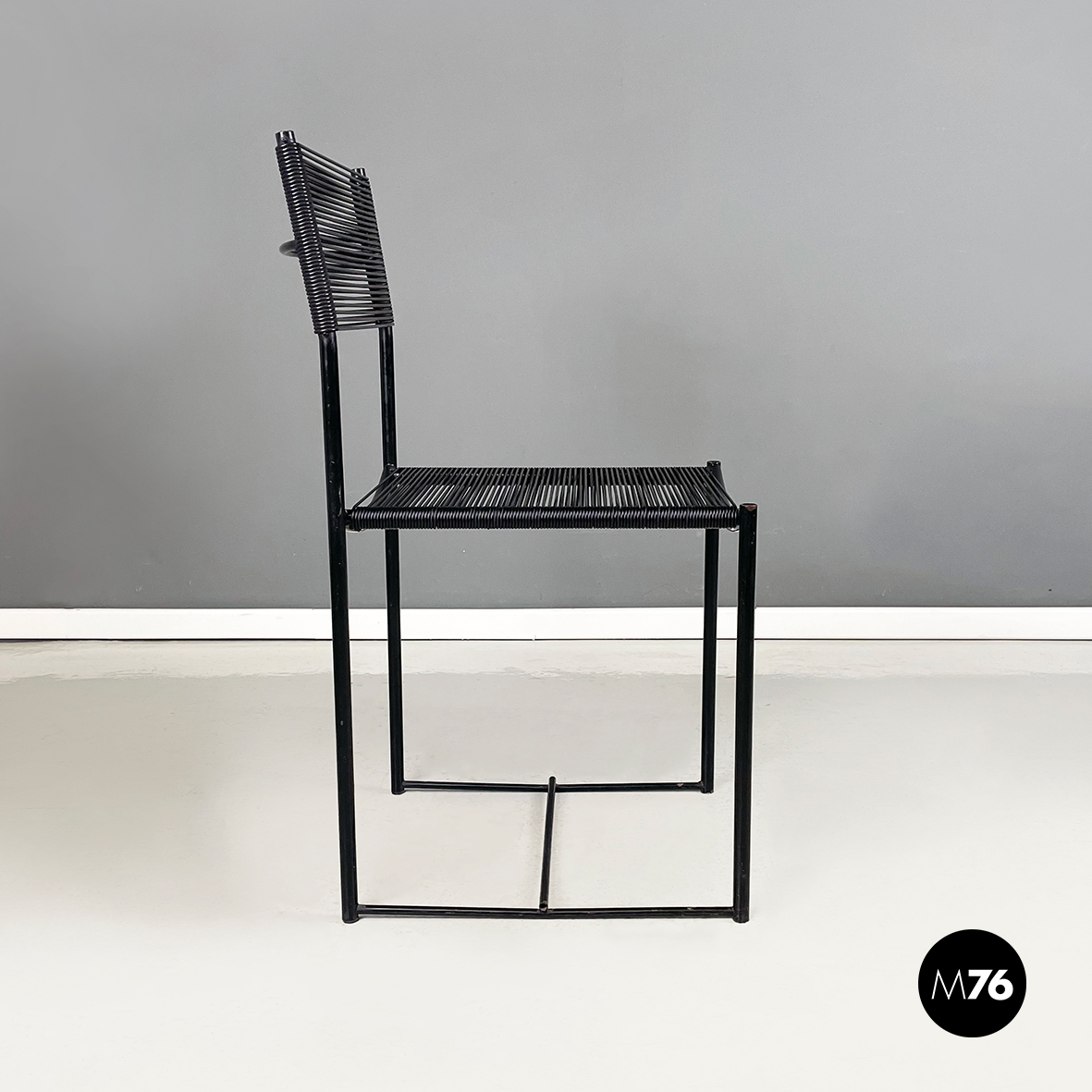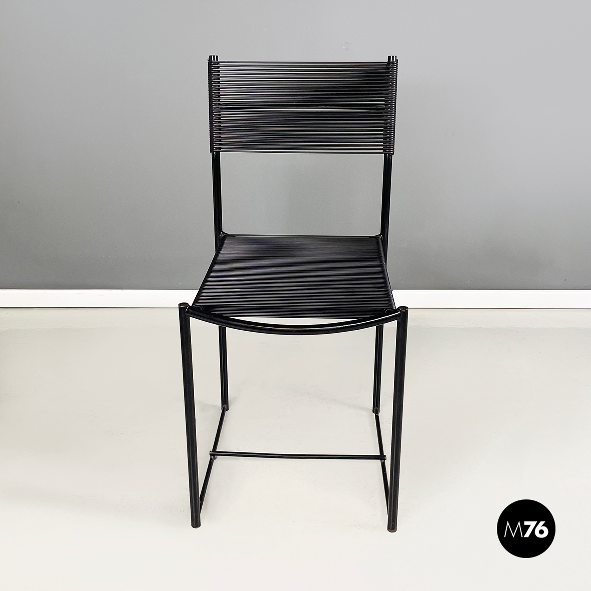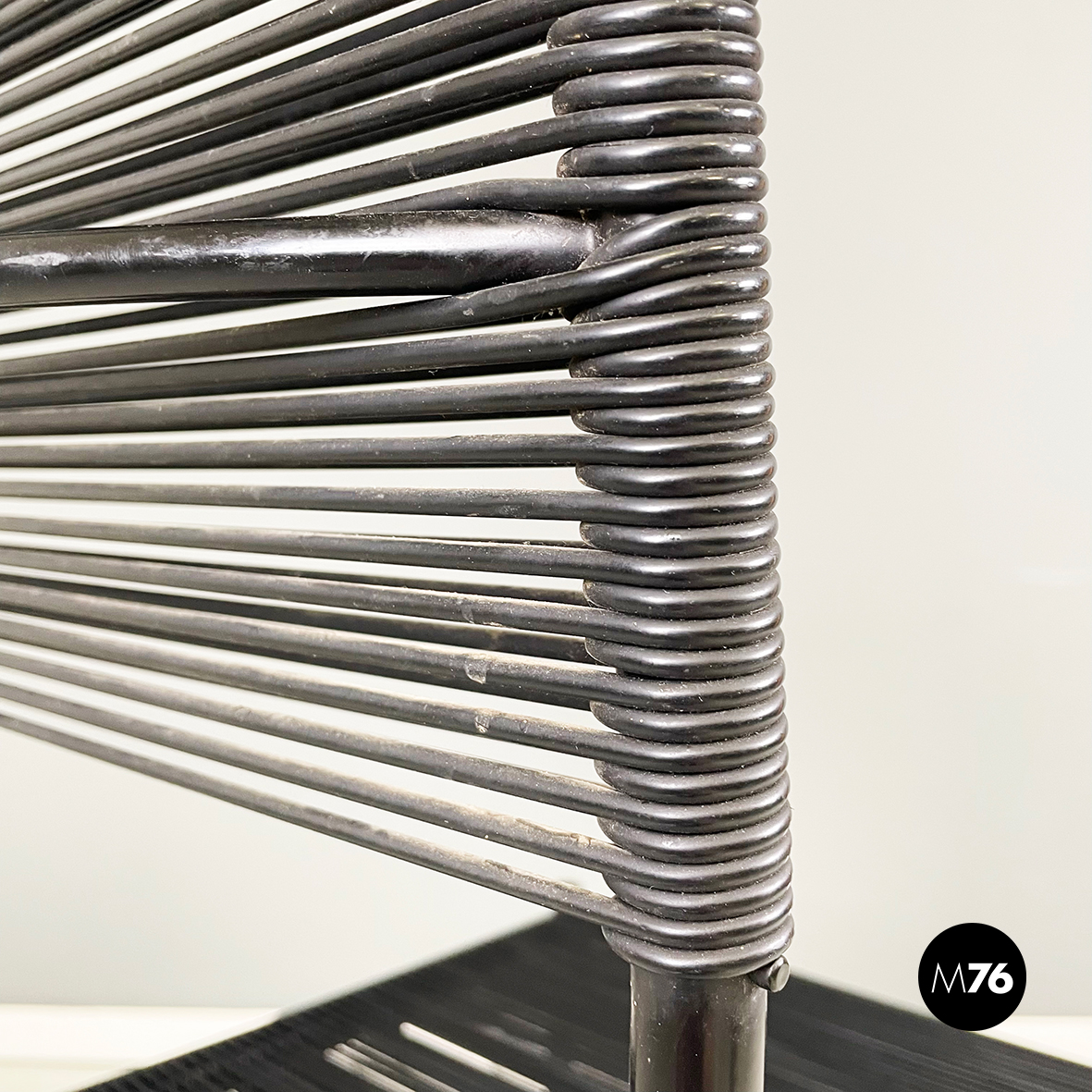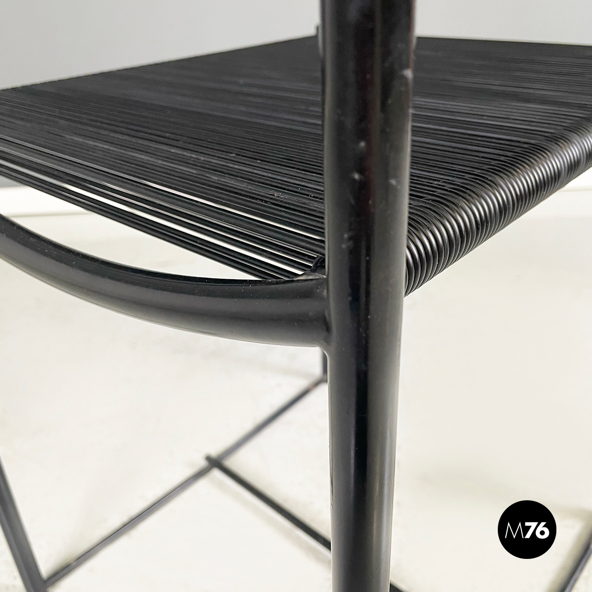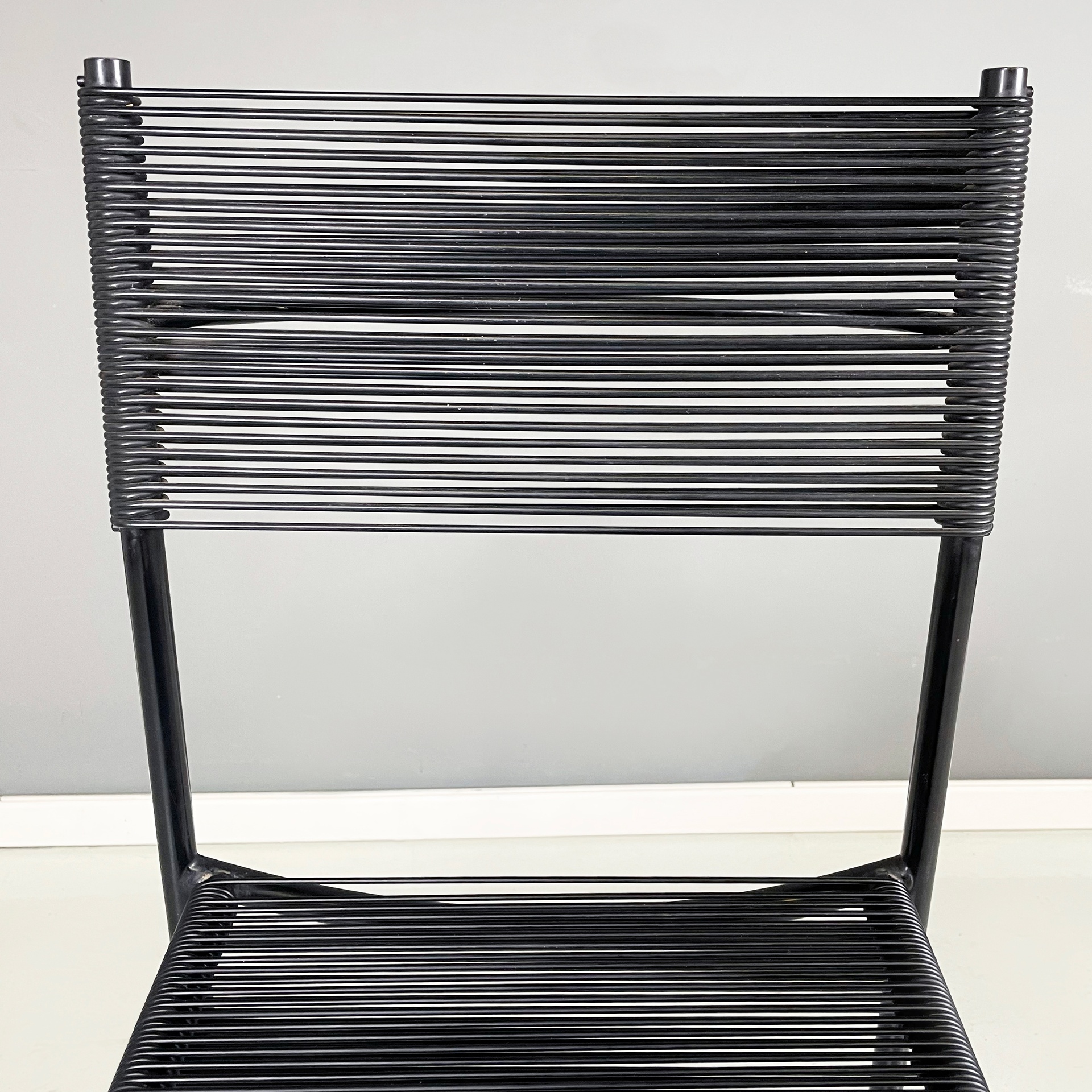Sedia modello Spaghetti con seduta e schienale rettangolari ed elastici realizzati da fili di scooby nero. La struttura è in tondino di metallo verniciato nero con manico curvato dietro lo schienale.