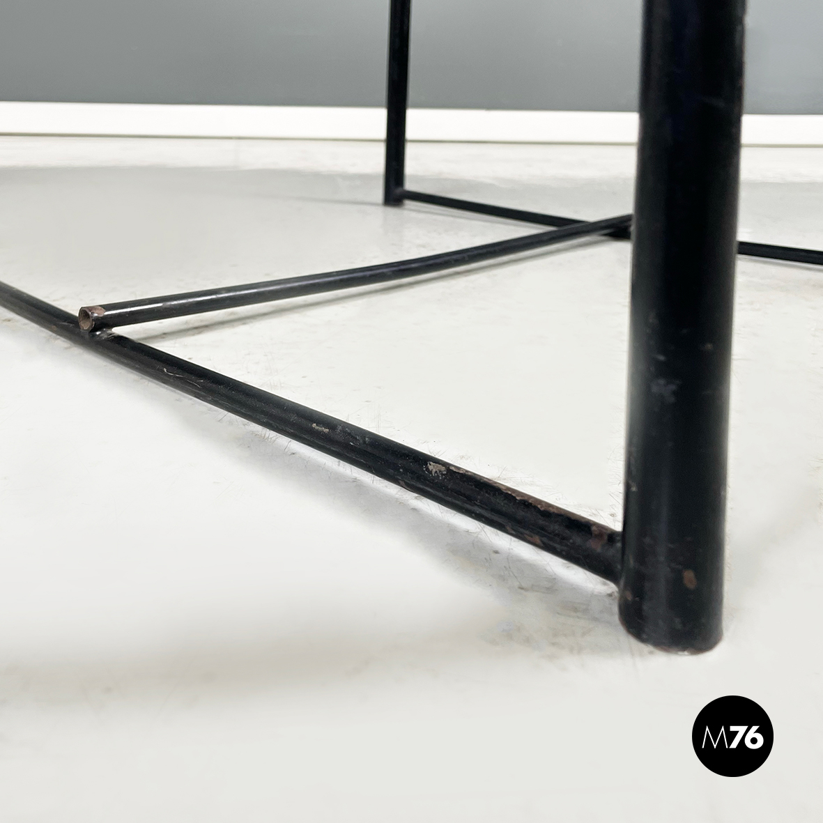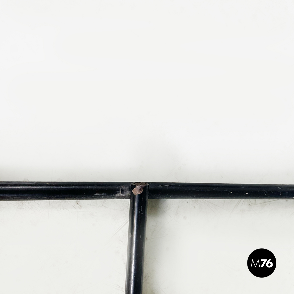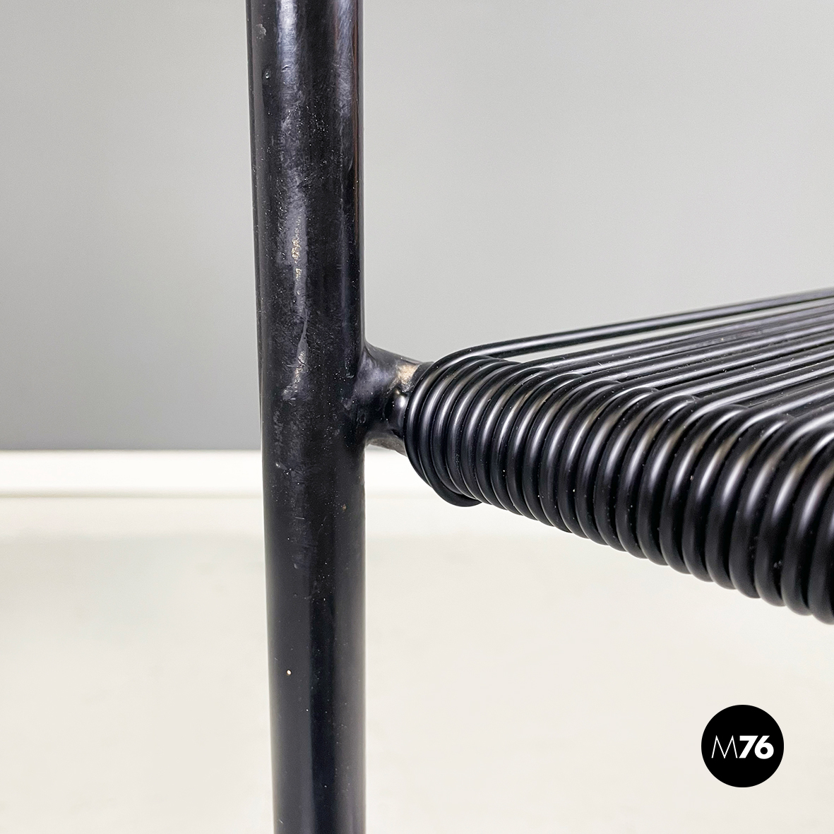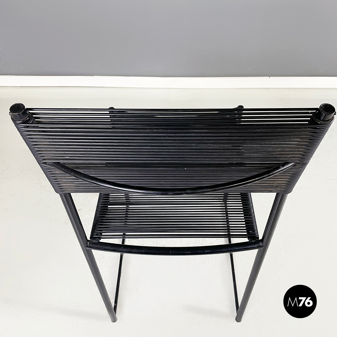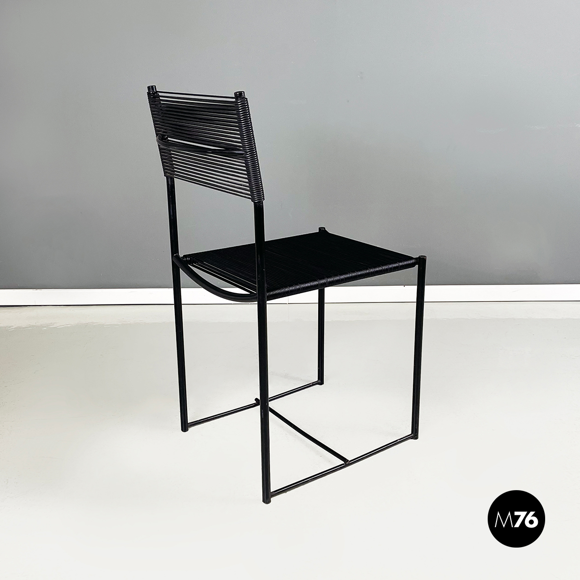 Sedia modello Spaghetti con seduta e schienale rettangolari ed elastici realizzati da fili di scooby nero. La struttura è in tondino di metallo verniciato nero con manico curvato dietro lo schienale.