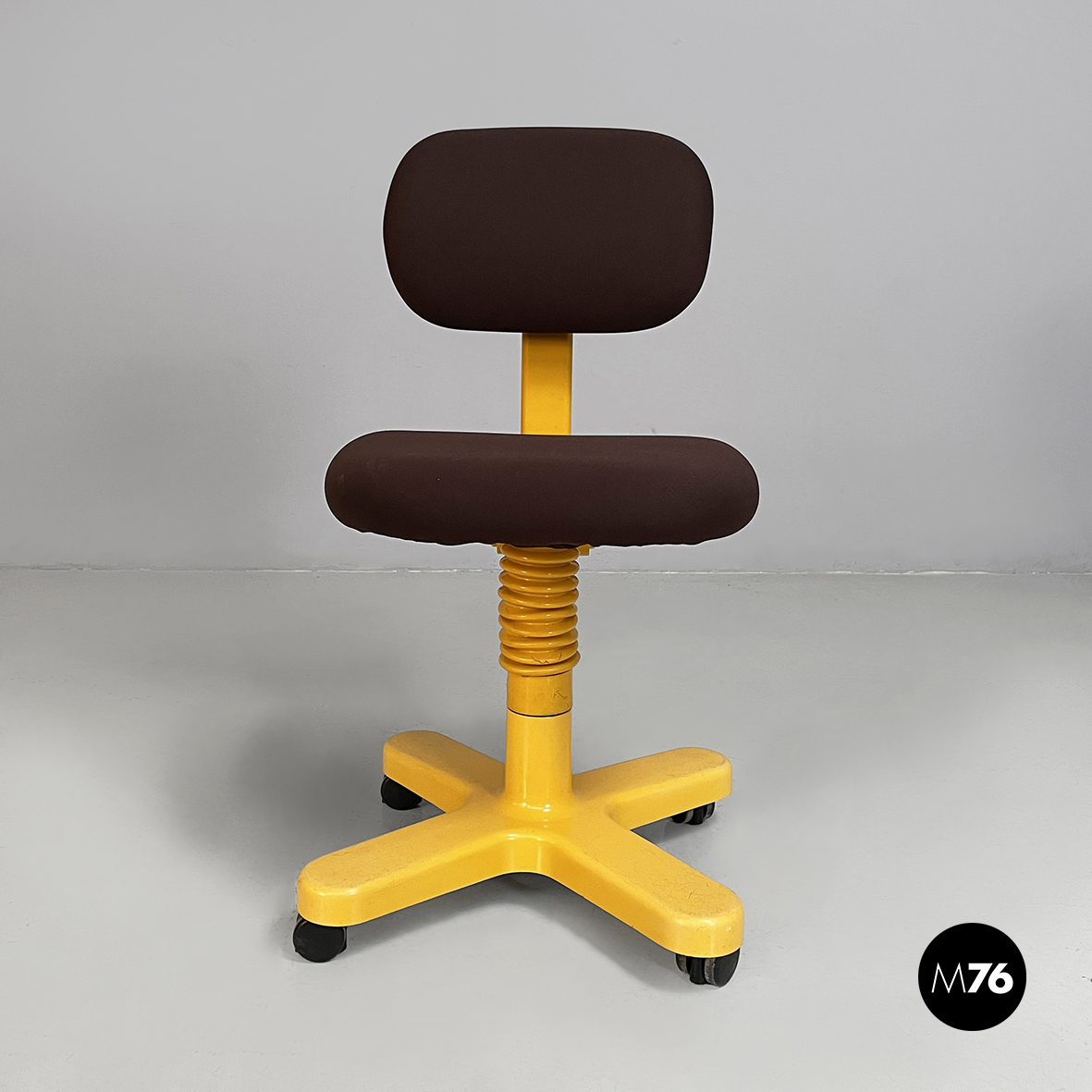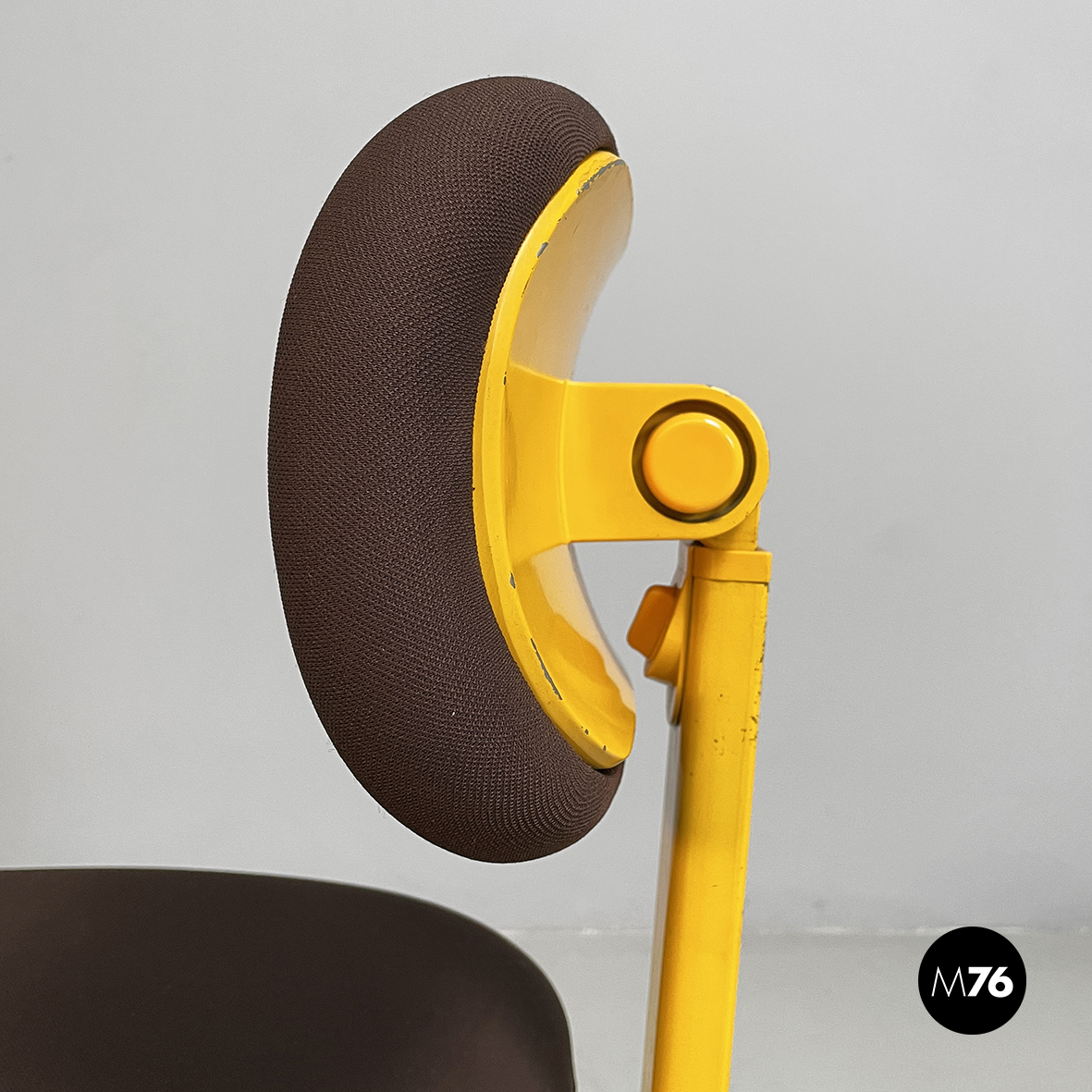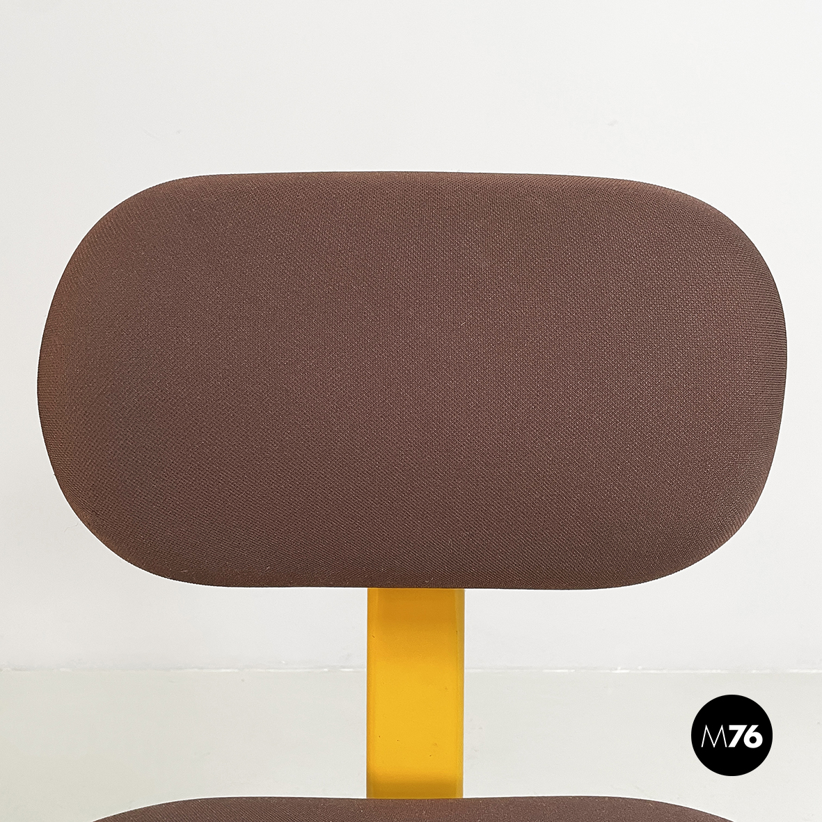 Sedia da scrivania modello Synthesis 45 con seduta e schienale imbottiti e rivestiti in tessuto marrone. La struttura che collega schienale e seduta è in metallo verniciato giallo con dettagli in plastica gialla. La base presenta quattro razze in metallo verniciato giallo.
