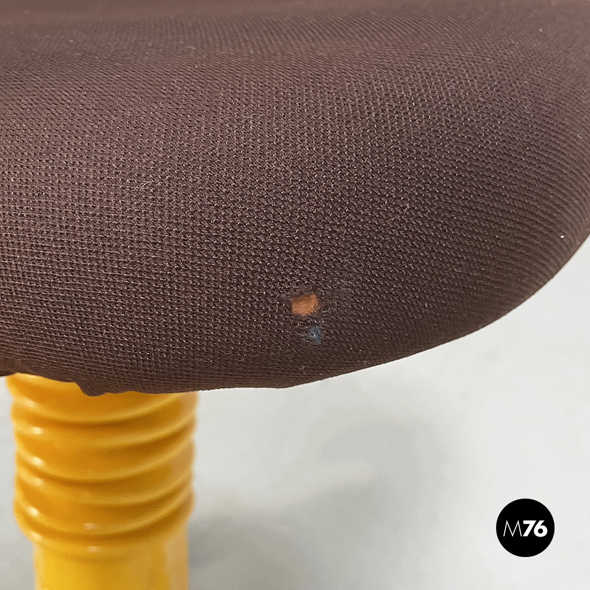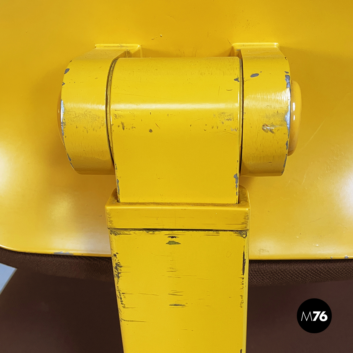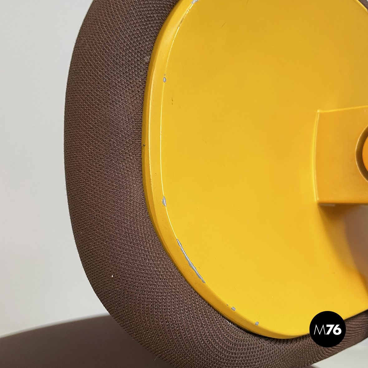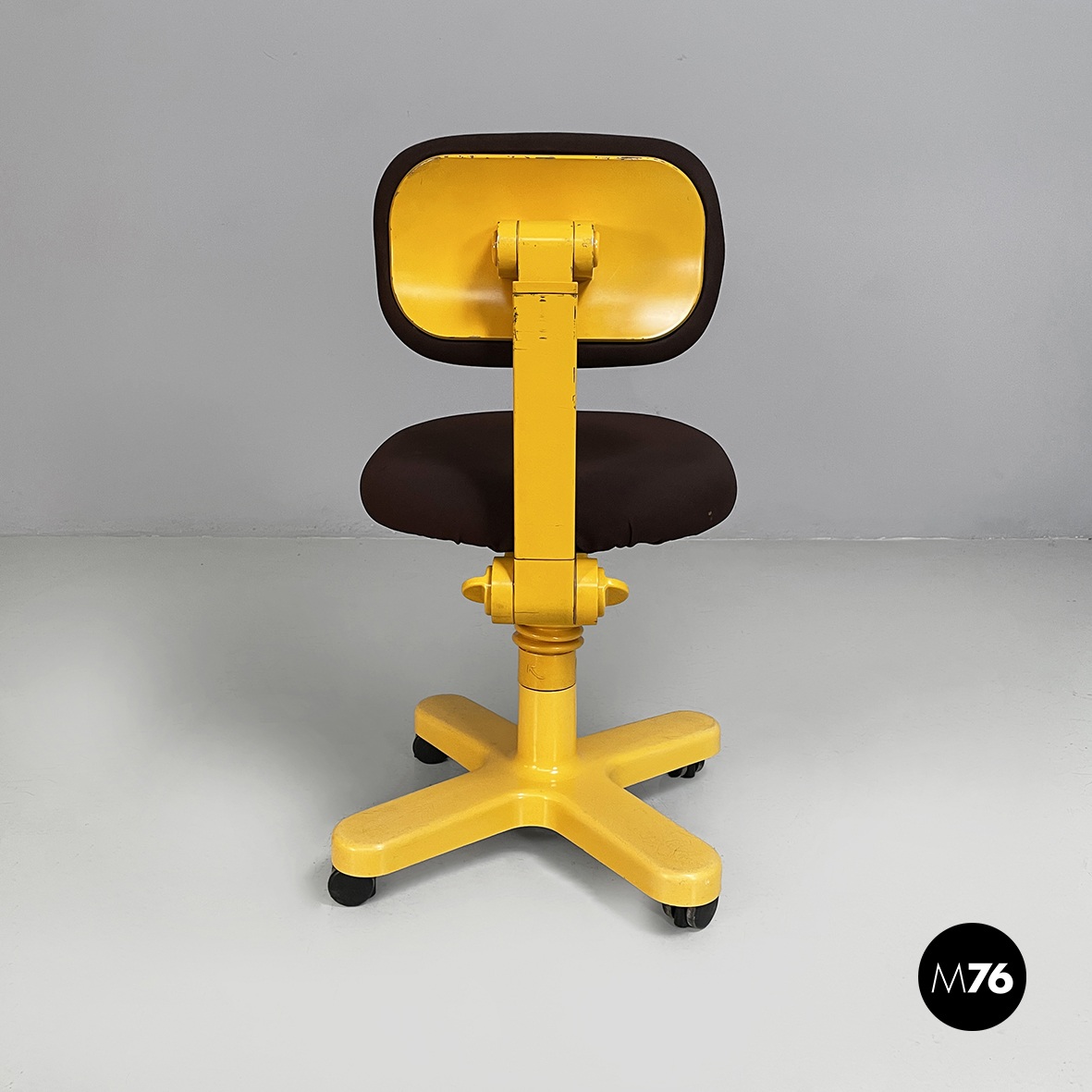 Sedia da scrivania modello Synthesis 45 con seduta e schienale imbottiti e rivestiti in tessuto marrone. La struttura che collega schienale e seduta è in metallo verniciato giallo con dettagli in plastica gialla. La base presenta quattro razze in metallo verniciato giallo.