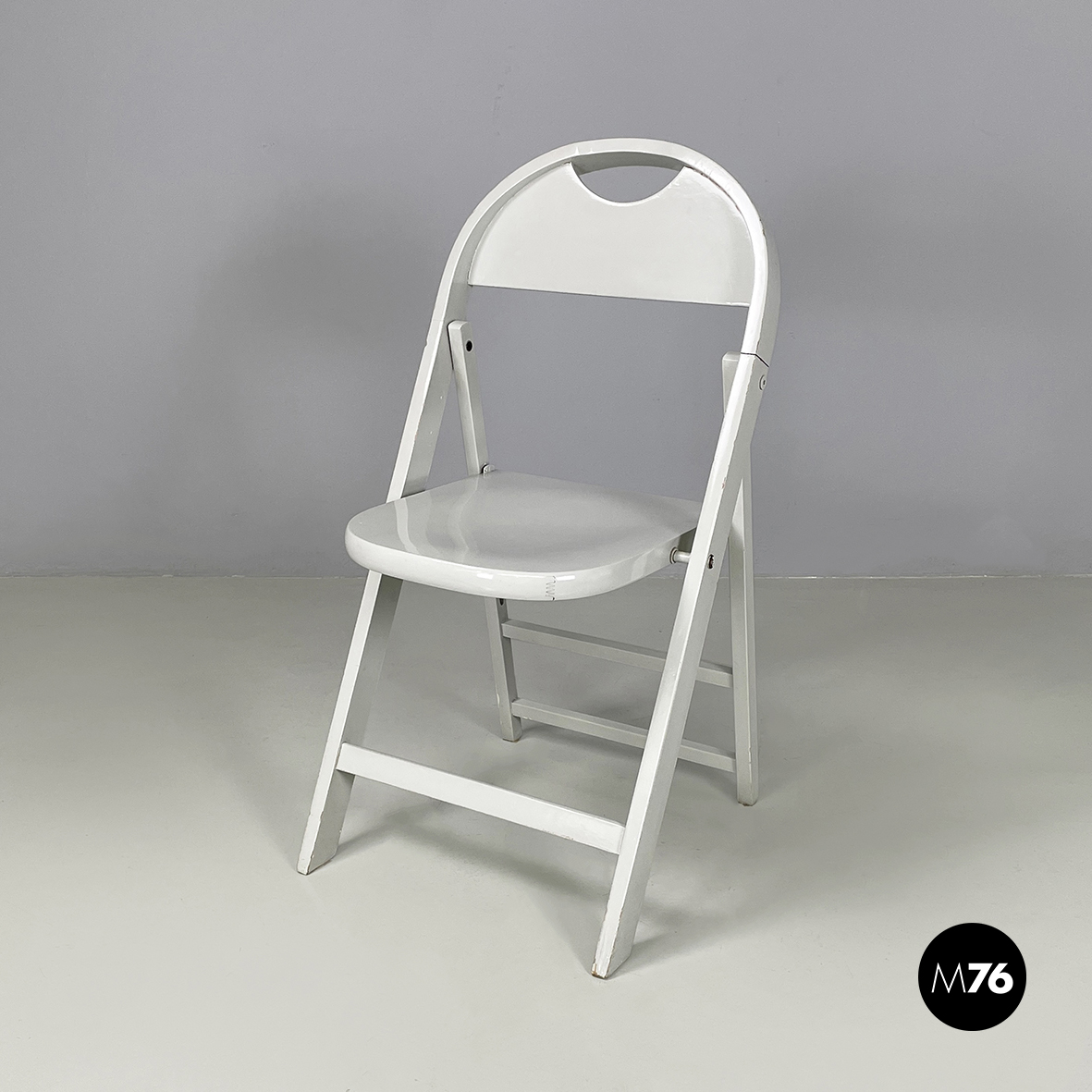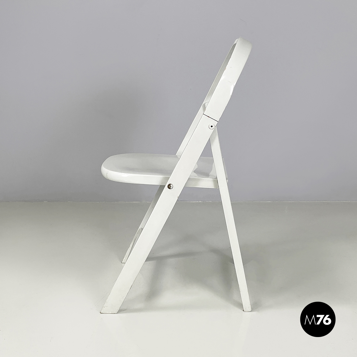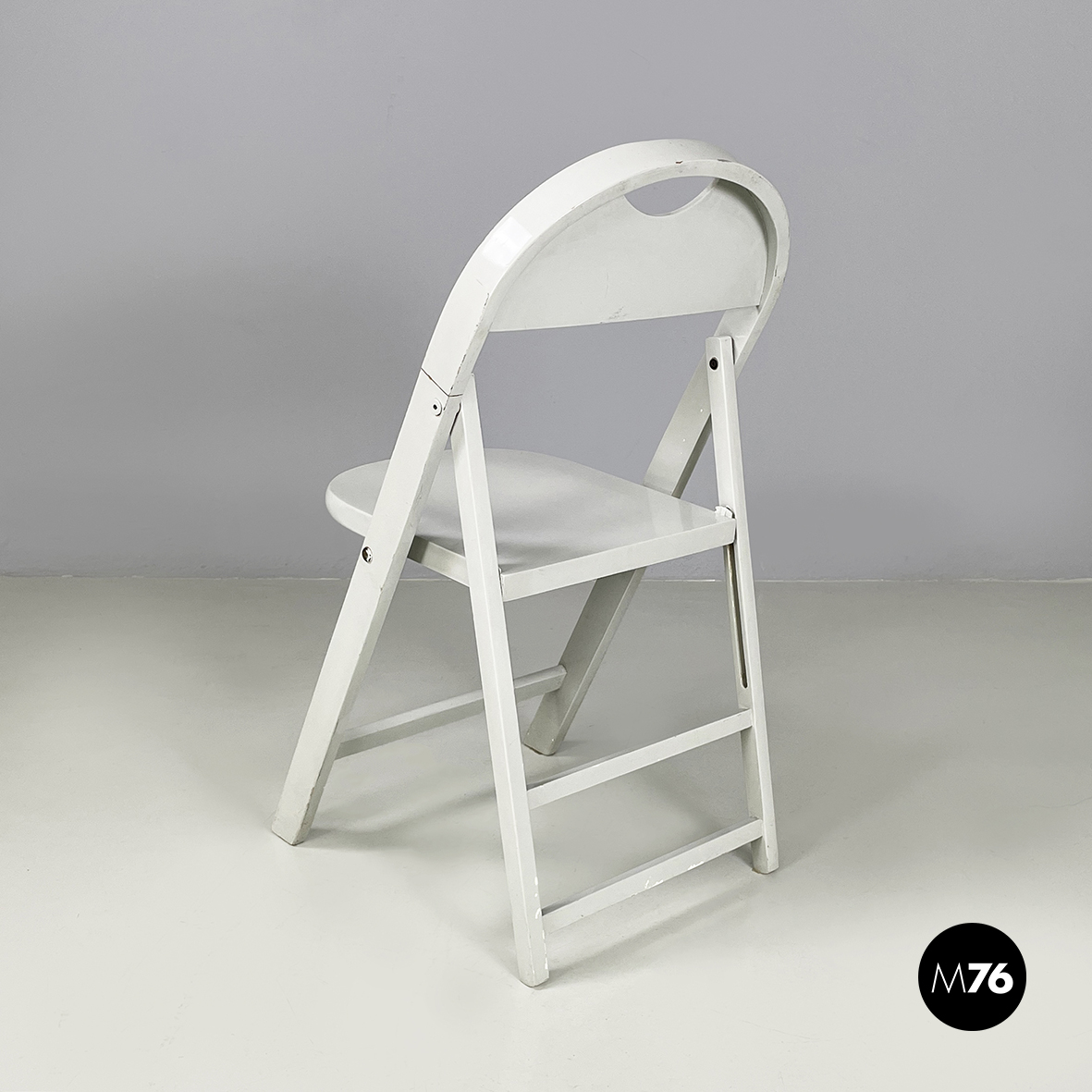 Sedia pieghevole modello Tric interamente in legno verniciato in grigio chiaro. La seduta e lo schienale sono di forma tondeggiante. Le zampe sono a sezione rettangolare.