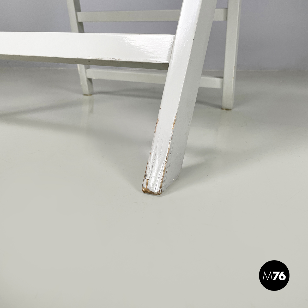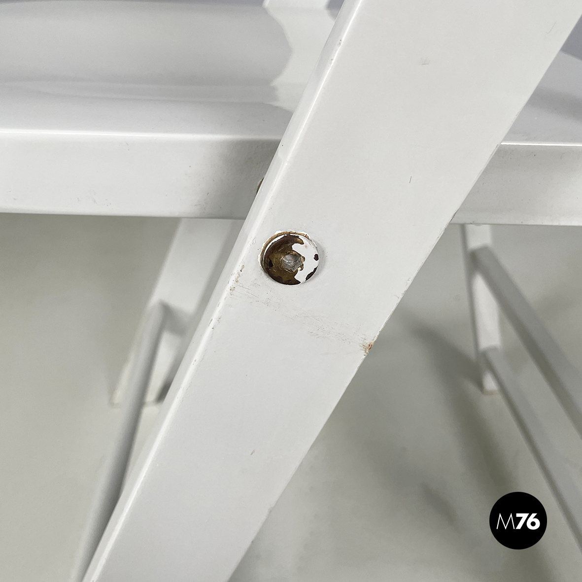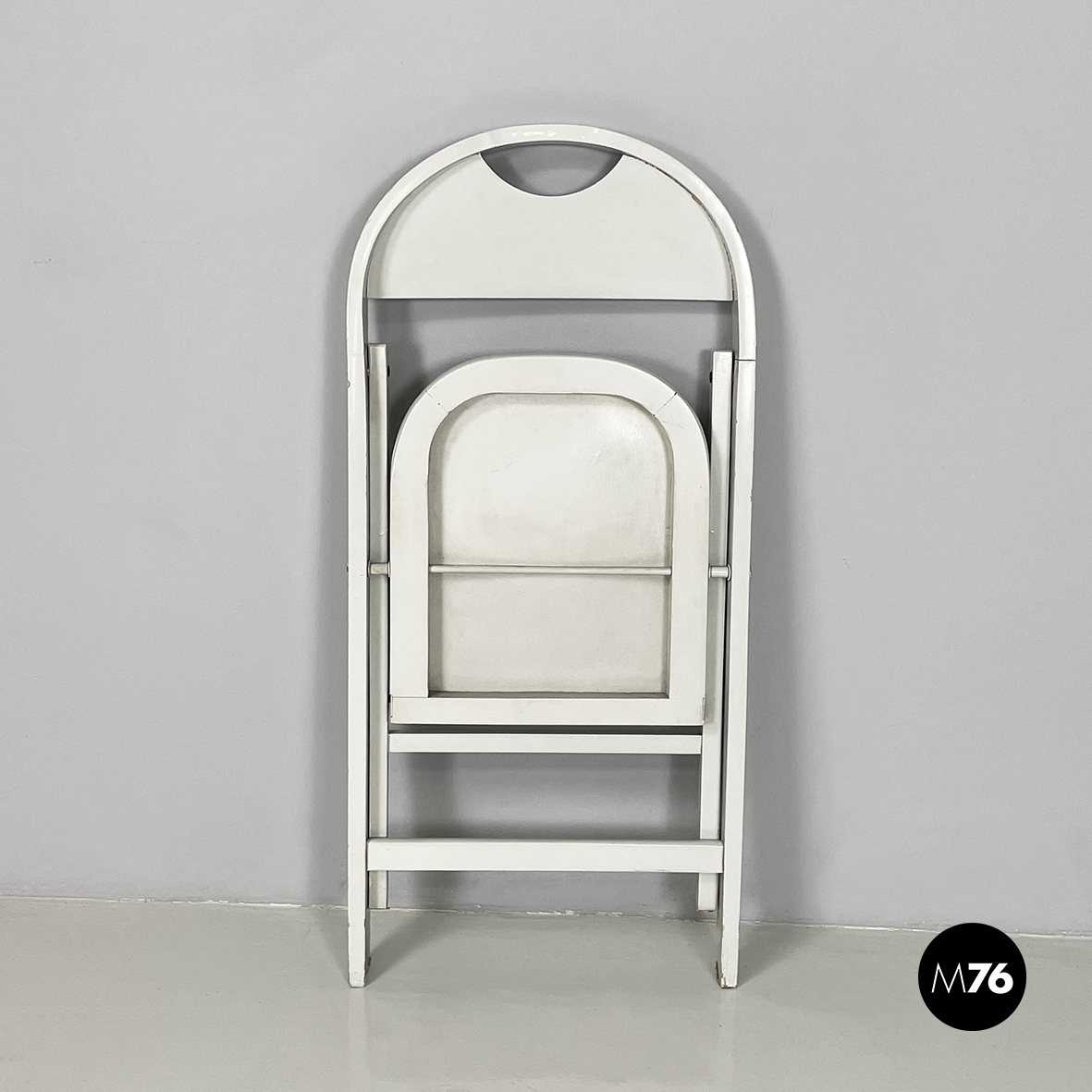 Sedia pieghevole modello Tric interamente in legno verniciato in grigio chiaro. La seduta e lo schienale sono di forma tondeggiante. Le zampe sono a sezione rettangolare.