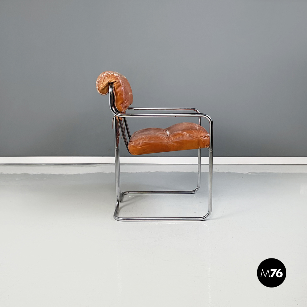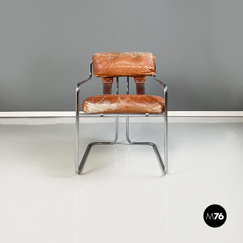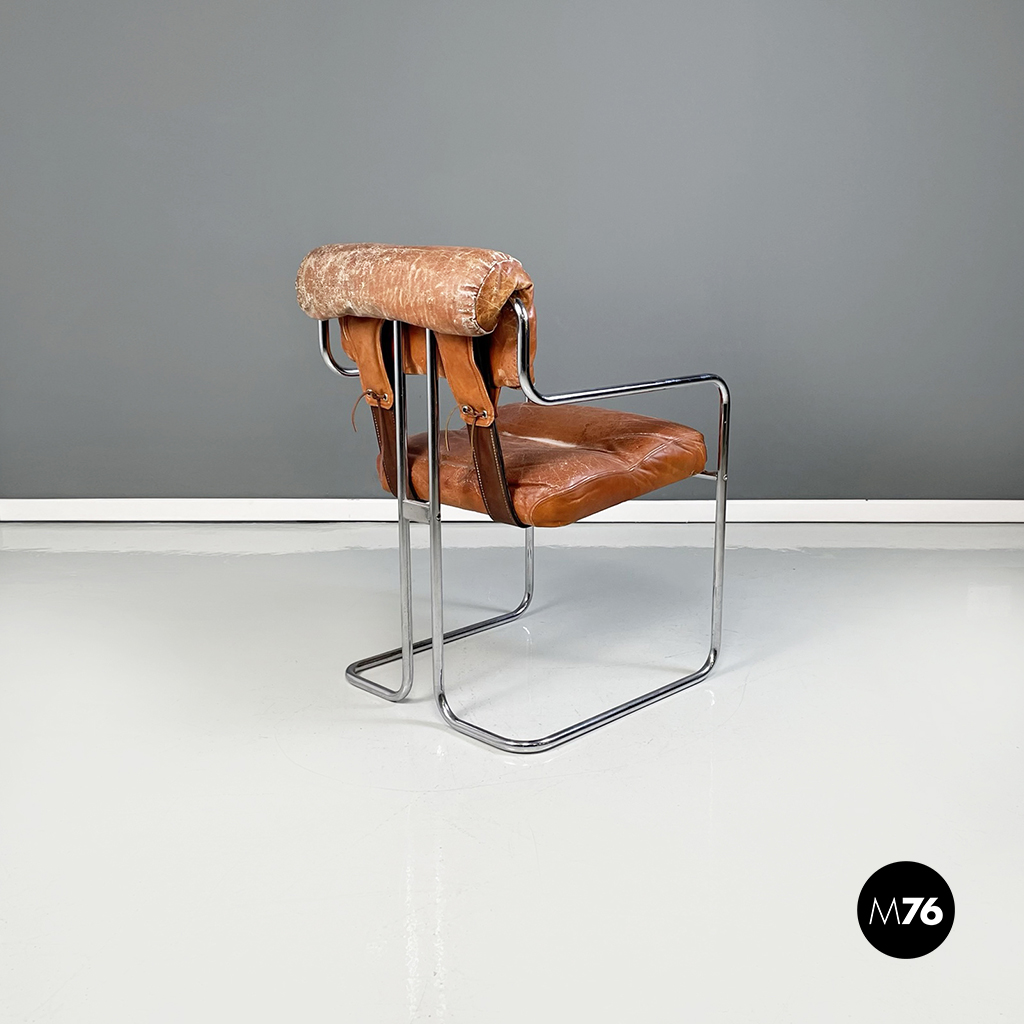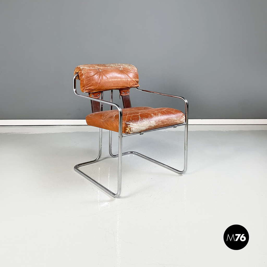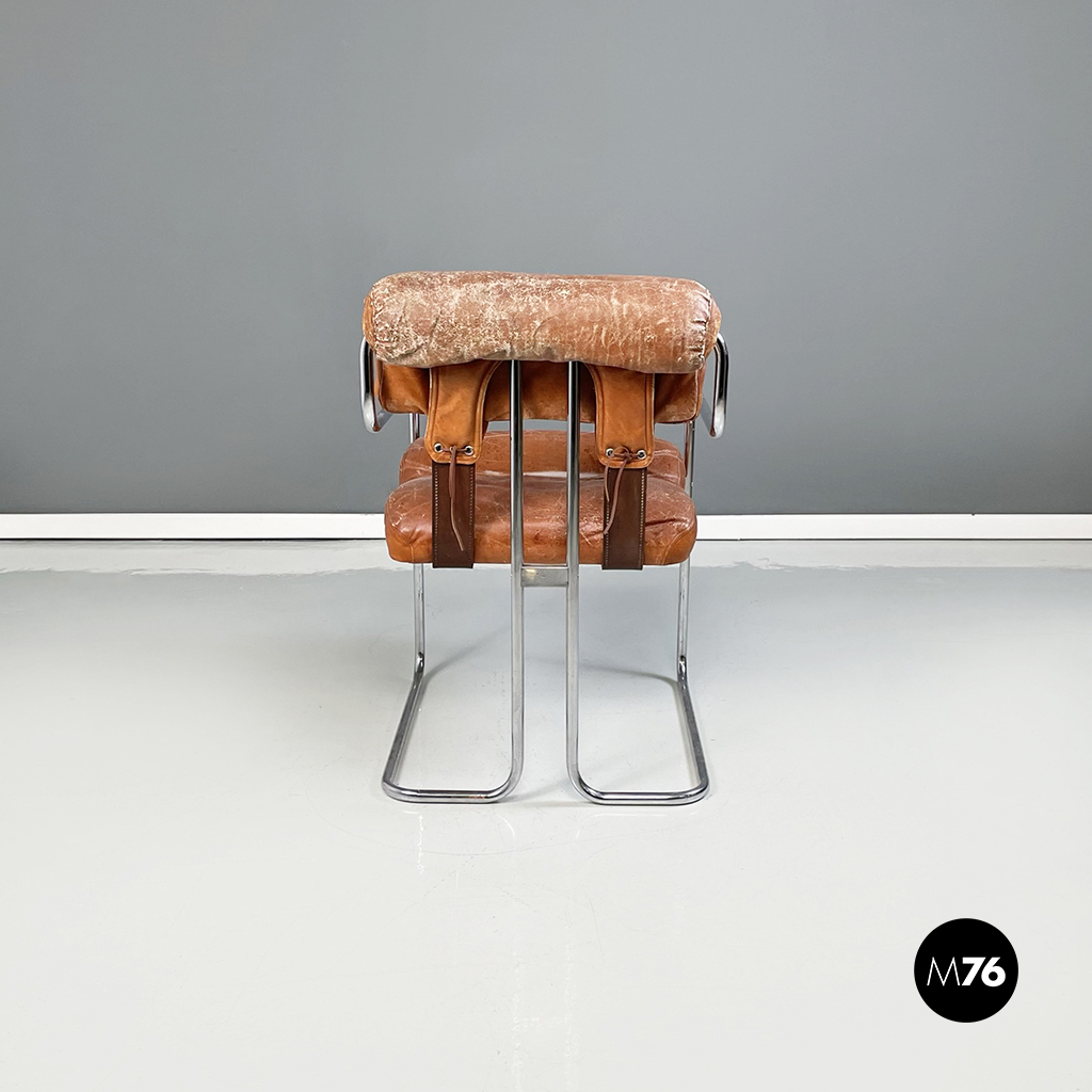 Sedia modello Tucroma con seduta imbottita e rivestita in pelle marrone. Lo schienale è composto da un cuscino imbottito e rivestito in pelle marrone e da fasce di cuoio. La struttura è in tondino di acciaio.