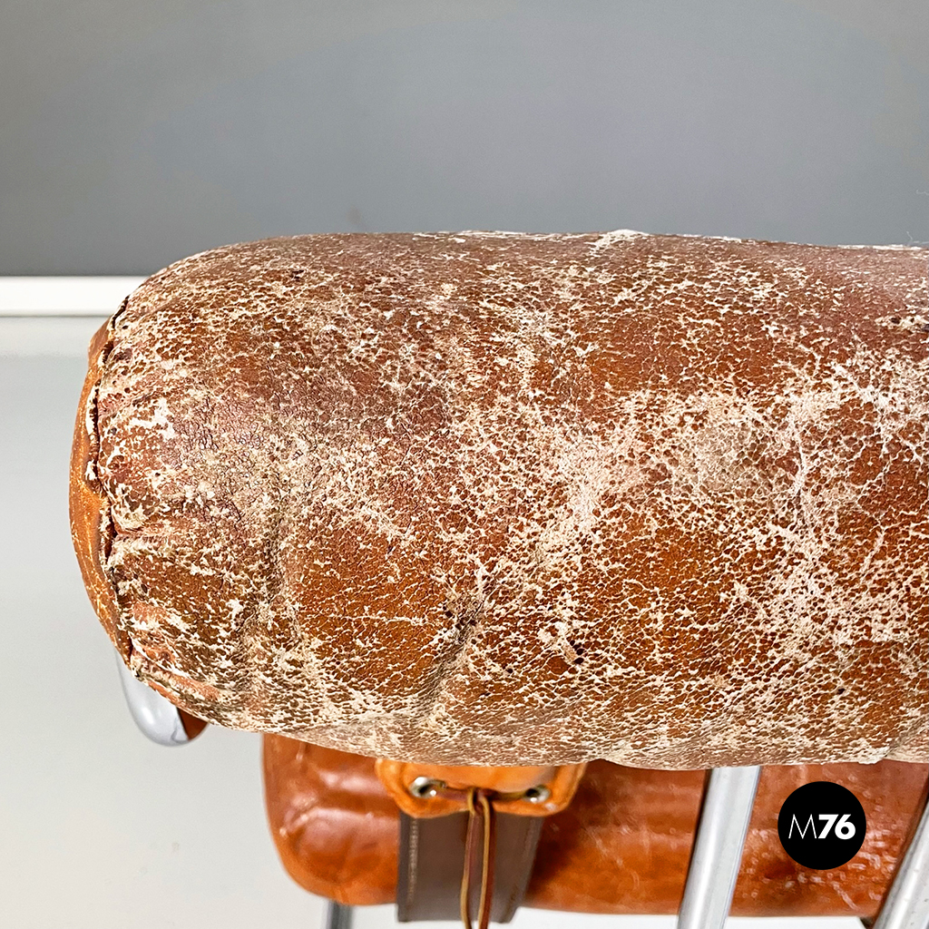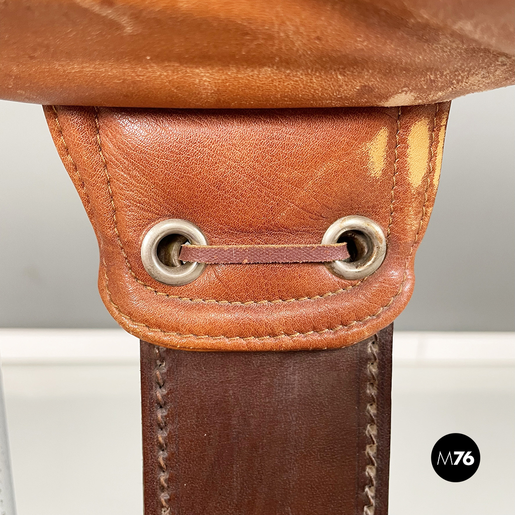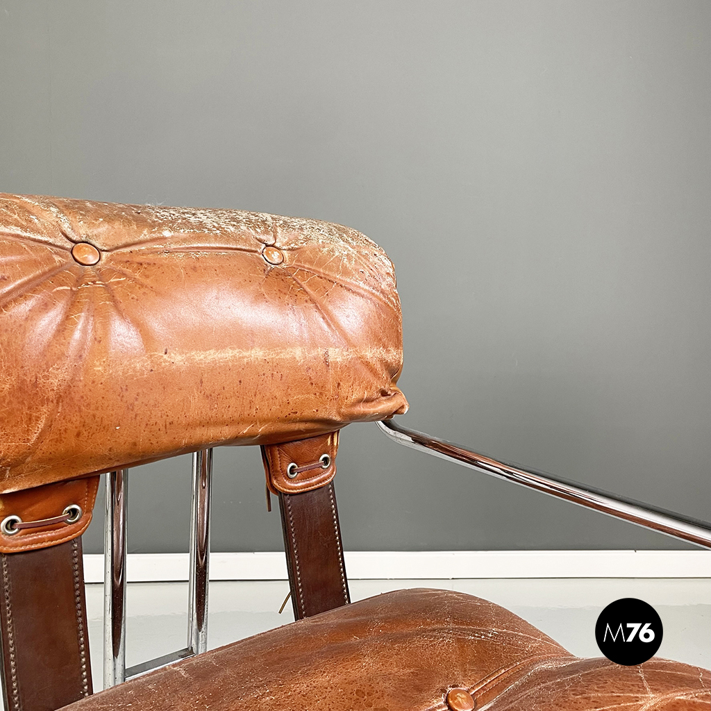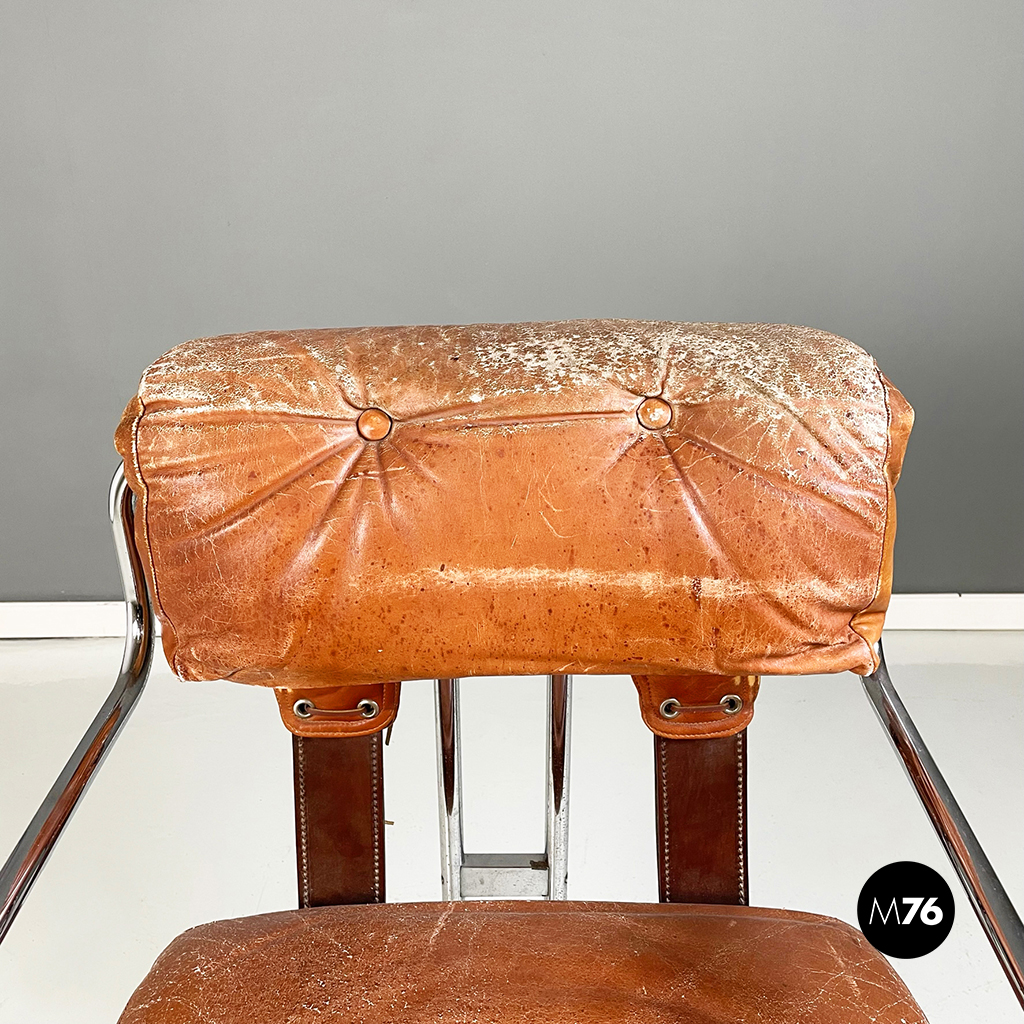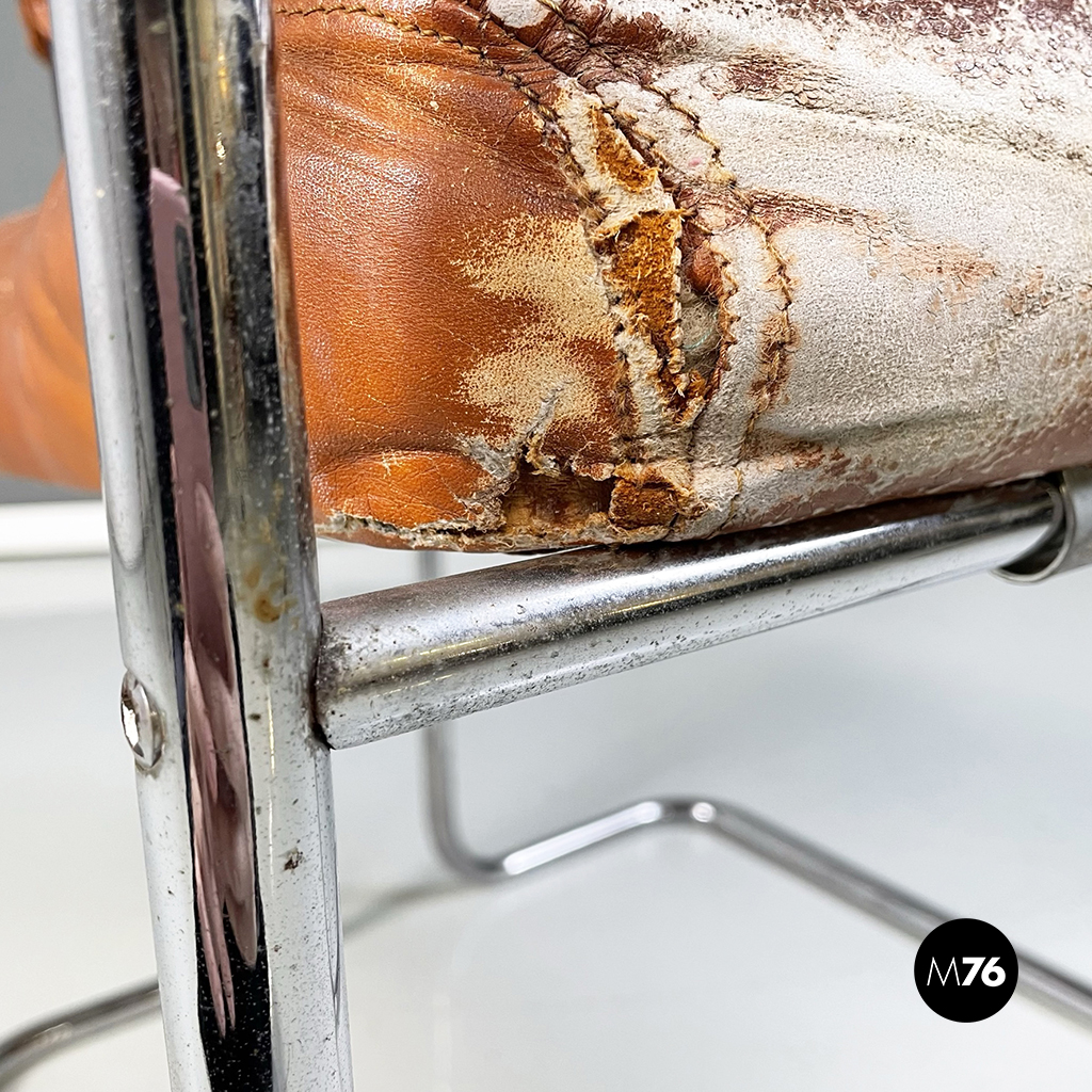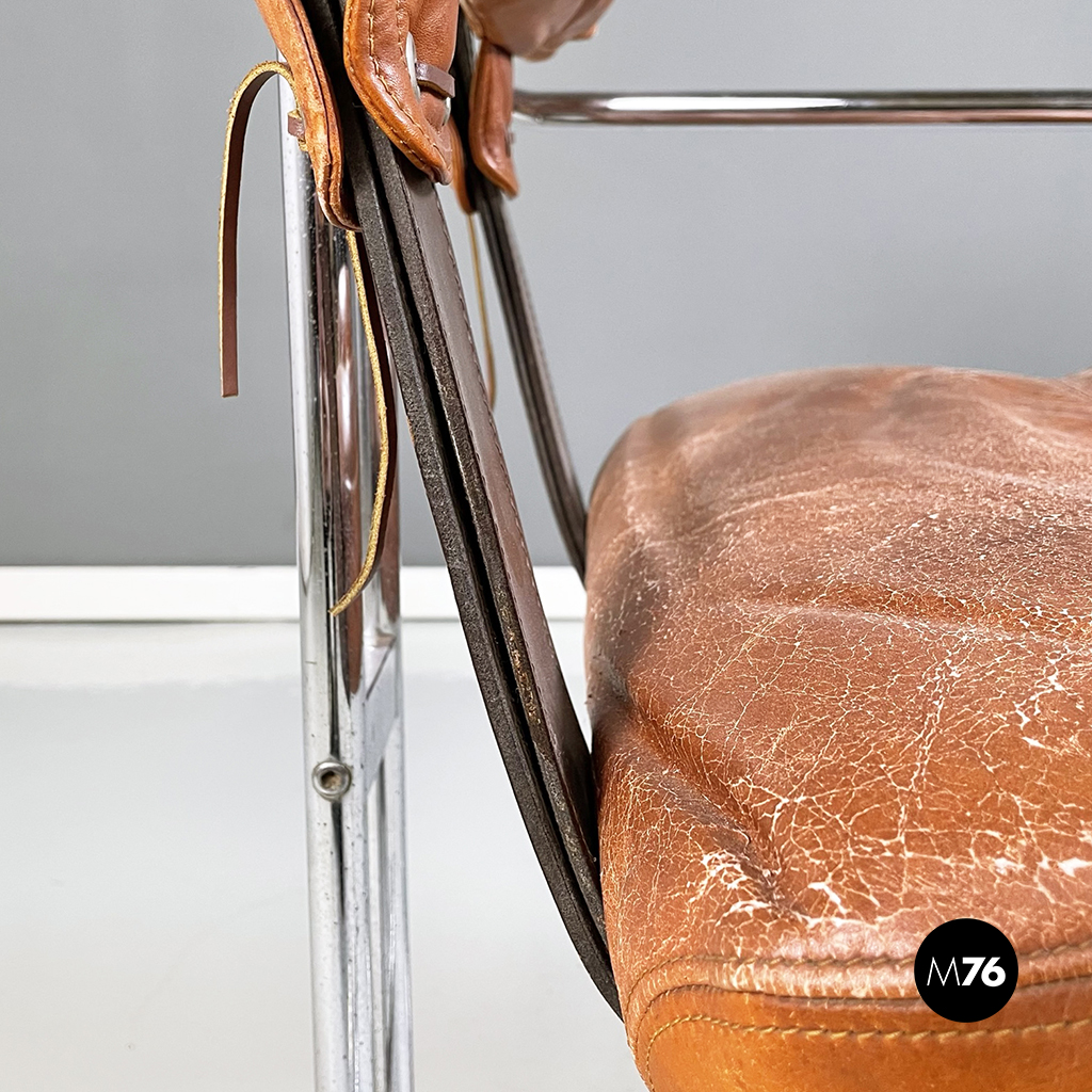 Sedia modello Tucroma con seduta imbottita e rivestita in pelle marrone. Lo schienale è composto da un cuscino imbottito e rivestito in pelle marrone e da fasce di cuoio. La struttura è in tondino di acciaio.