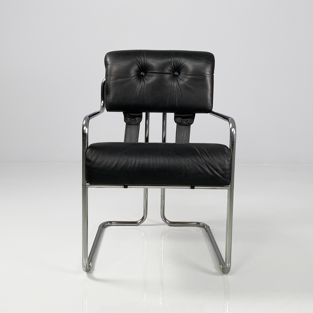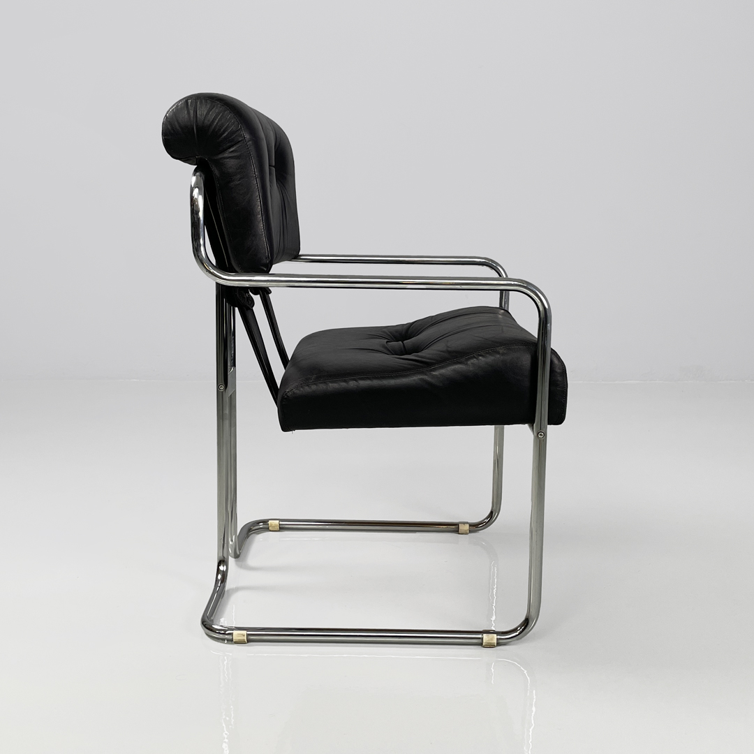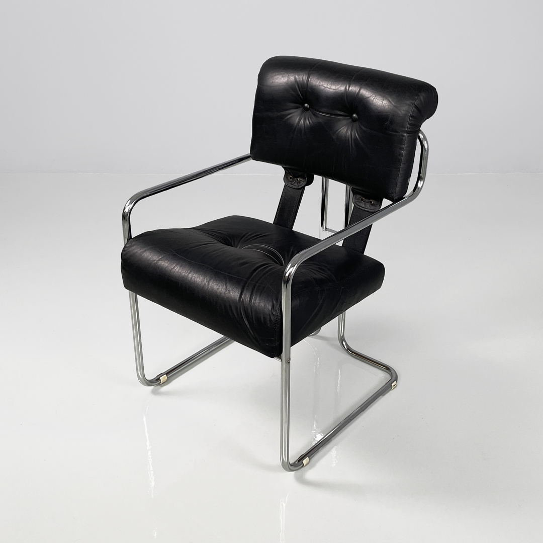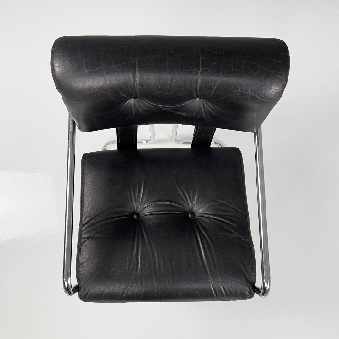 Sedia o poltrona di piccole dimensioni mod. Tucroma in pelle nera. La struttura della poltroncina è interamente in tondino di metallo. Lo schienale e la seduta sono imbottiti.