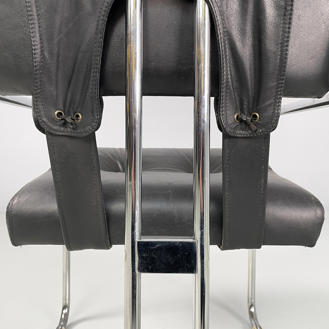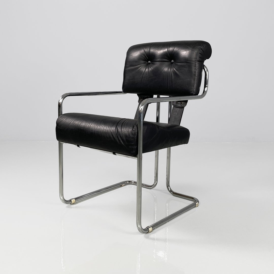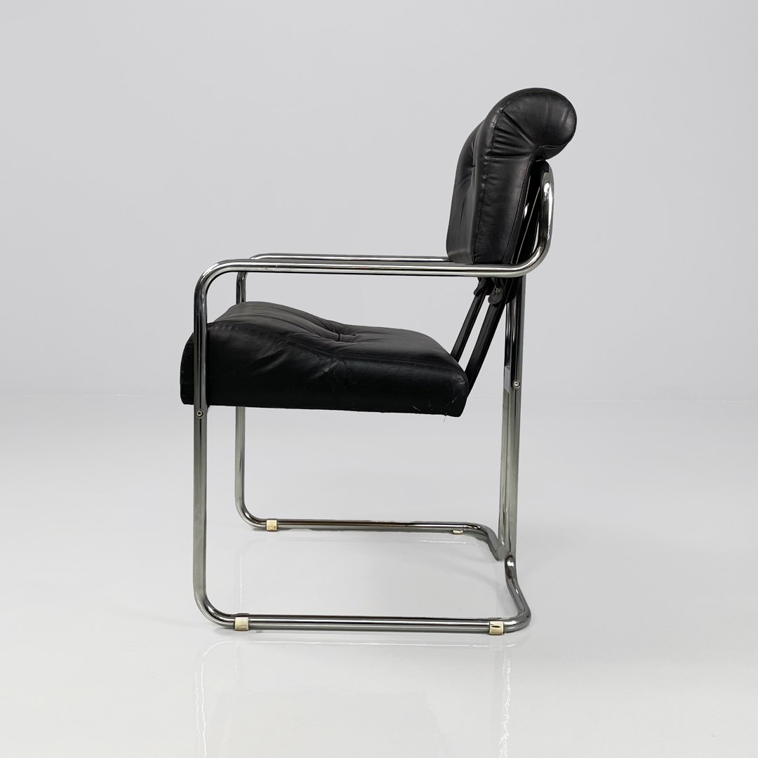 Sedia o poltrona di piccole dimensioni mod. Tucroma in pelle nera. La struttura della poltroncina è interamente in tondino di metallo. Lo schienale e la seduta sono imbottiti.