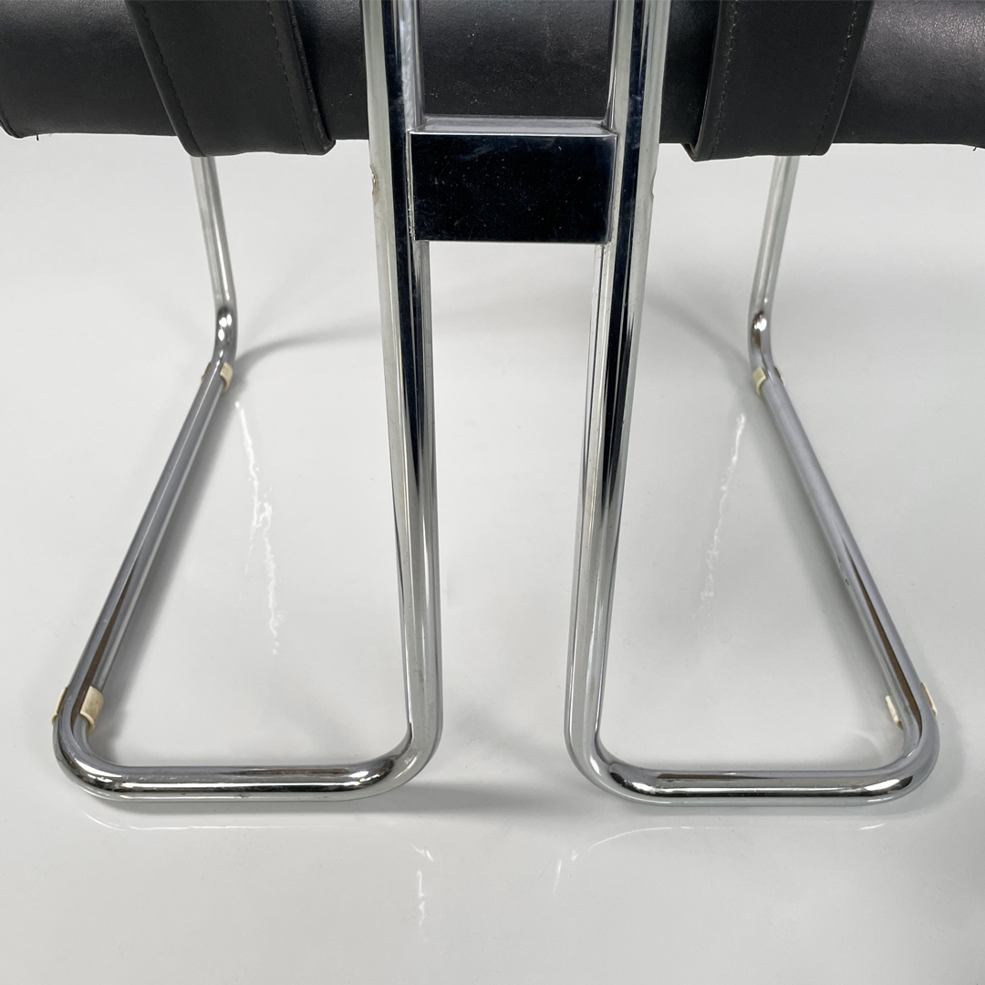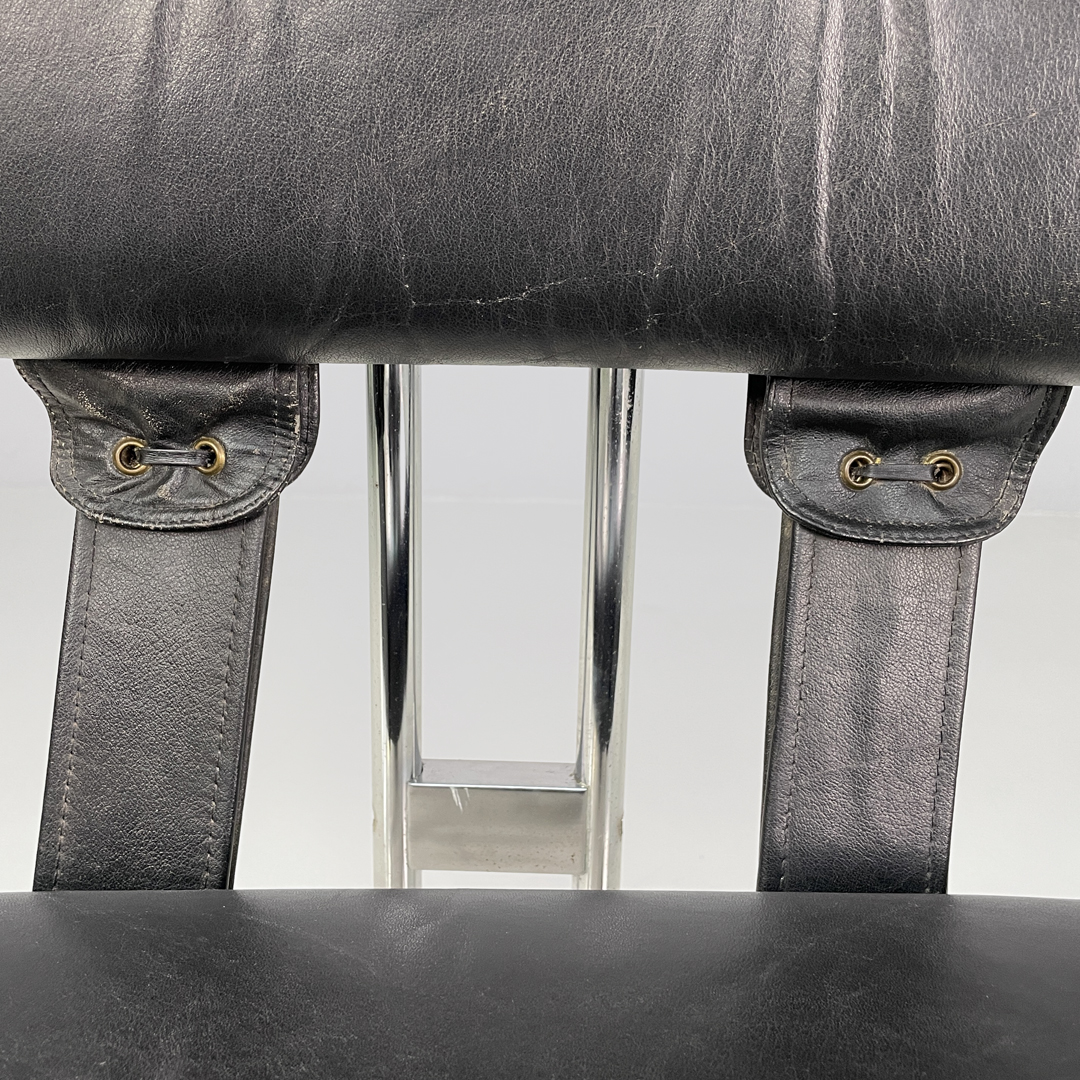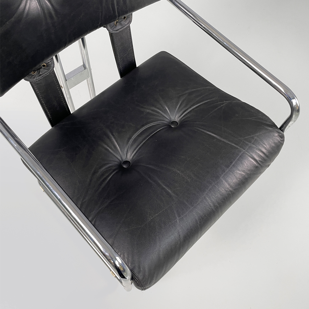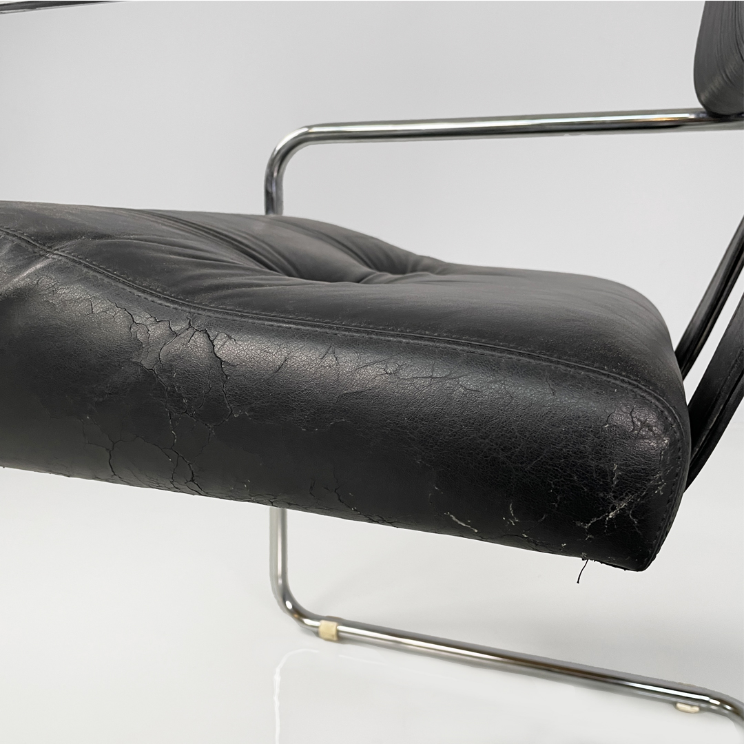 Sedia o poltrona di piccole dimensioni mod. Tucroma in pelle nera. La struttura della poltroncina è interamente in tondino di metallo. Lo schienale e la seduta sono imbottiti.