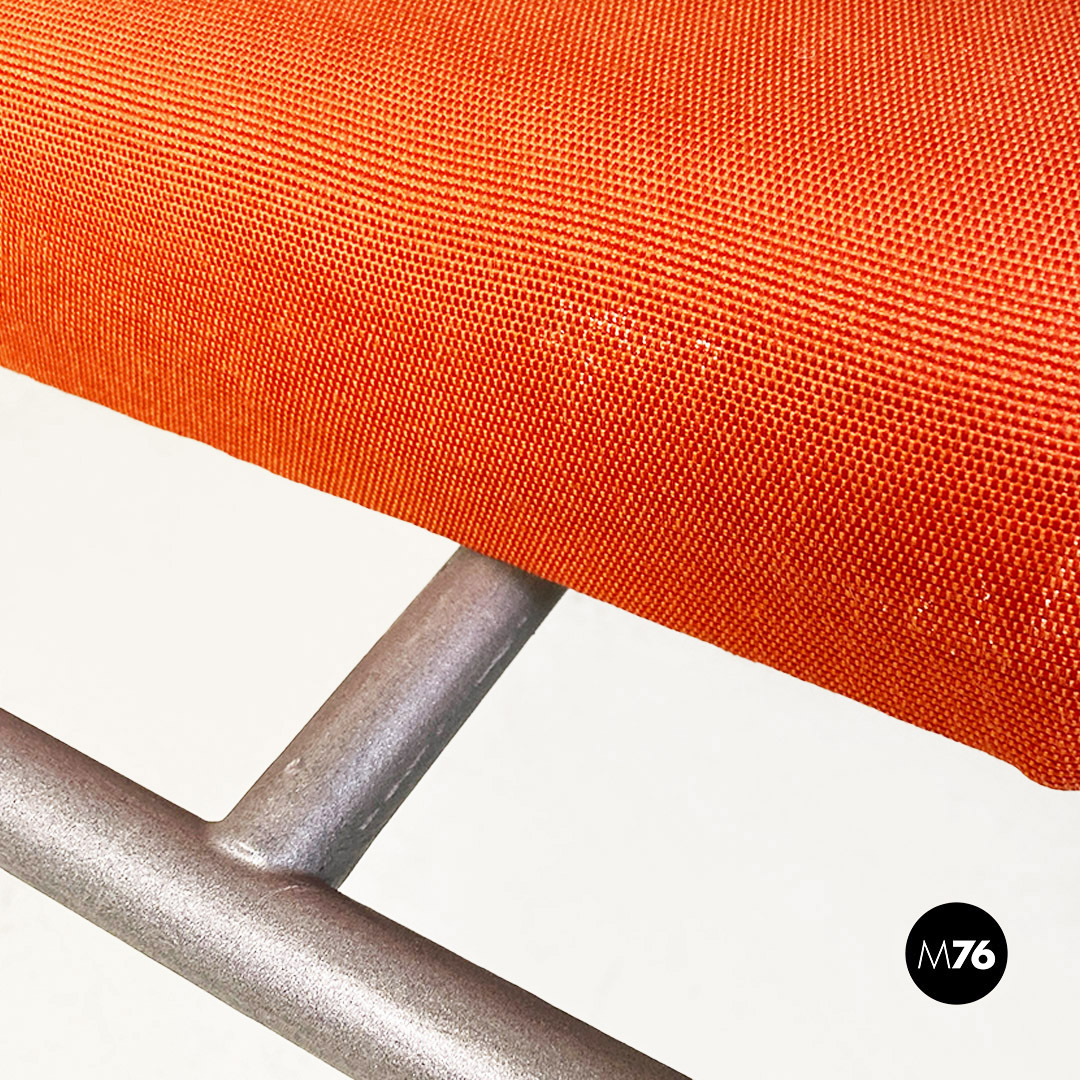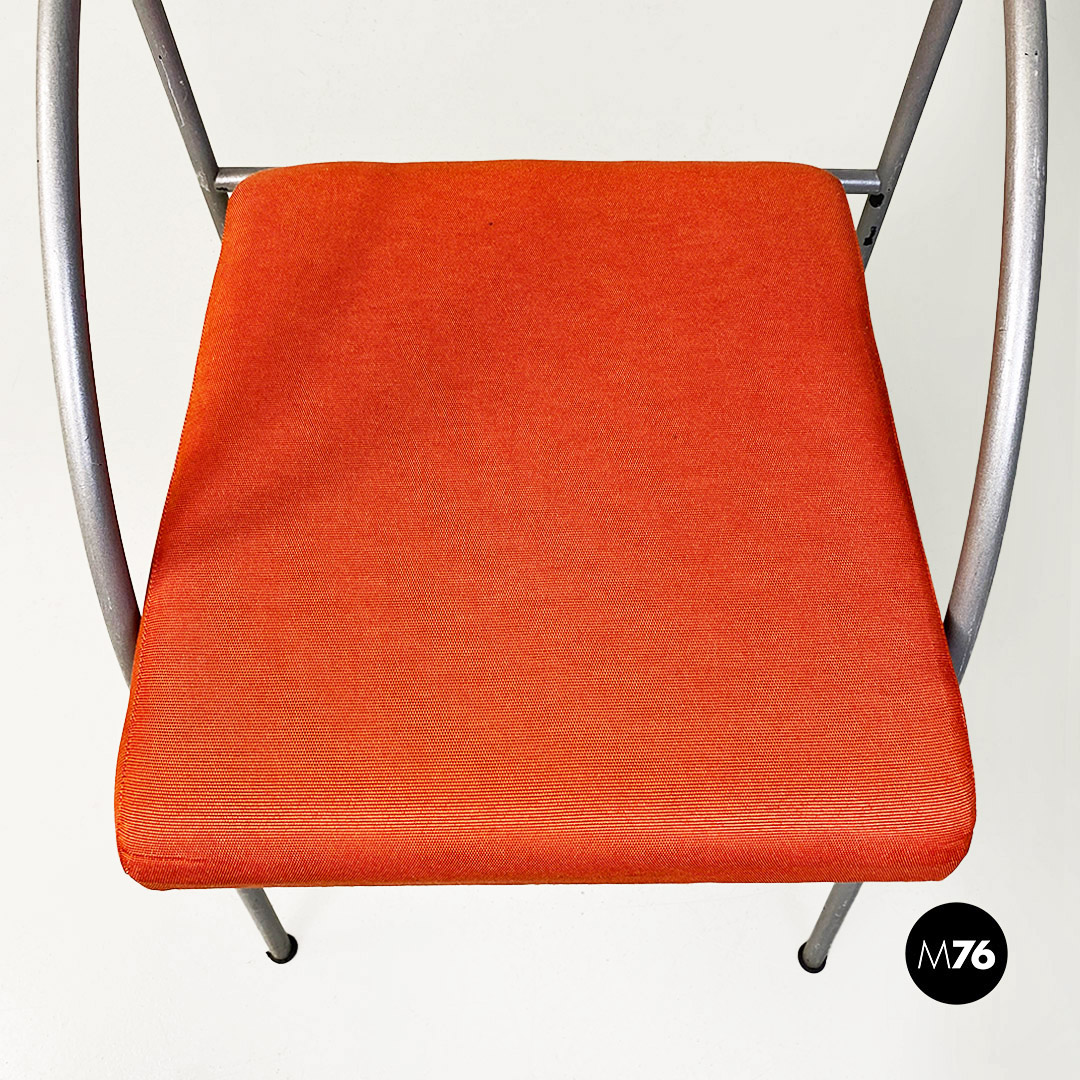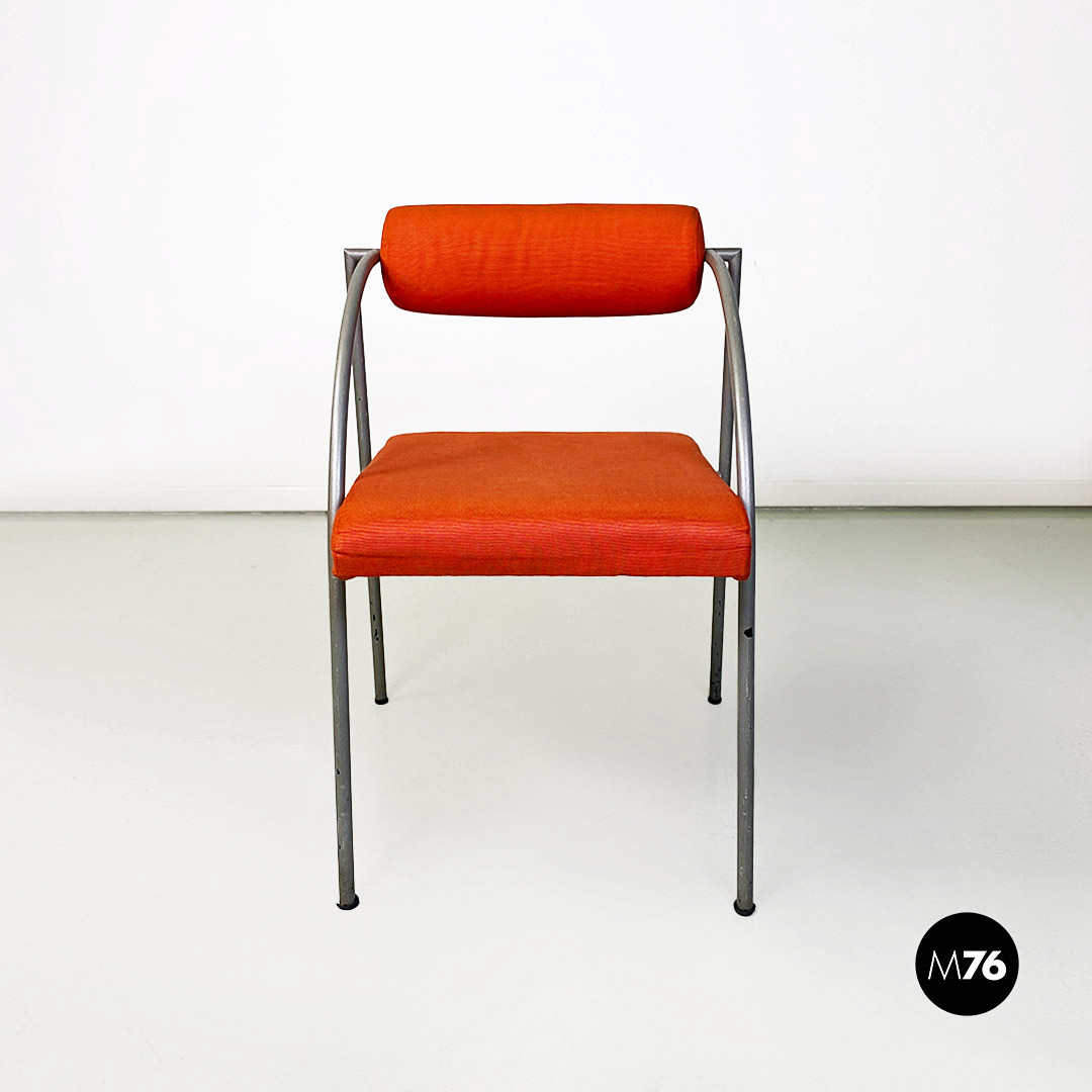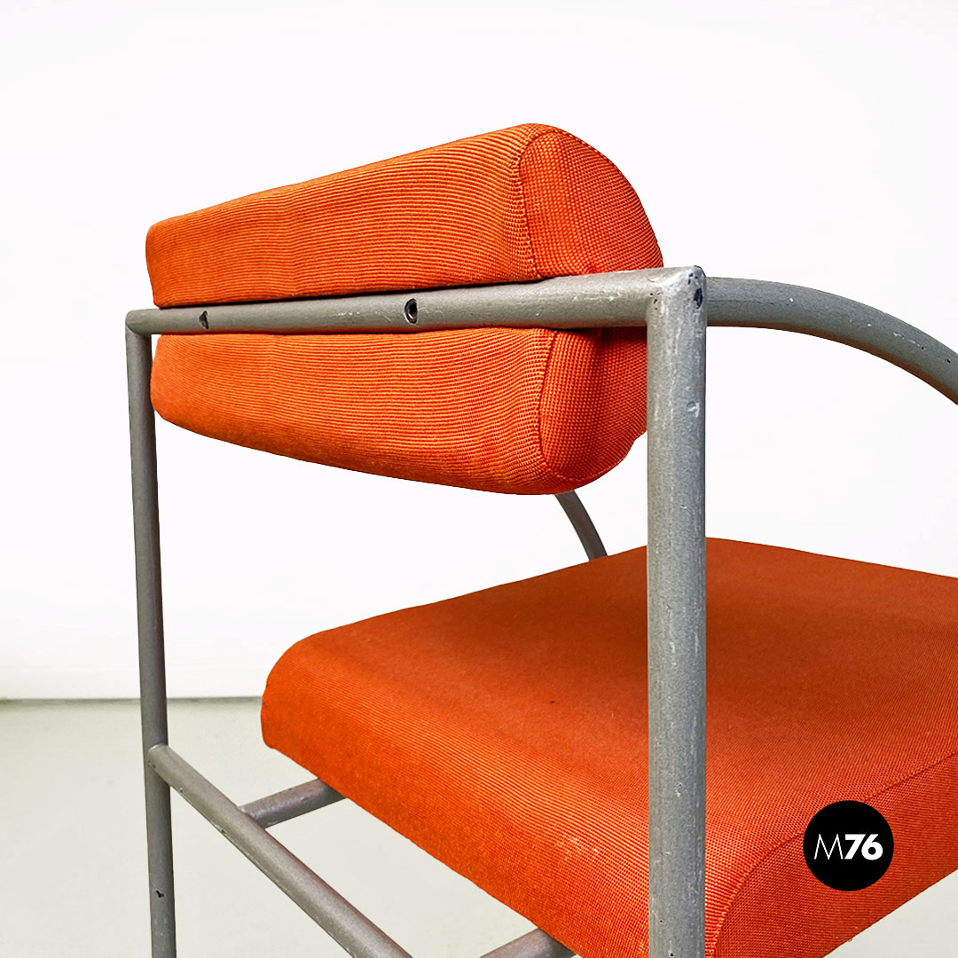 Sedia con braccioli modello Vienna con struttura in metallo a sezione tonda, con finitura grigio opaco. Lo schienale e seduta sono imbottiti e rivestiti nel loro originale tessuto di cotone arancio. Bracciolo da profilo curvo.